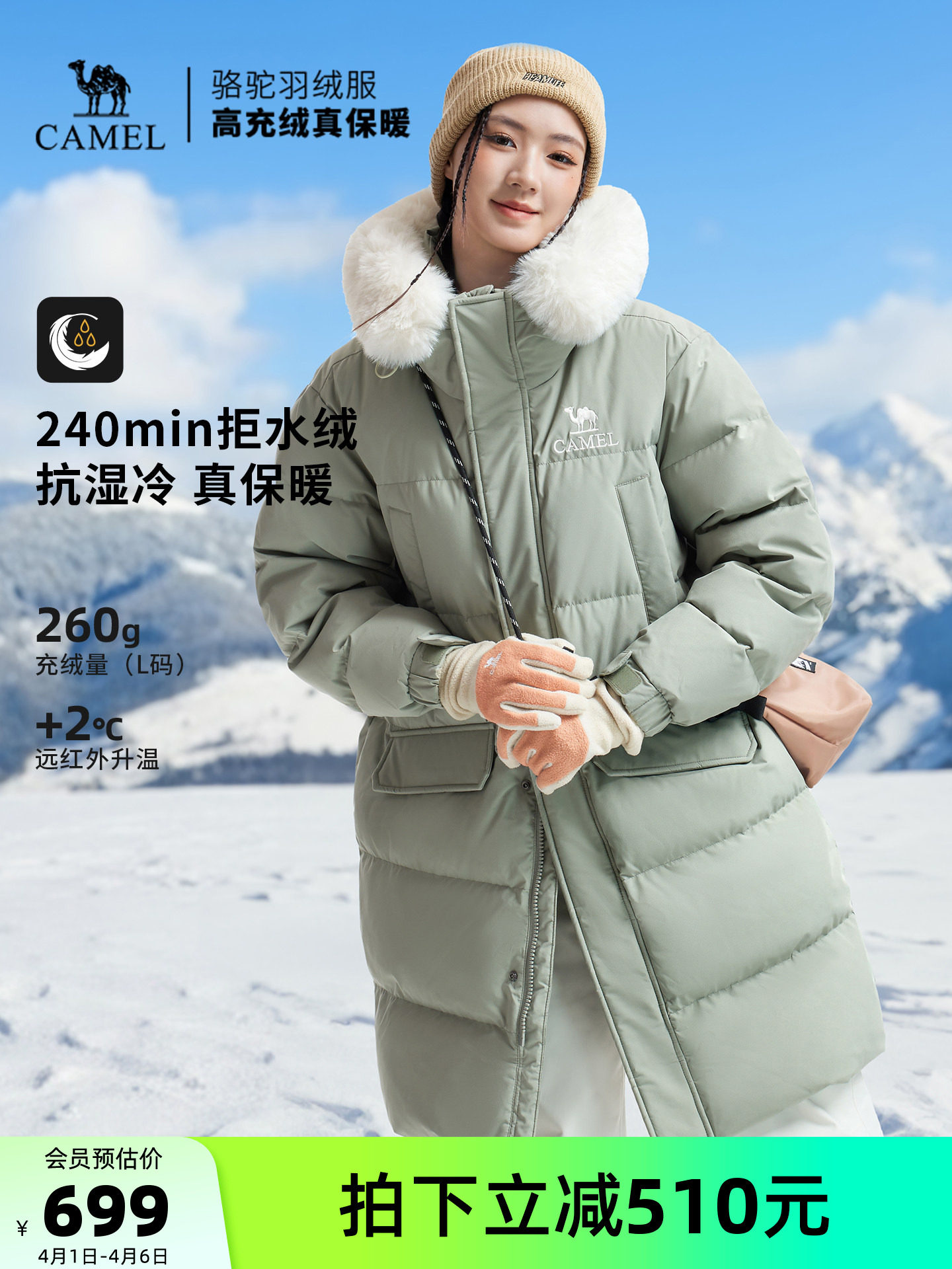 Camel Outdoor down Jacket Winter New Model for Men and Women, Mid-Length, Thickened, Far-Infrared Water-Repellent Down, Warm Puffer Jacket