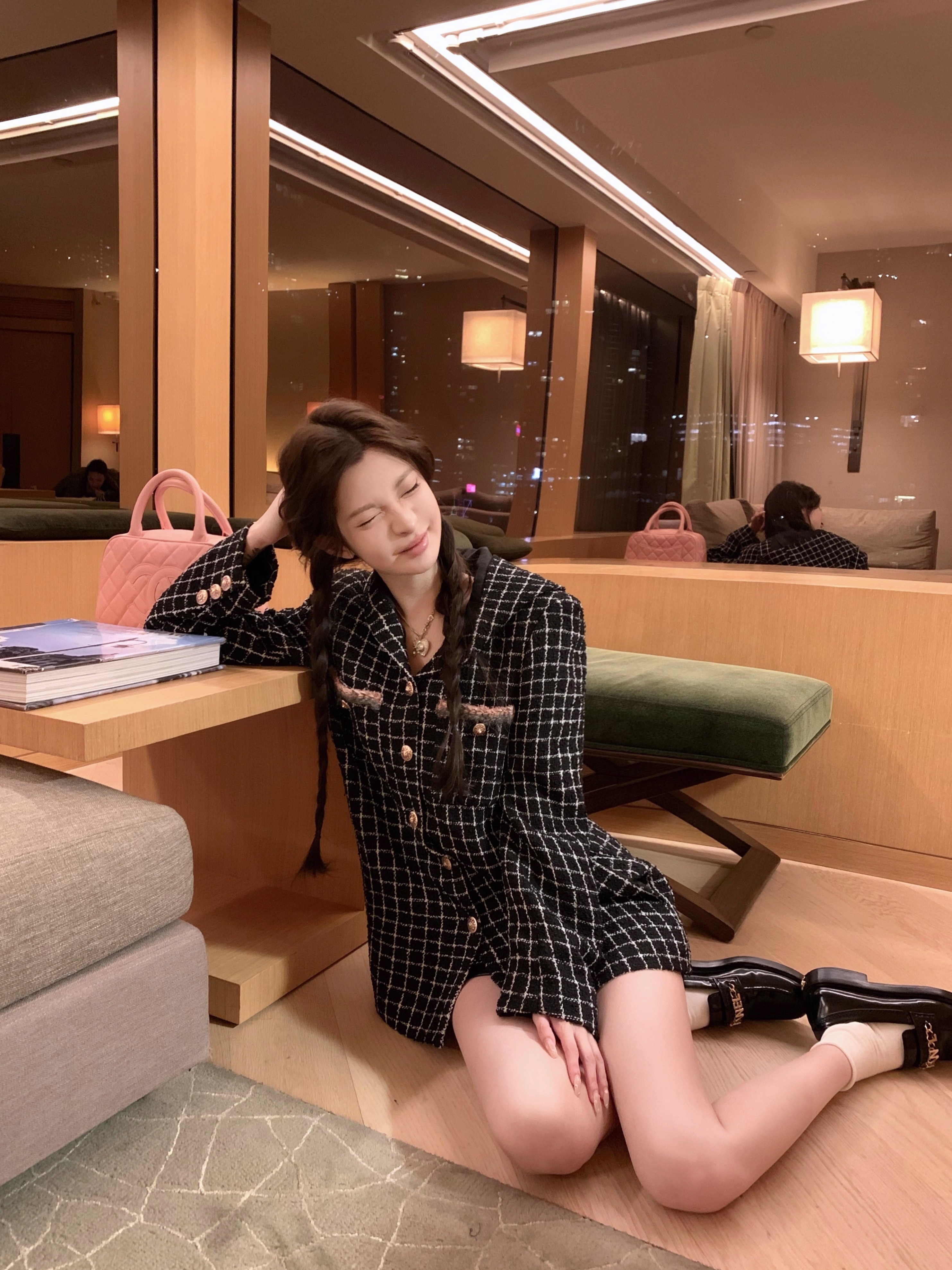 [Small Quantity in Stock] Chicyou Black Plaid Hooded Thin Tweed Versatile Chanel-Style Jacket for Women