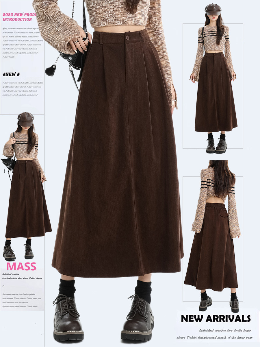 Mass Melard Coffee-Colored Corduroy High-Waisted A-Line Skirt for Women 2025 Autumn and Winter New Slimming Mid-Length Skirt