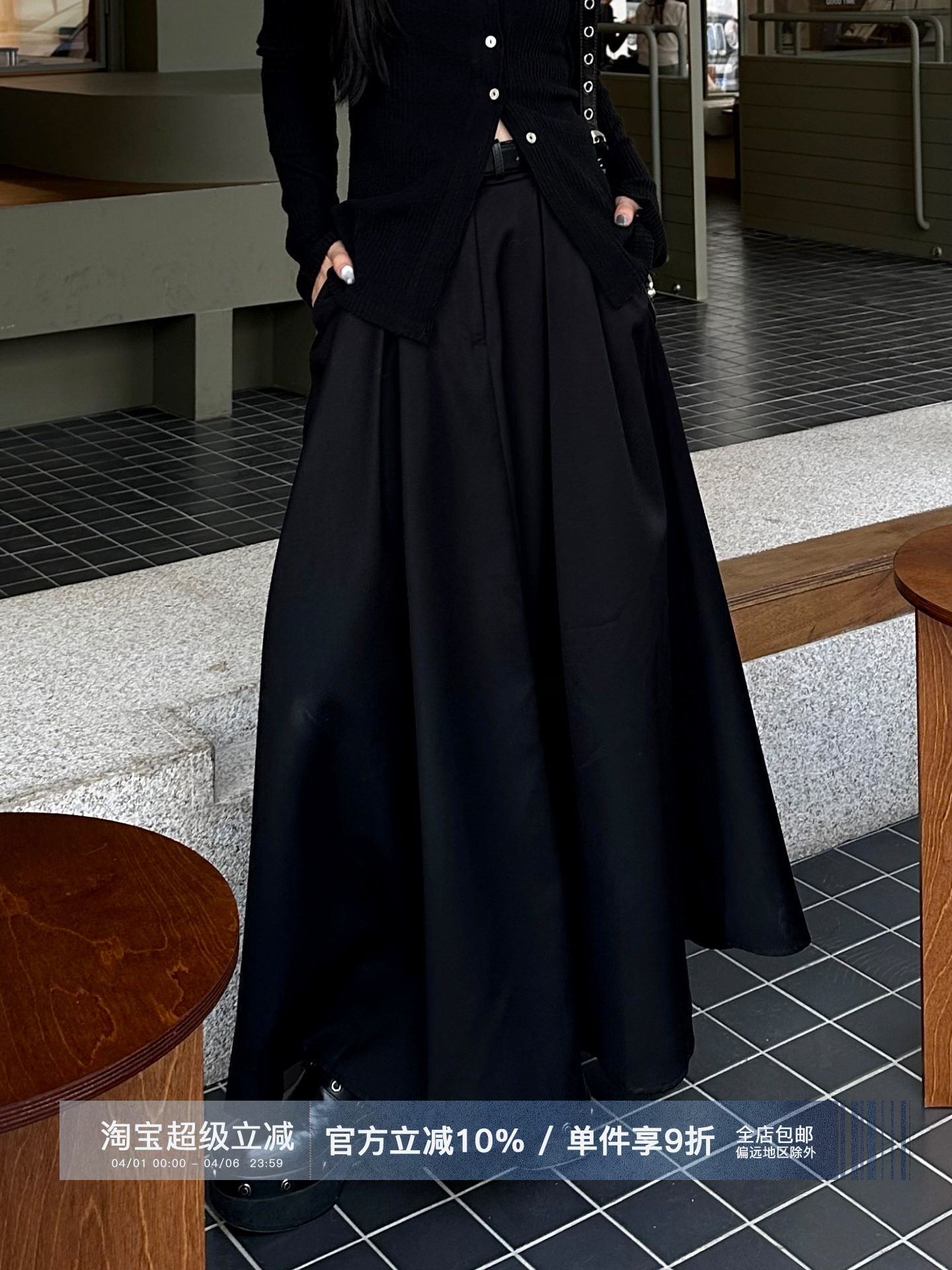 Dai Mao French Retro Black Midi Skirt for Women, Spring and Autumn, High-Waisted, Slimming, Mid-Length, Large Pleated Skirt, A-Line Umbrella Skirt