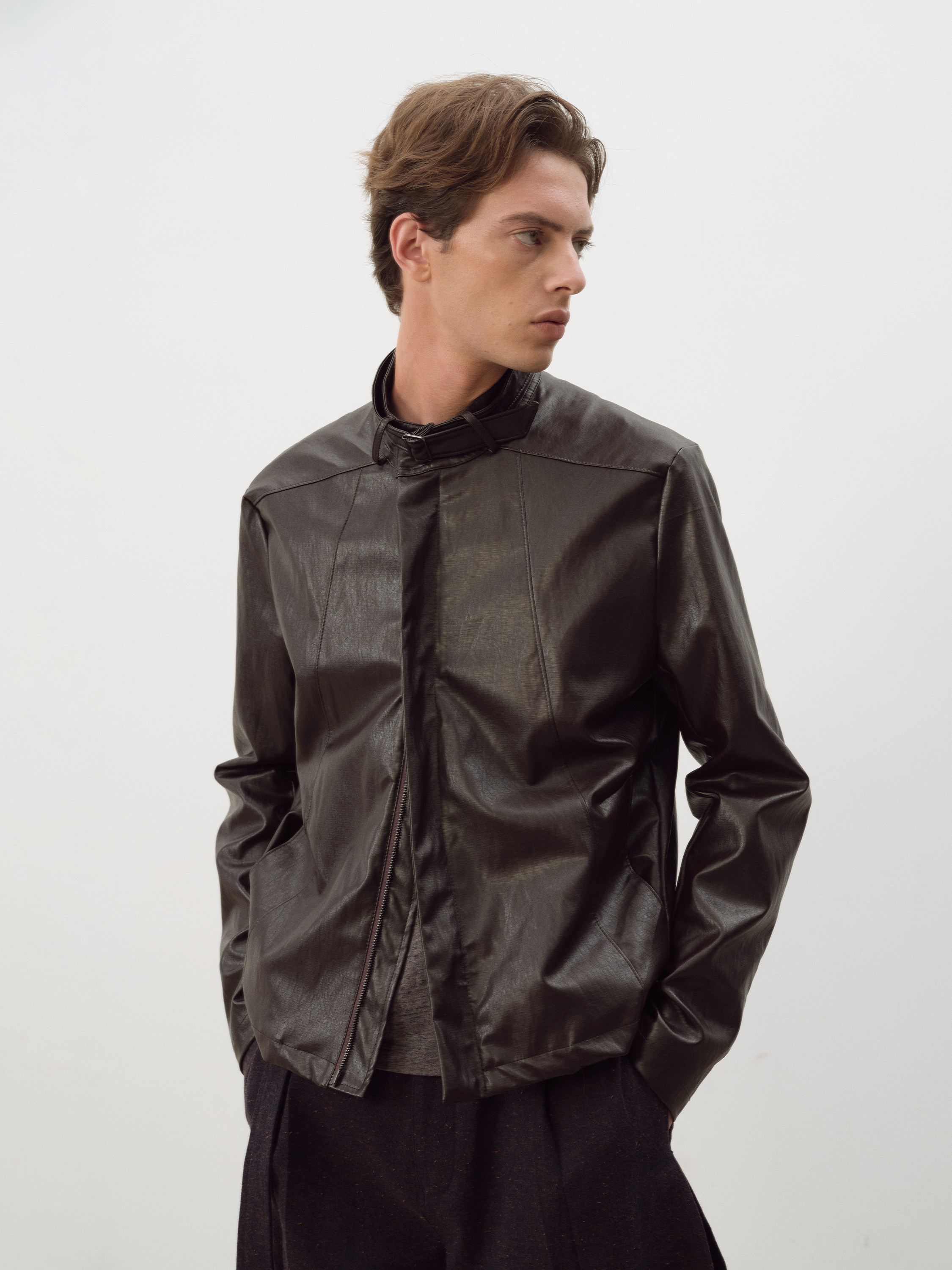 Not Ugly 25Aw Silver Ring Metal Wire Stand Collar Segmented Three-Dimensional Reddish Brown Leather Vintage Jacket