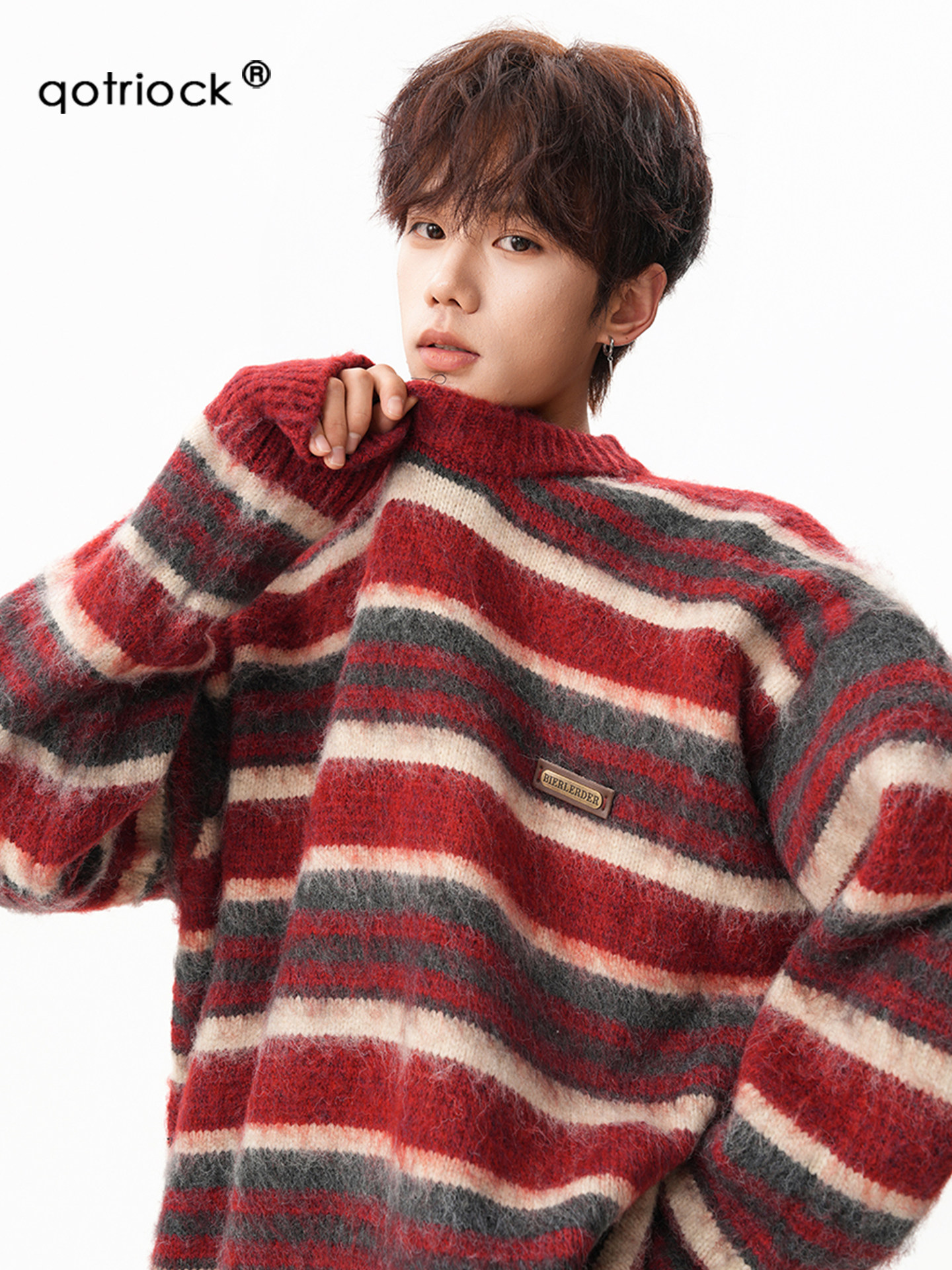 American-Style Mohair Striped Color-Blocked Crew Neck Sweater for Men and Women, Autumn and Winter Lazy Style Knitted Sweater, Christmas Red Coat