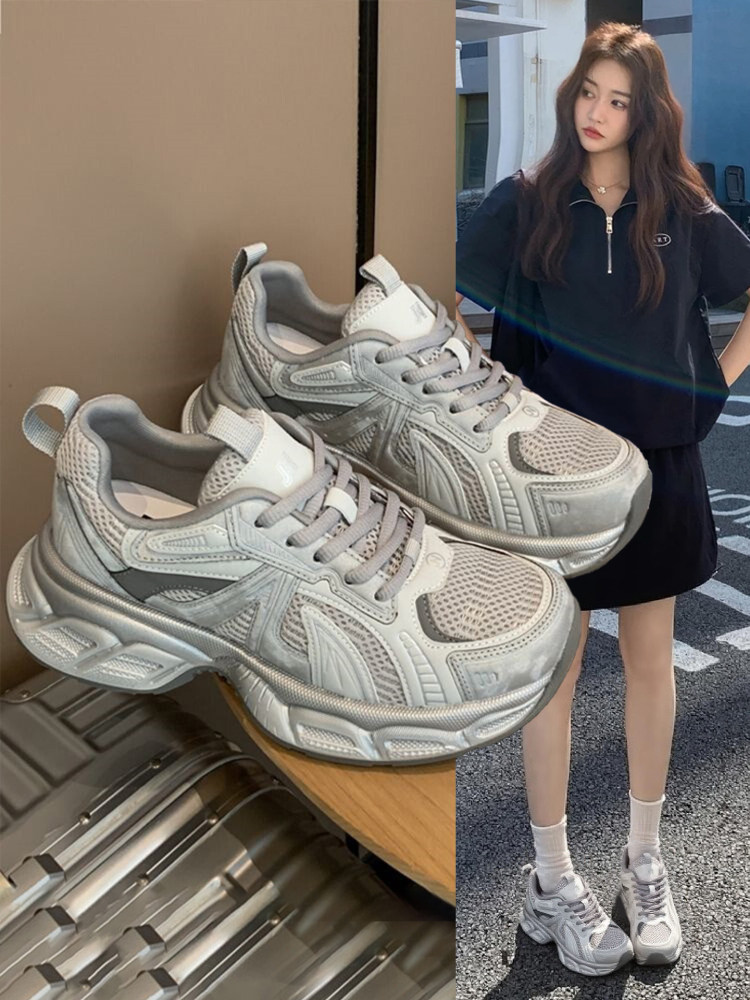 Hong Kong Genuine Leather Dad Shoes for Women 2026 Spring Versatile Breathable Mesh Platform Lightweight Thick-Soled Casual Sneakers