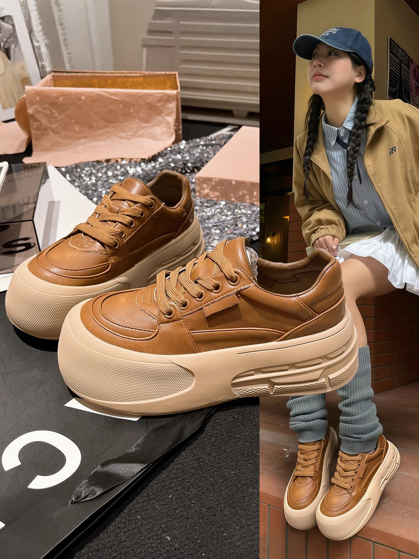Hong Kong Genuine Leather Lace-Up Platform Shoes for Women, 2026 Spring New Versatile Height-Increasing Sports Casual Sneakers
