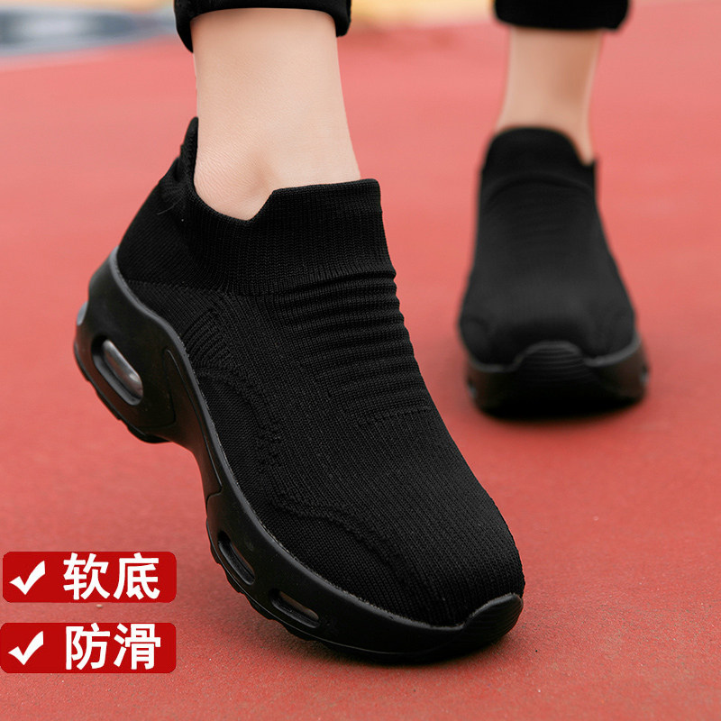 Black Work Shoes for Women, Autumn Thick-Soled Height-Increasing Non-Slip Mom Socks Shoes, Soft-Soled Slip-On Air-Cushion Sneakers