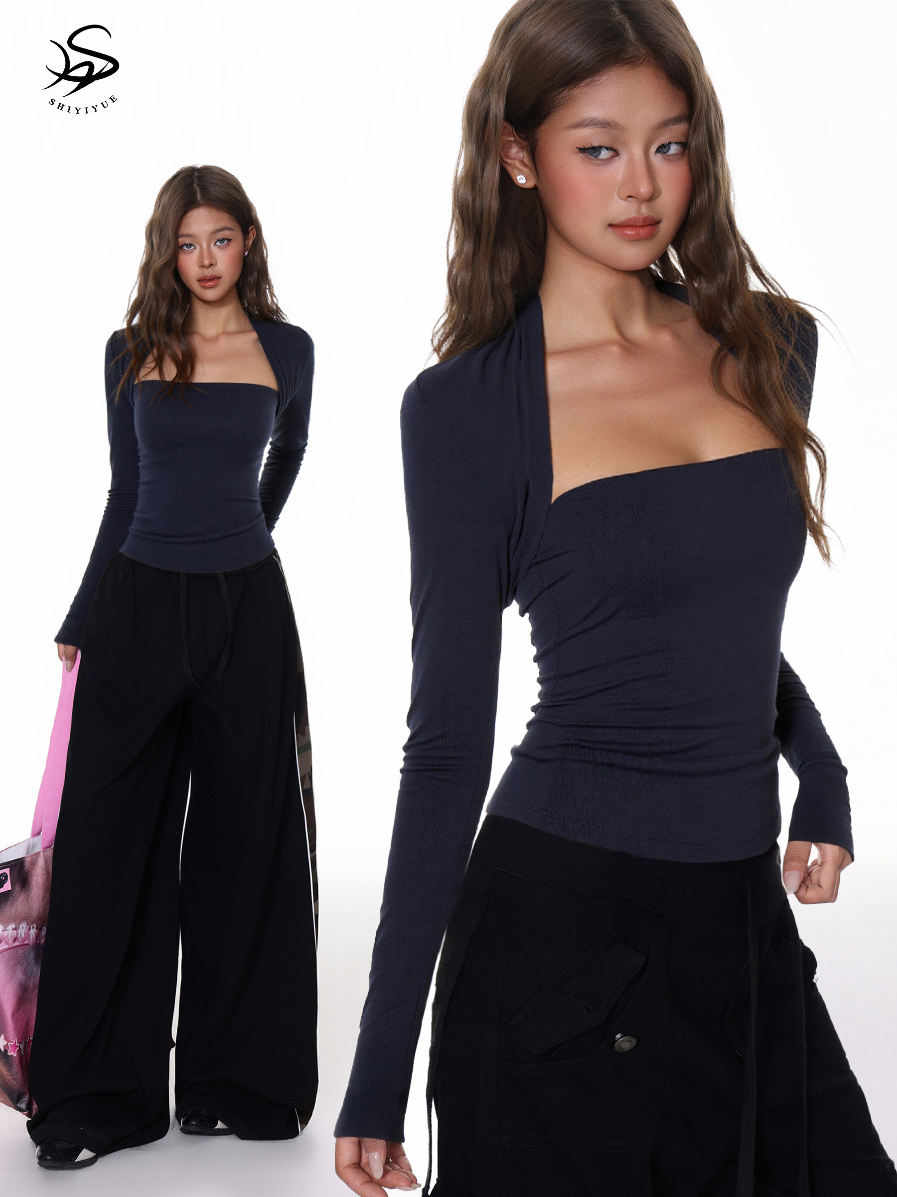 Shiyiyu Slim-Fit Solid Color Design Square-Neck Top for Women, Autumn Waist-Cinching, Tight-Fitting, Slimming Inner Layer Long-Sleeve Top