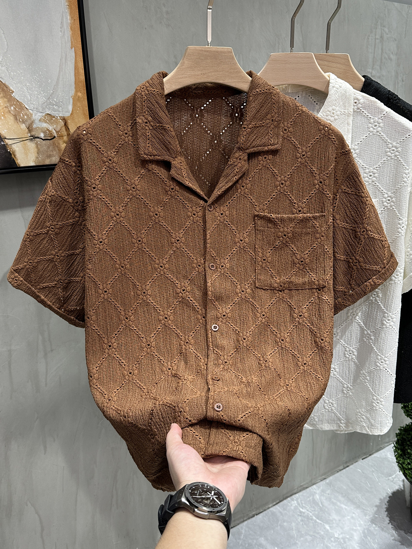 Cuban Collar Hollow-Out Vintage High-End Short-Sleeve Shirt for Men, Summer High Street Cool Shirt with a Sense of Design, Half-Sleeve