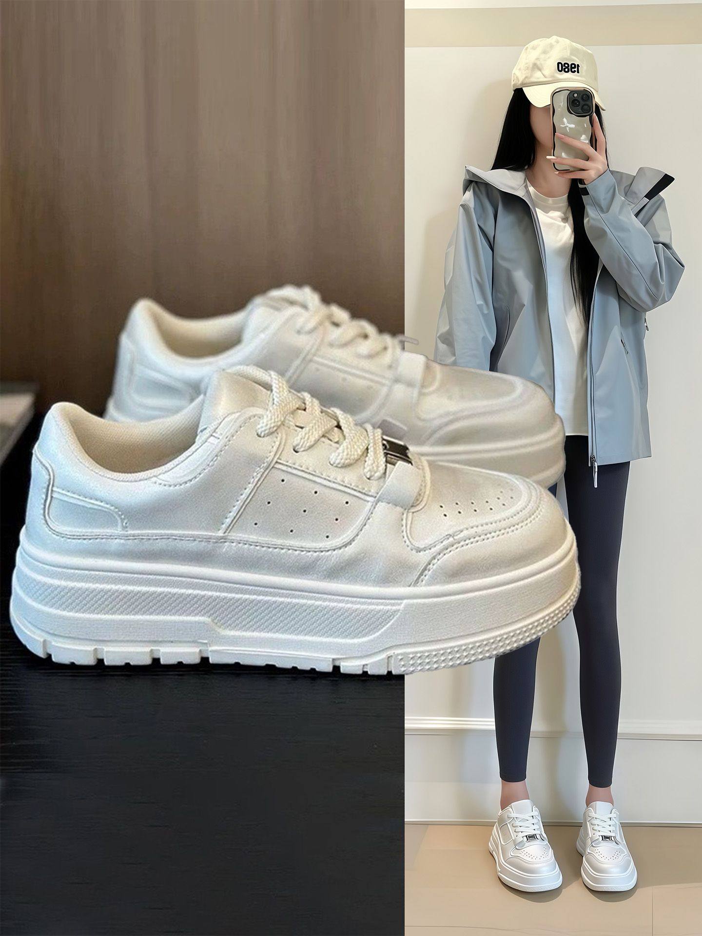 Italy Sanli~ Thick-Soled Pearlescent Buckle Genuine Leather White Sneakers for Women, New Casual Height-Increasing Lace-Up Distressed Sneakers