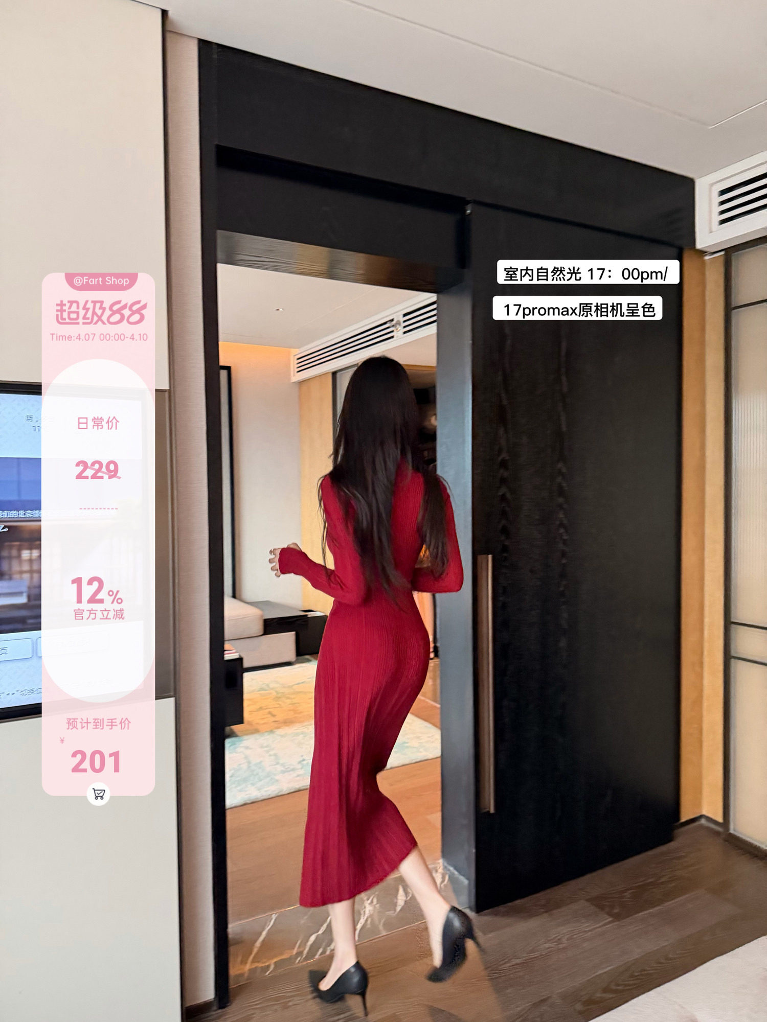 【Fart Shop】Oriental Iris Textured Hollow Slim Fit Autumn and Winter Christmas Red Bodycon Dress
