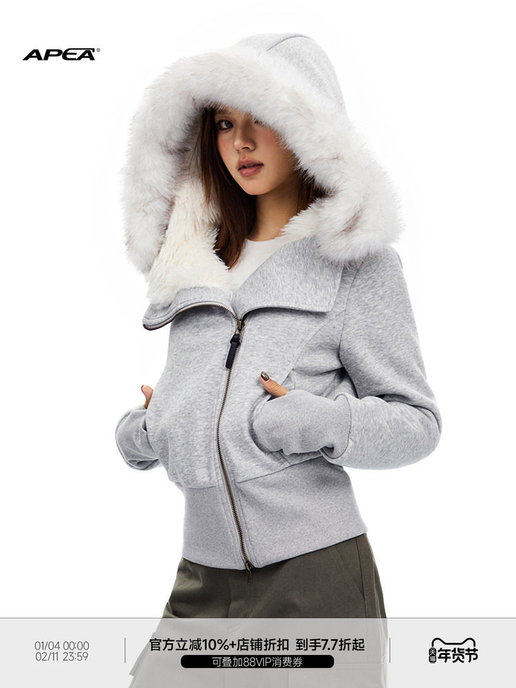 Apea American-Style Diagonal Placket Plush Lining Fur Collar Cotton Jacket Winter Short Slim Fit Hooded Cardigan Sweatshirt