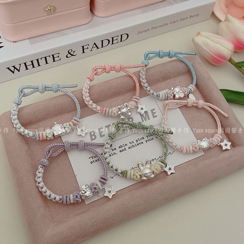 Pure Silver 999 Peach Blossom Knot Bracelet, Pure Silver Kitty Kirby Star Bracelet, Hand-Woven Rope, Gift for Children and Girlfriends
