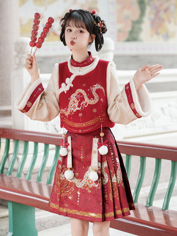Original Chinese Brand Lingshen Xiancai (Snake Bringing Wealth) Chinese-Style Short Vest with Han Elements Mamian Skirt New Year Red Greeting Dress