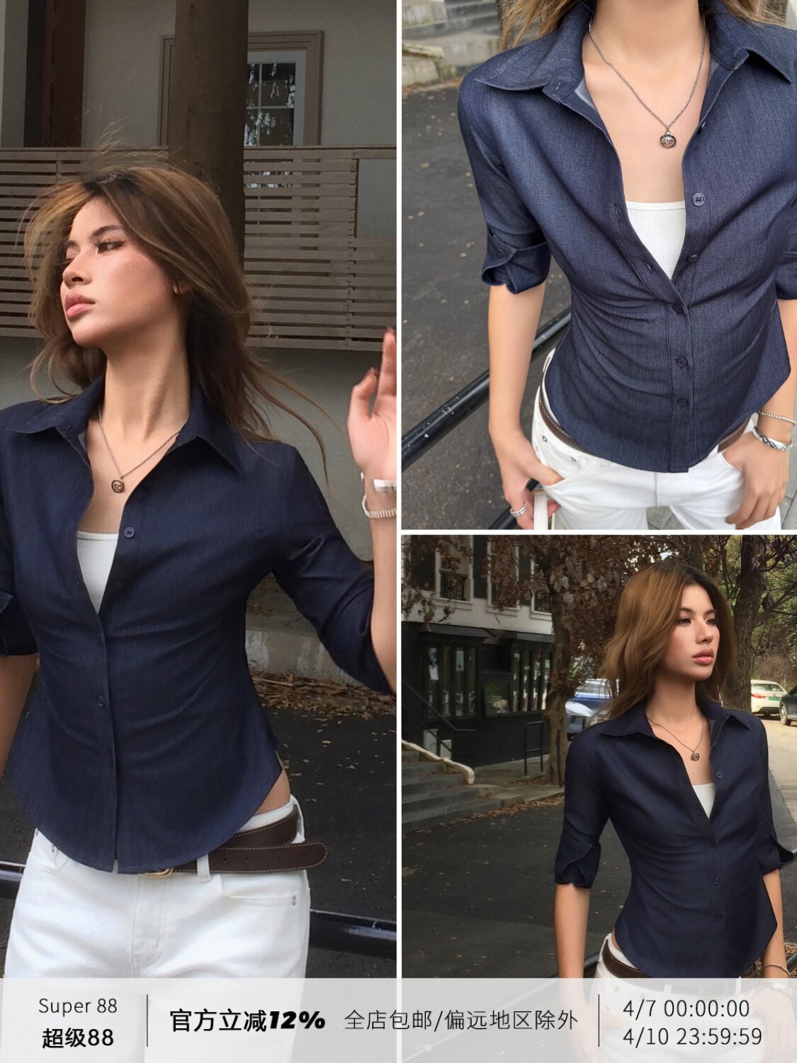 Audwyn Faux Denim Mid-Sleeve Slim-Fit Shirt, New Autumn Style for Trendy Girls, Slightly Elastic, Waist-Cinching, Slimming, Front Long and Back Short Top