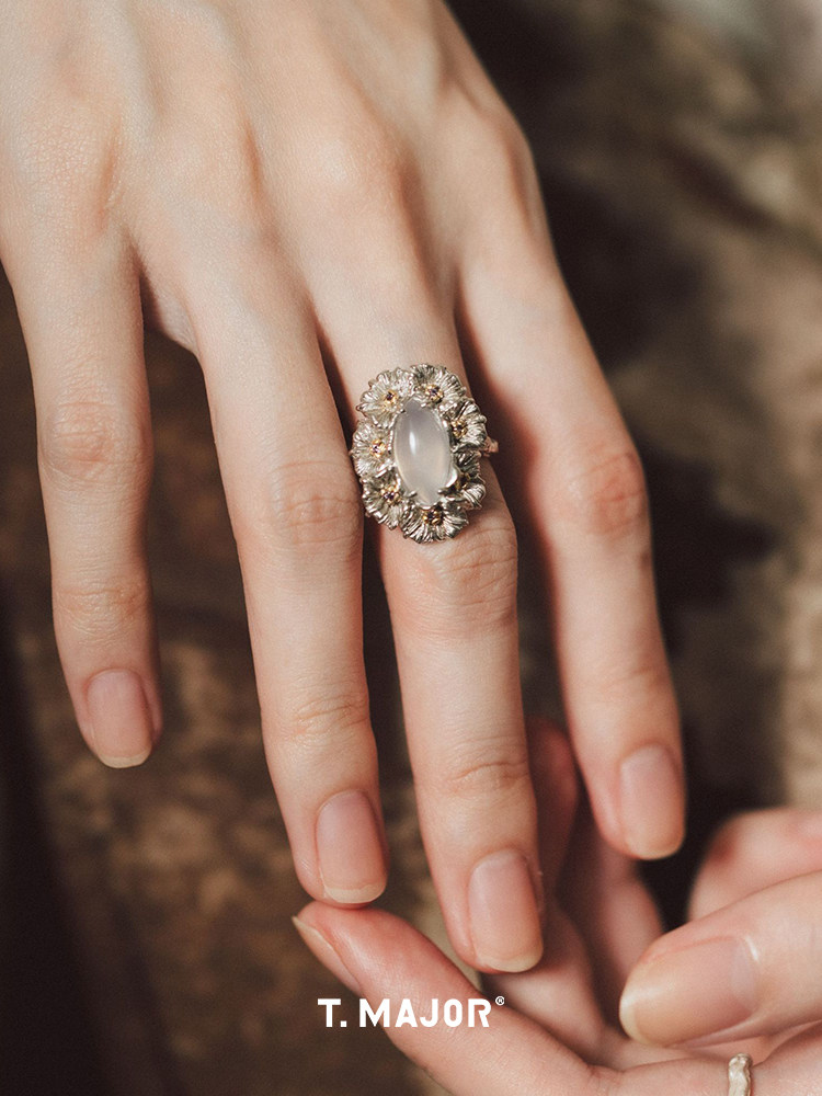 Dare Buyer Store T.Major Horse Eye White Agate Blooming Mandala Flower Open Ring 925 Silver Vintage Style