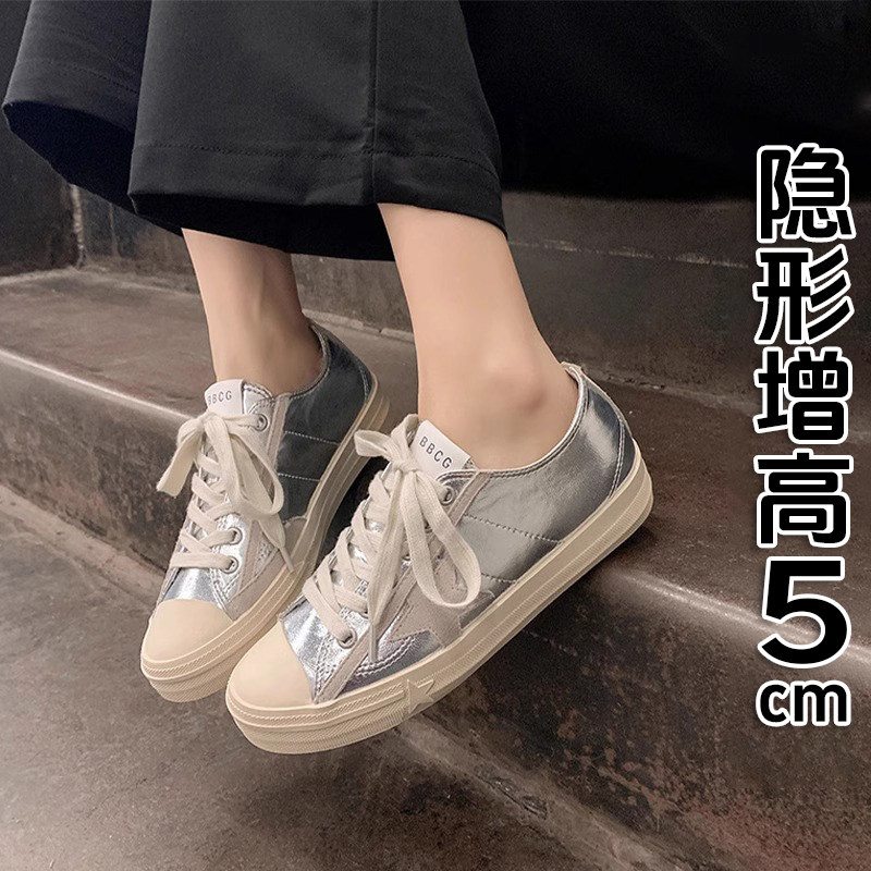 Hong Kong Style Height-Increasing White Sneakers for Women, Silver Star Distressed Comfortable Dirty Shoes, Thick-Soled Versatile Casual Sports Sneakers