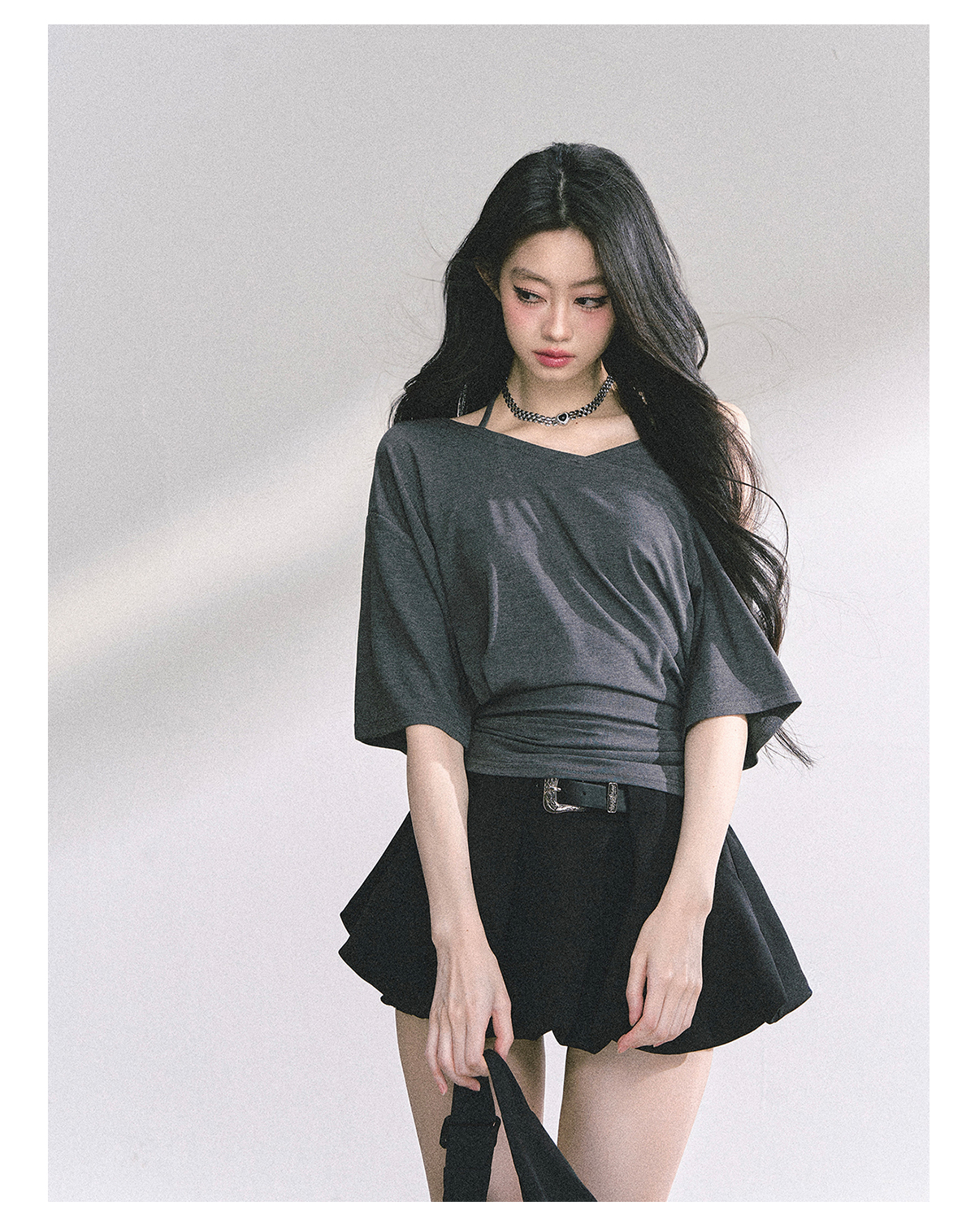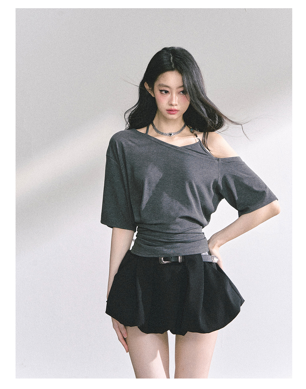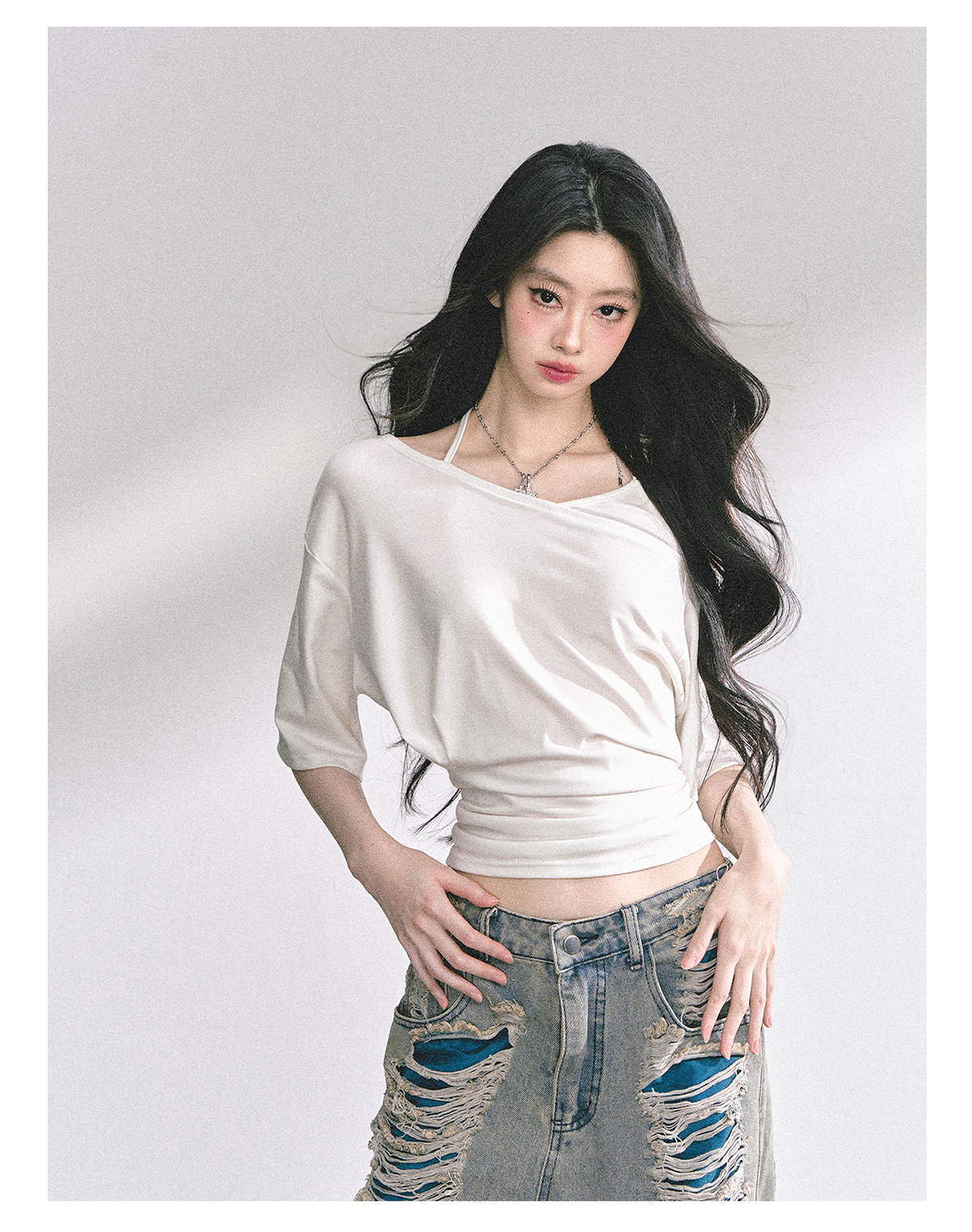 Young and Smart, Relaxed Style % Korean-Style Off-Shoulder Short-Sleeve Halter T-Shirt for Women, Summer Waist-Cinching Slimming Short Top, Hot Girl Style