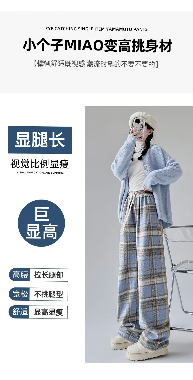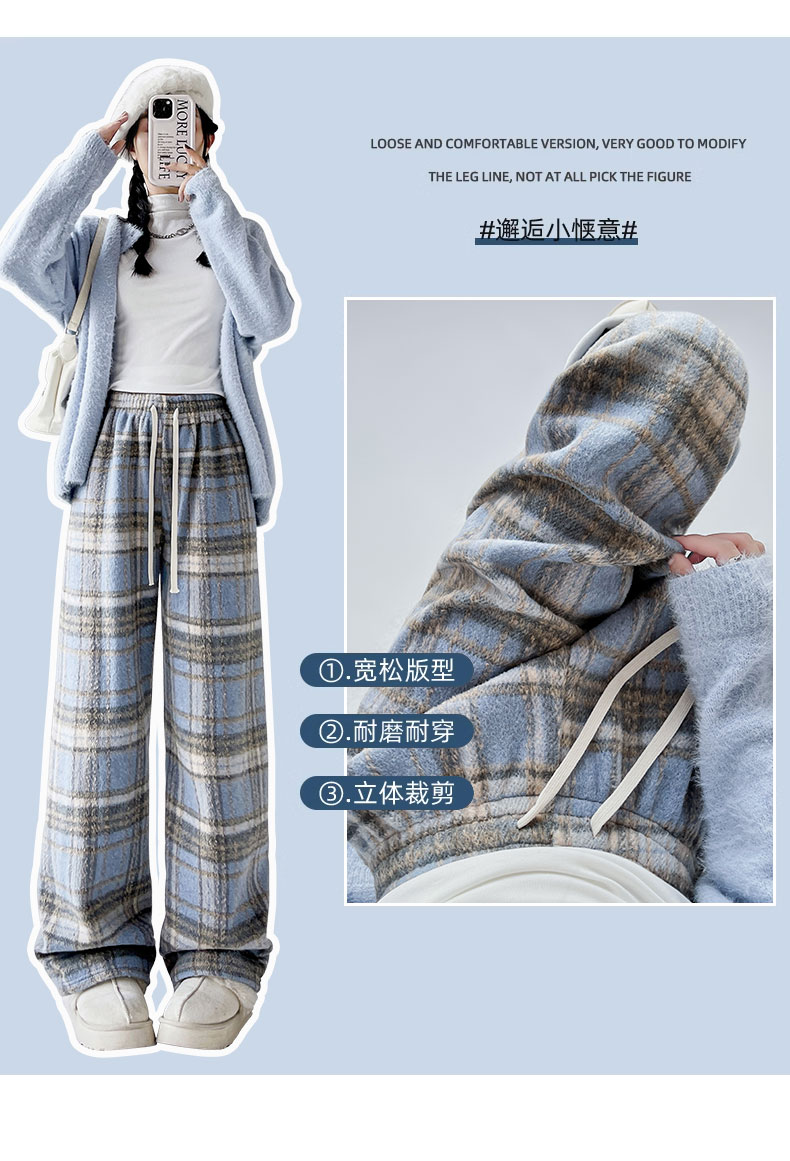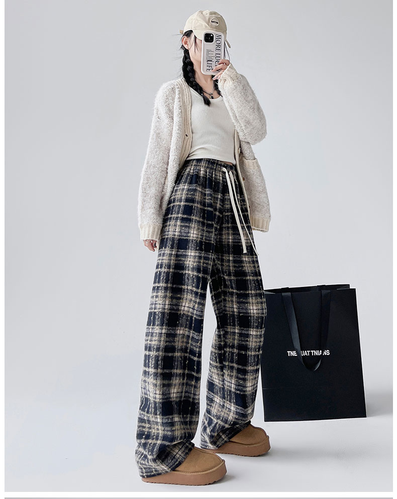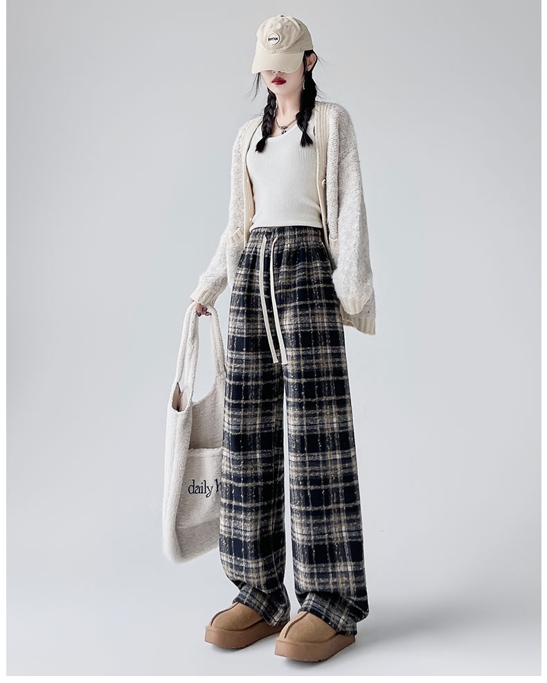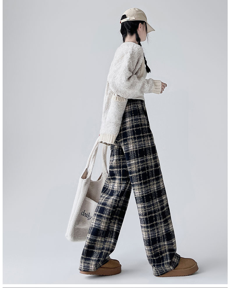 Woolen Plaid Pants for Women, Spring, Autumn and Winter 2025 New Style, Loose Straight-Leg Drapey Fleece-Lined Retro Casual Wide-Leg Pants