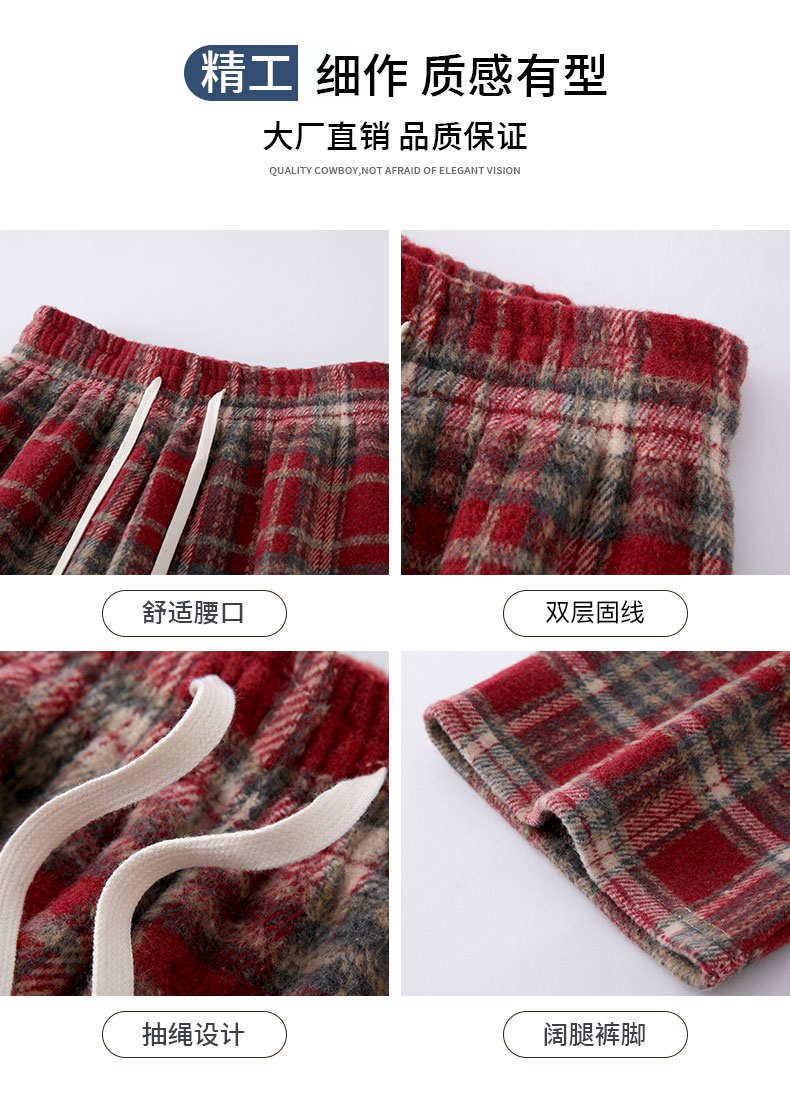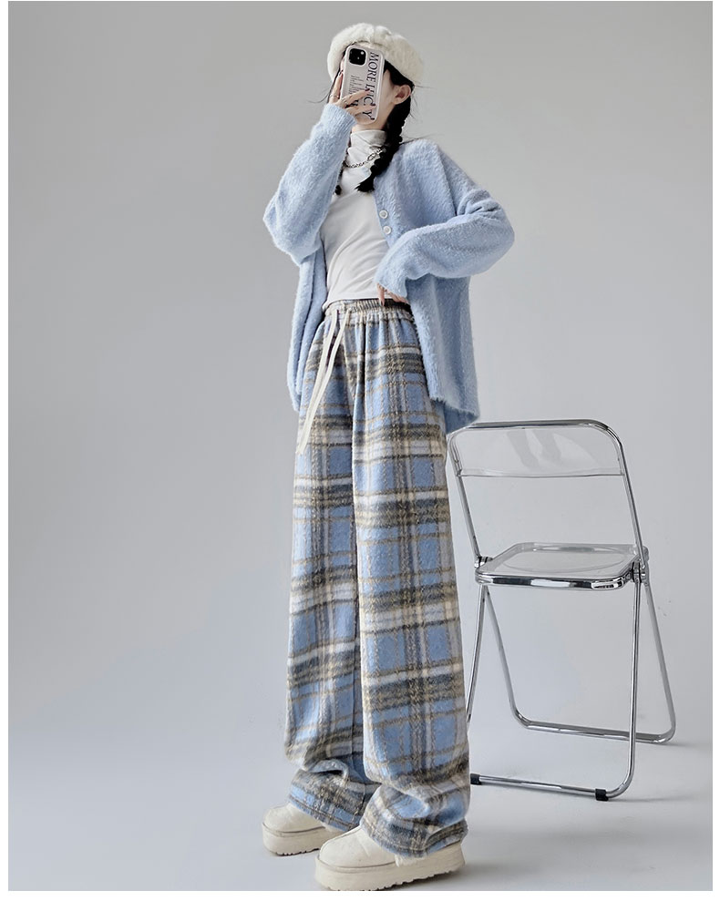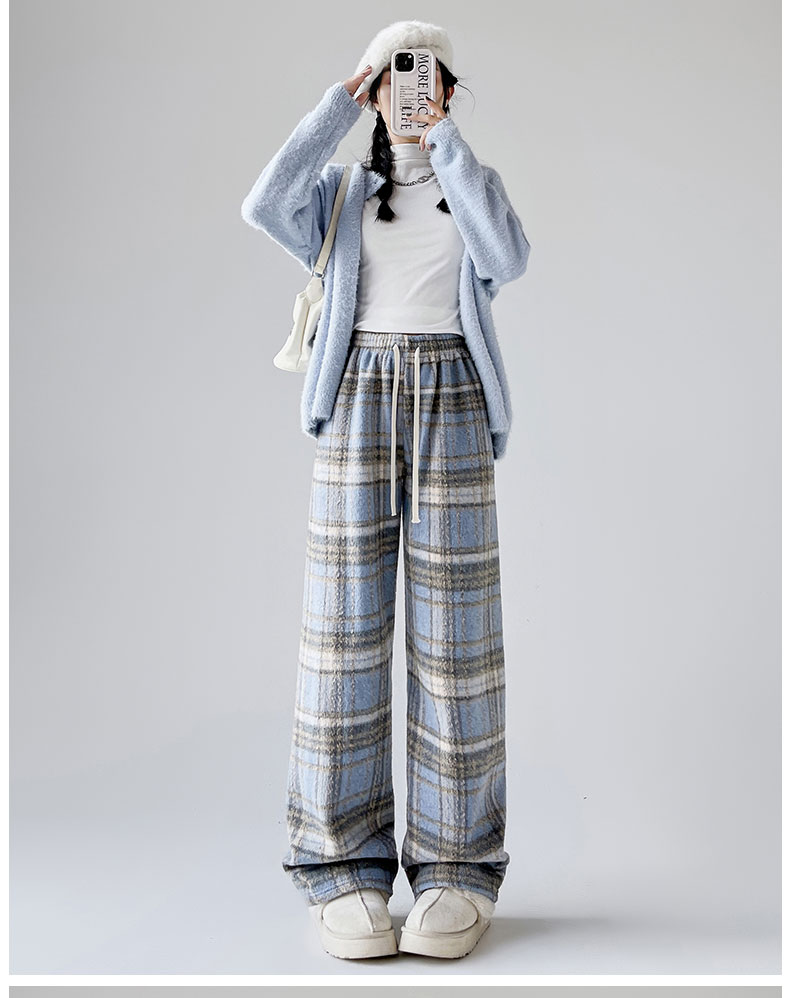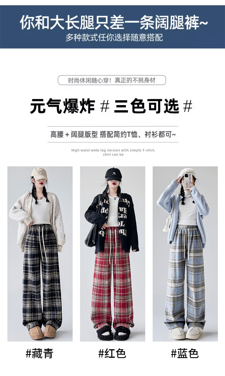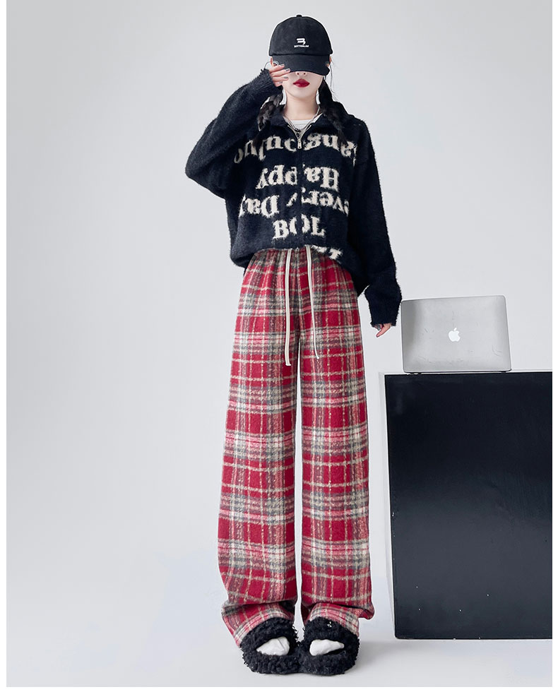 Woolen Plaid Pants for Women, Spring, Autumn and Winter 2025 New Style, Loose Straight-Leg Drapey Fleece-Lined Retro Casual Wide-Leg Pants