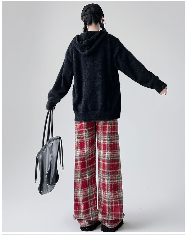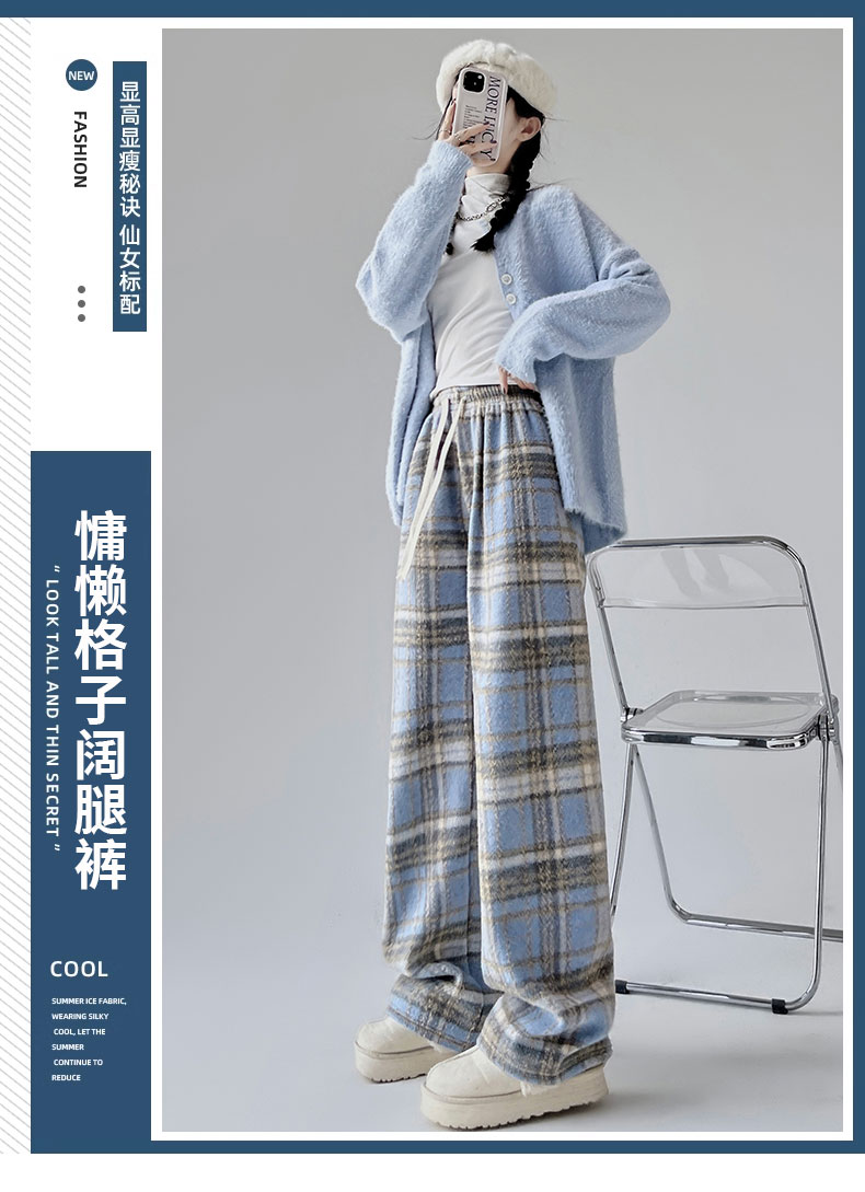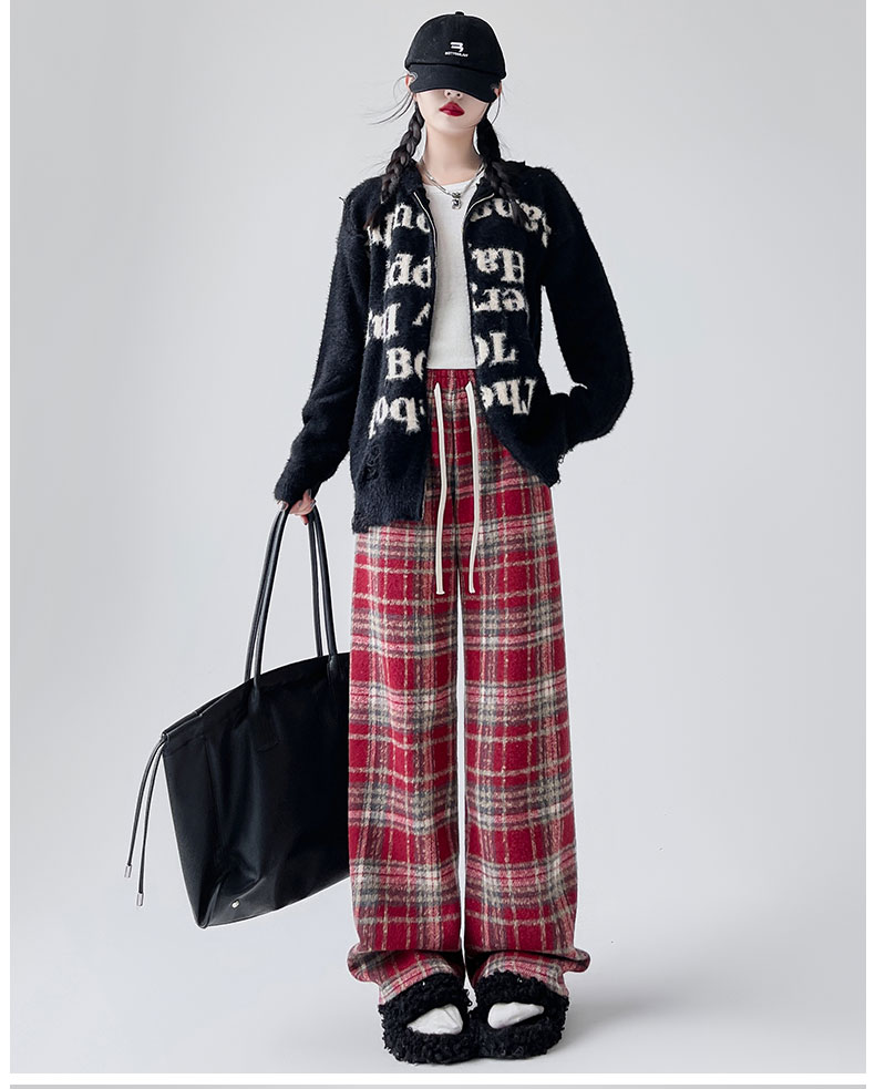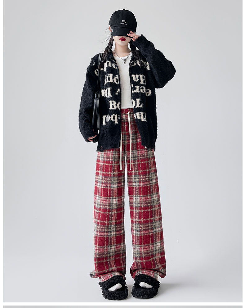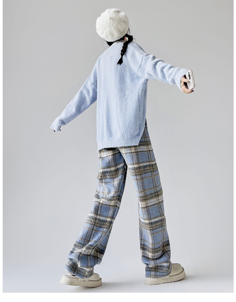 Woolen Plaid Pants for Women, Spring, Autumn and Winter 2025 New Style, Loose Straight-Leg Drapey Fleece-Lined Retro Casual Wide-Leg Pants