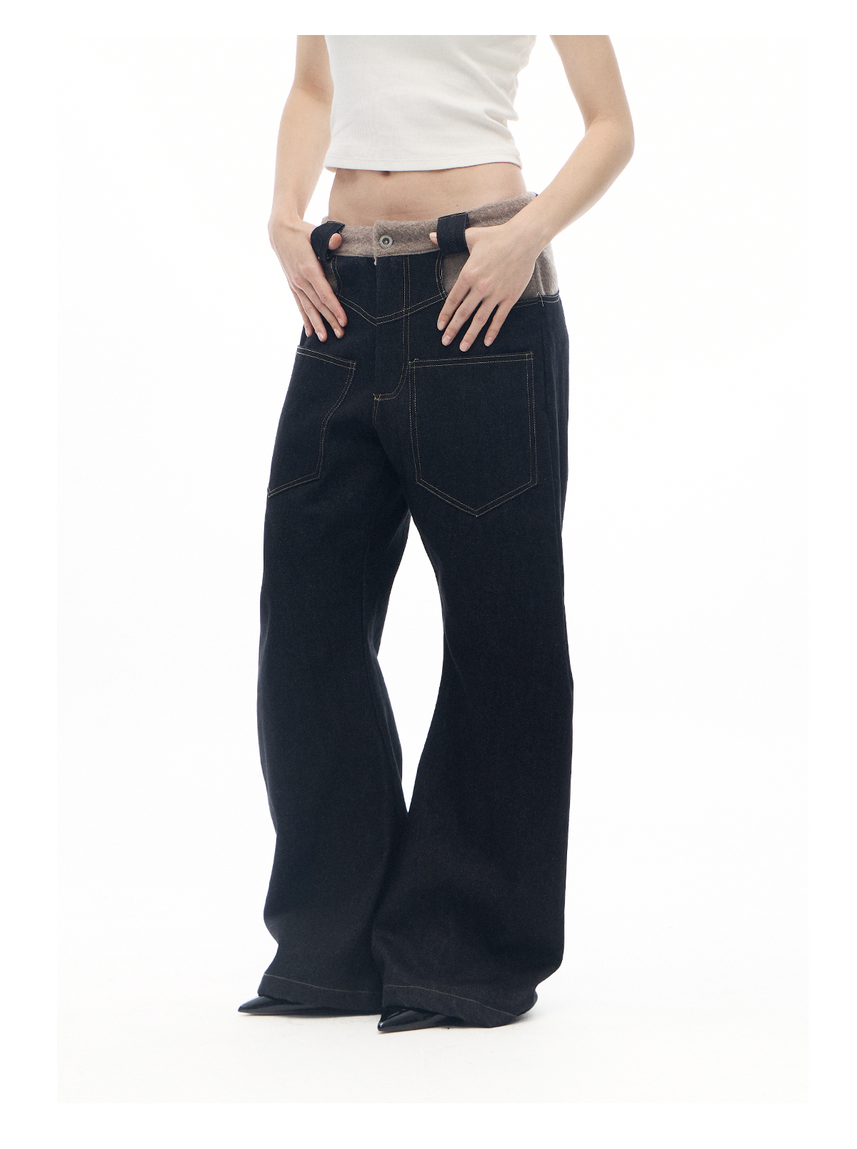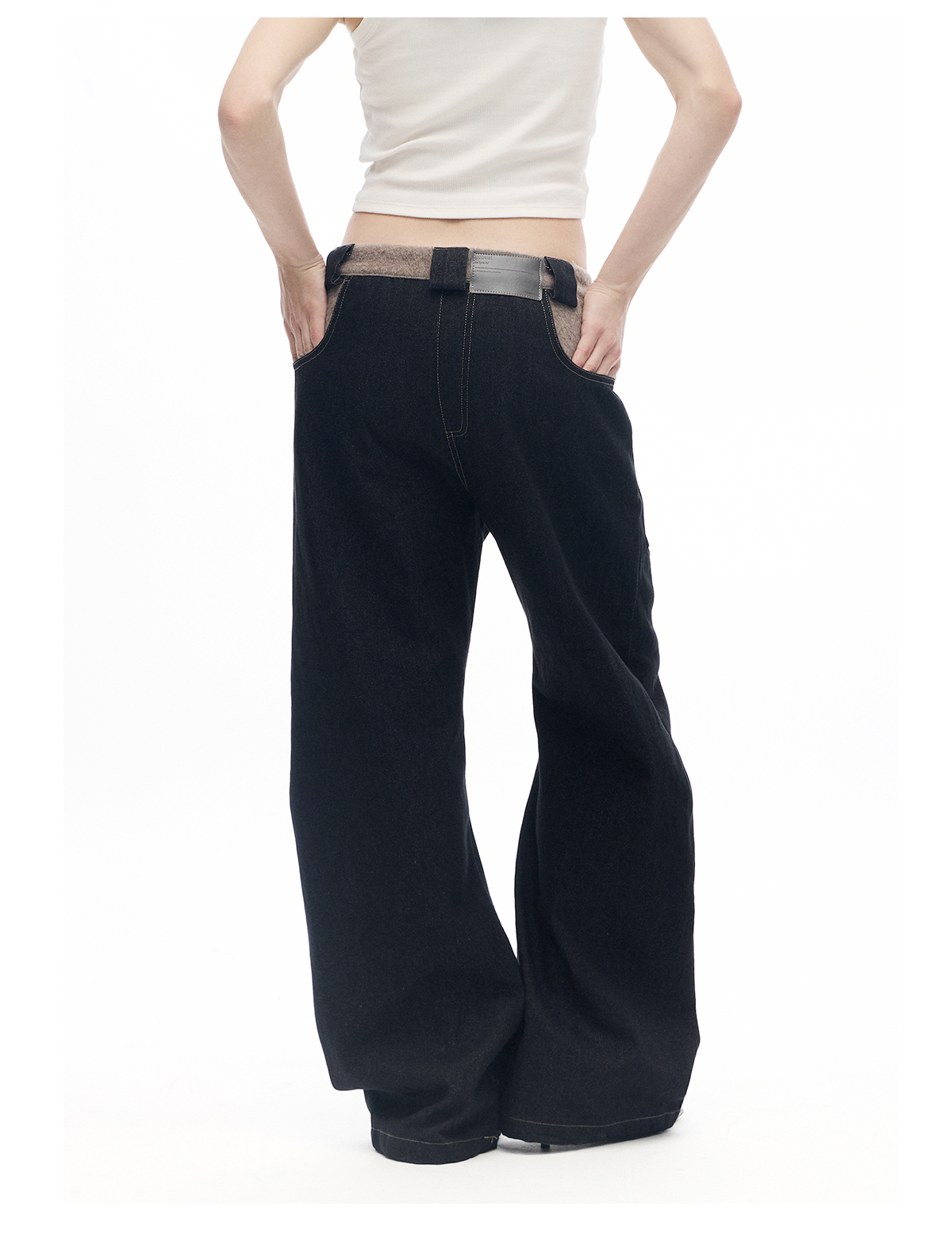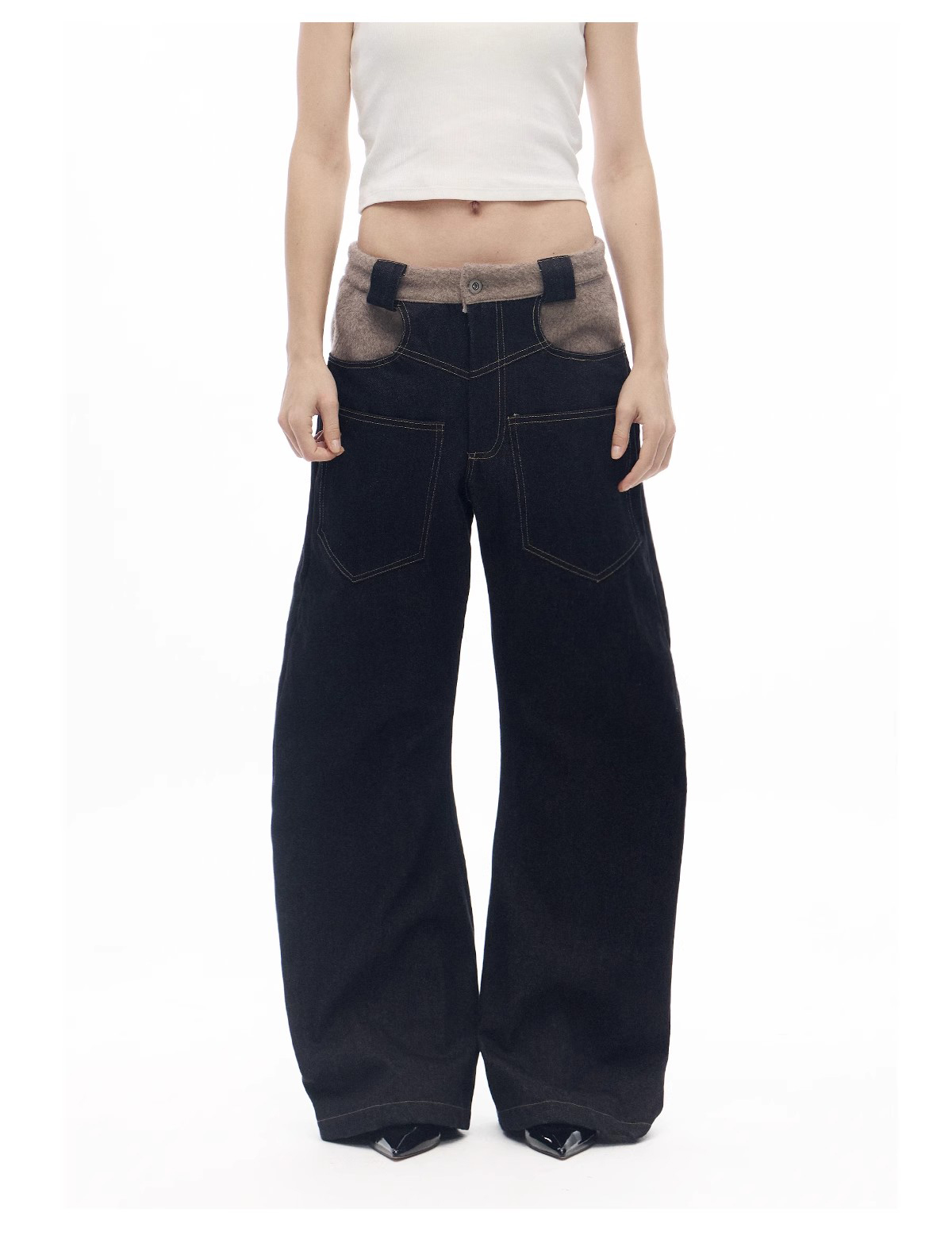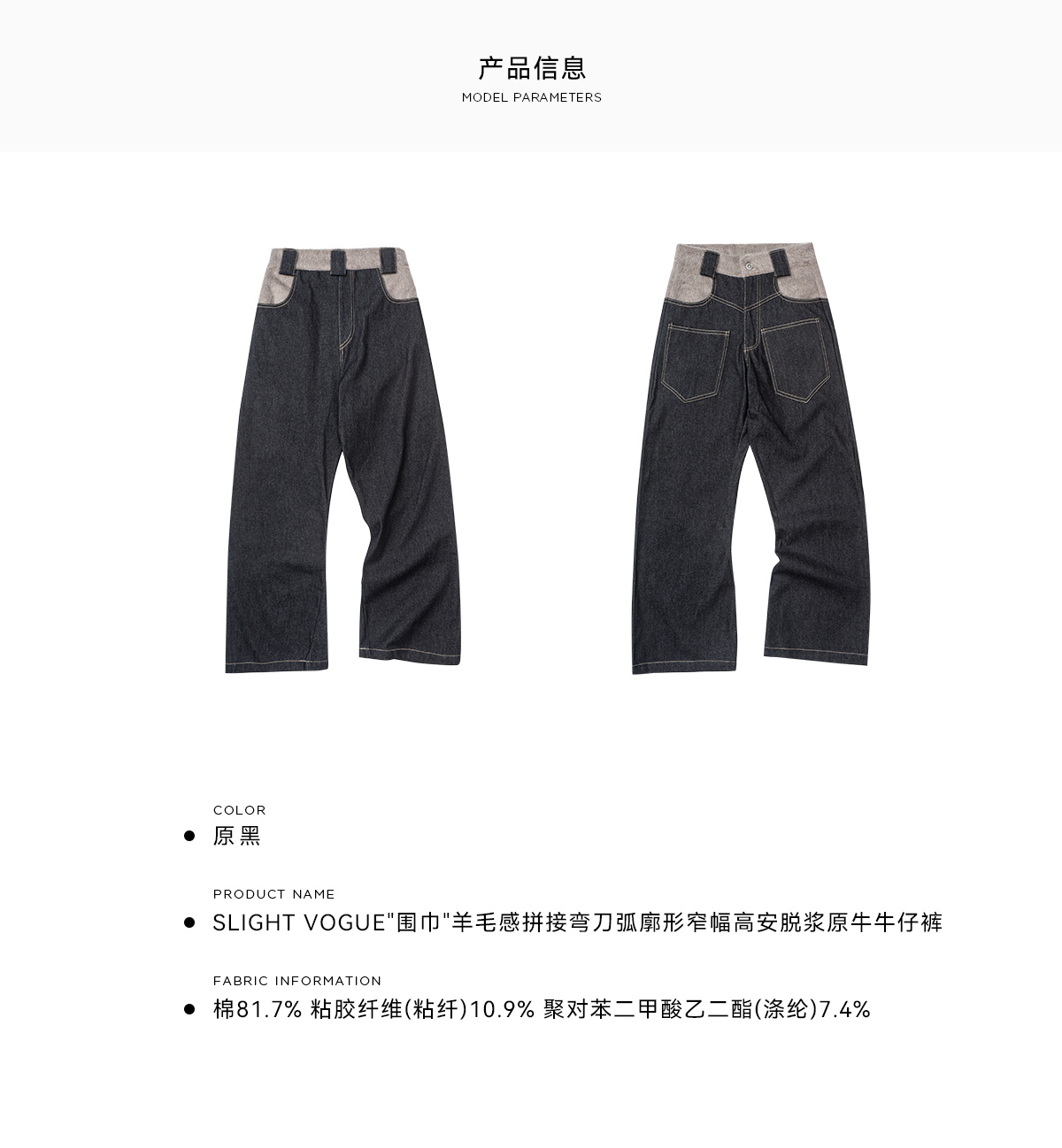 Slight Vogue Scarf-Like Wool-Feel Patchwork Curved Silhouette Narrow High-Waisted Raw Denim Jeans