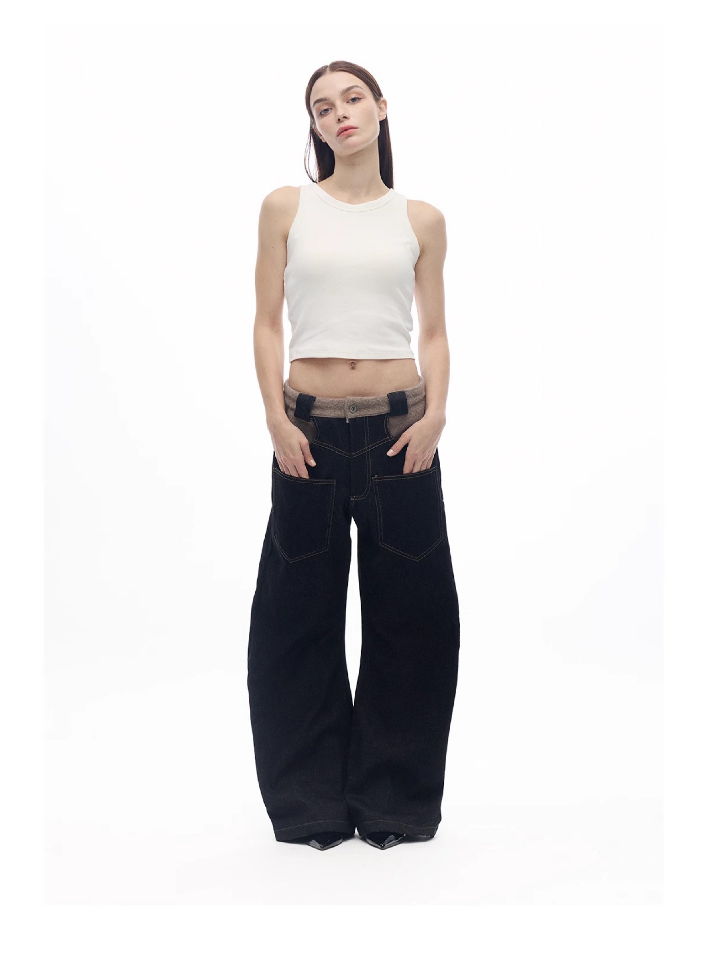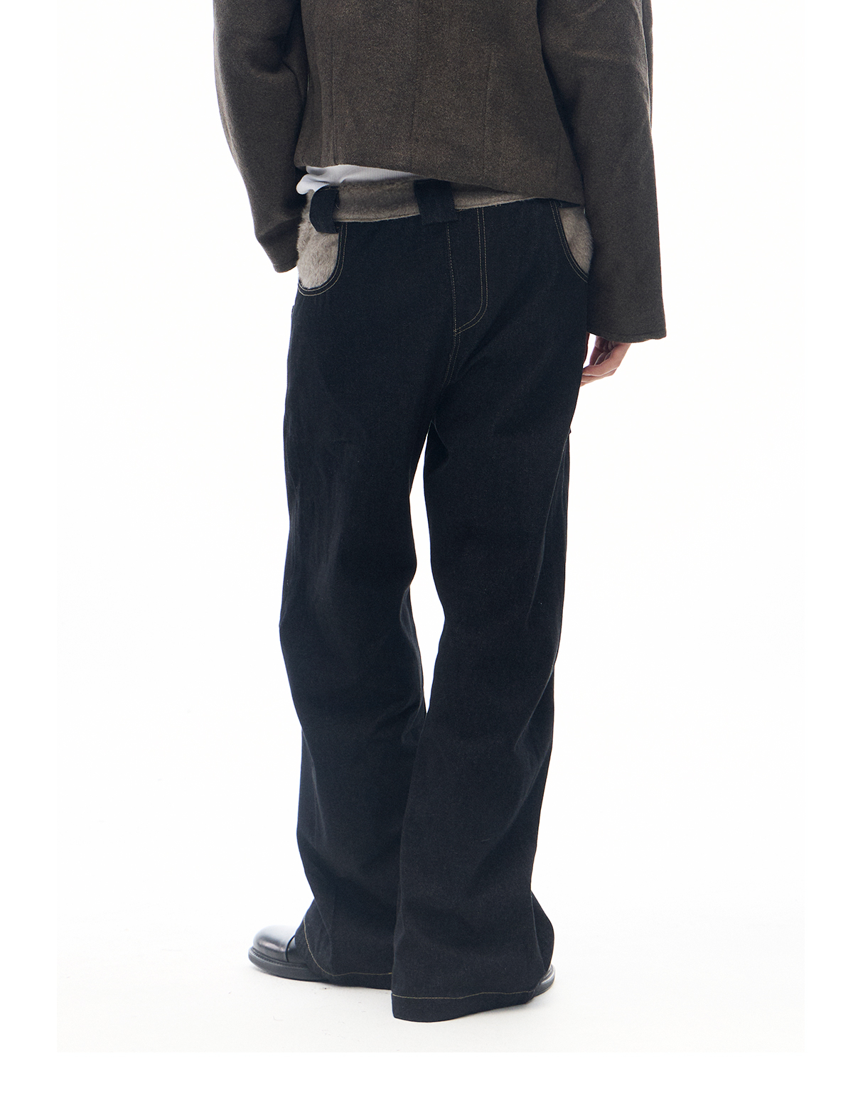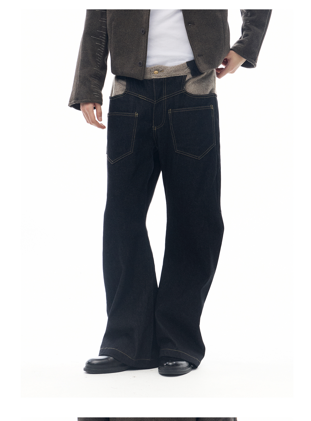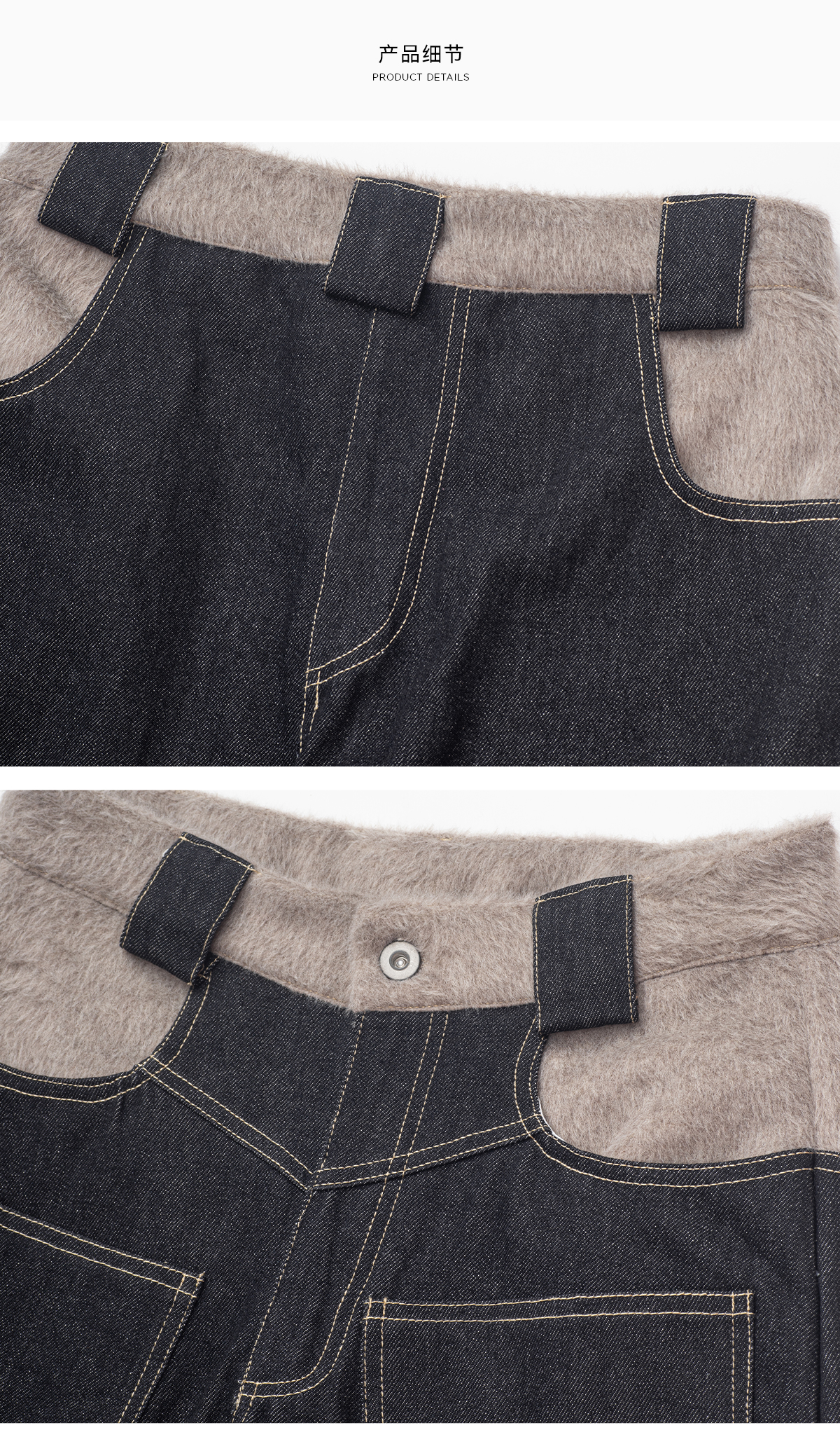 Slight Vogue Scarf-Like Wool-Feel Patchwork Curved Silhouette Narrow High-Waisted Raw Denim Jeans