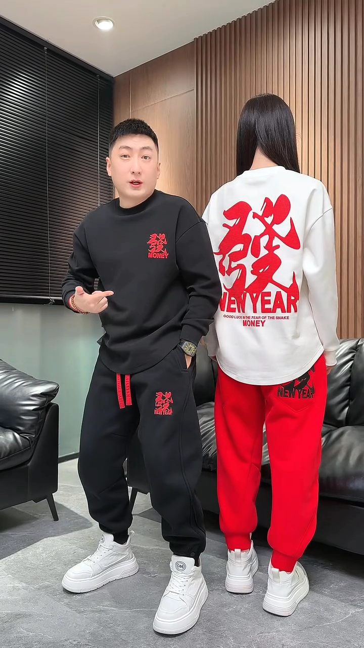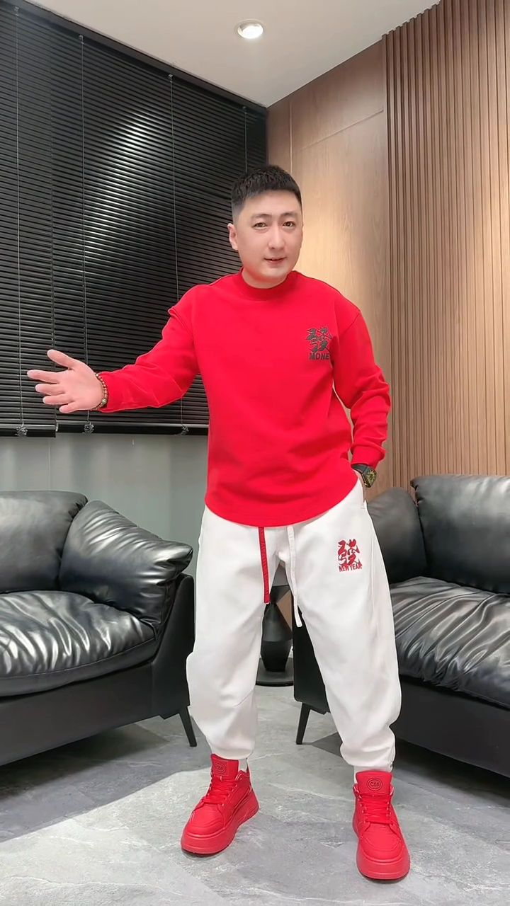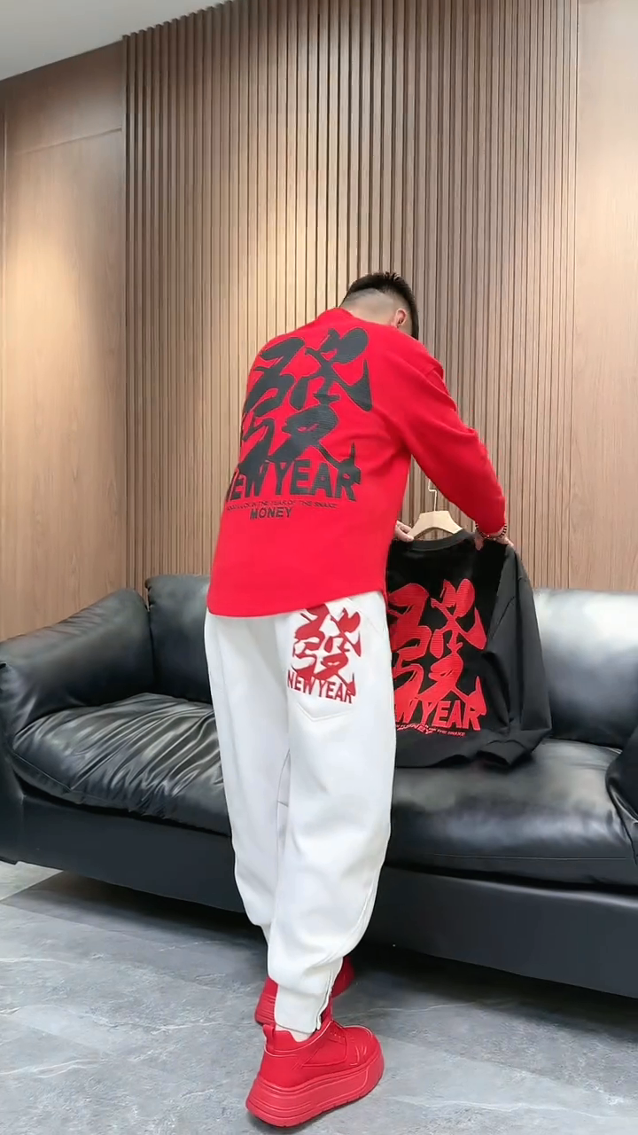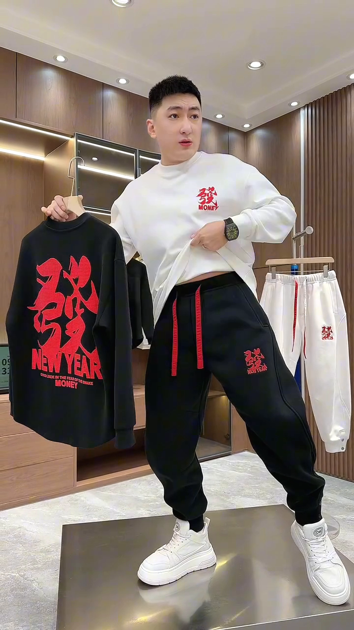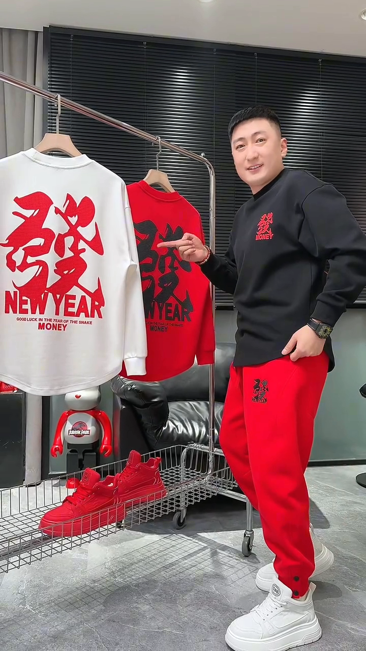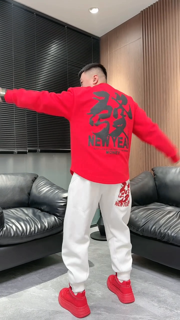 2025 Autumn and Winter Fleece-Lined Thickened Sweatshirt Fashion Set for Men, Chinese Style Embroidered Prosperity Red Clothing and Pants for Men