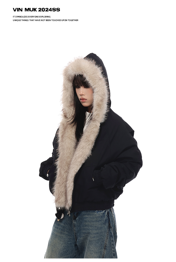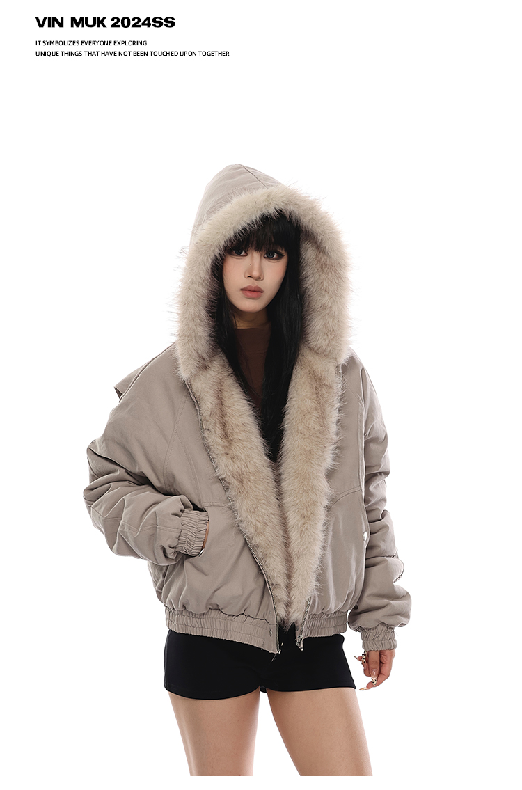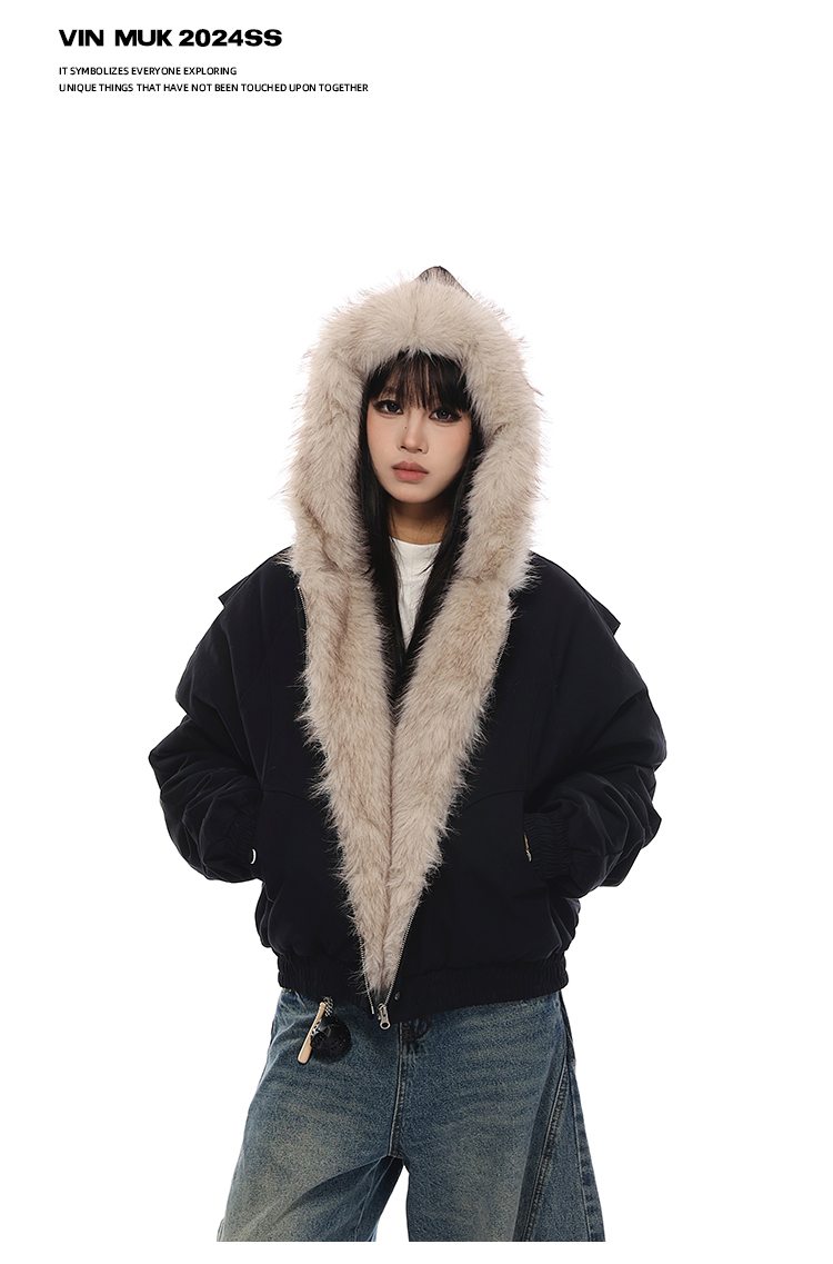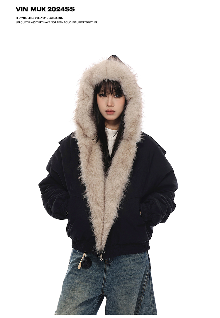 Vinmuk Fur Collar Padded Jacket American Retro Cleanfit Short Zip-Up Padded Jacket for Women Thickened