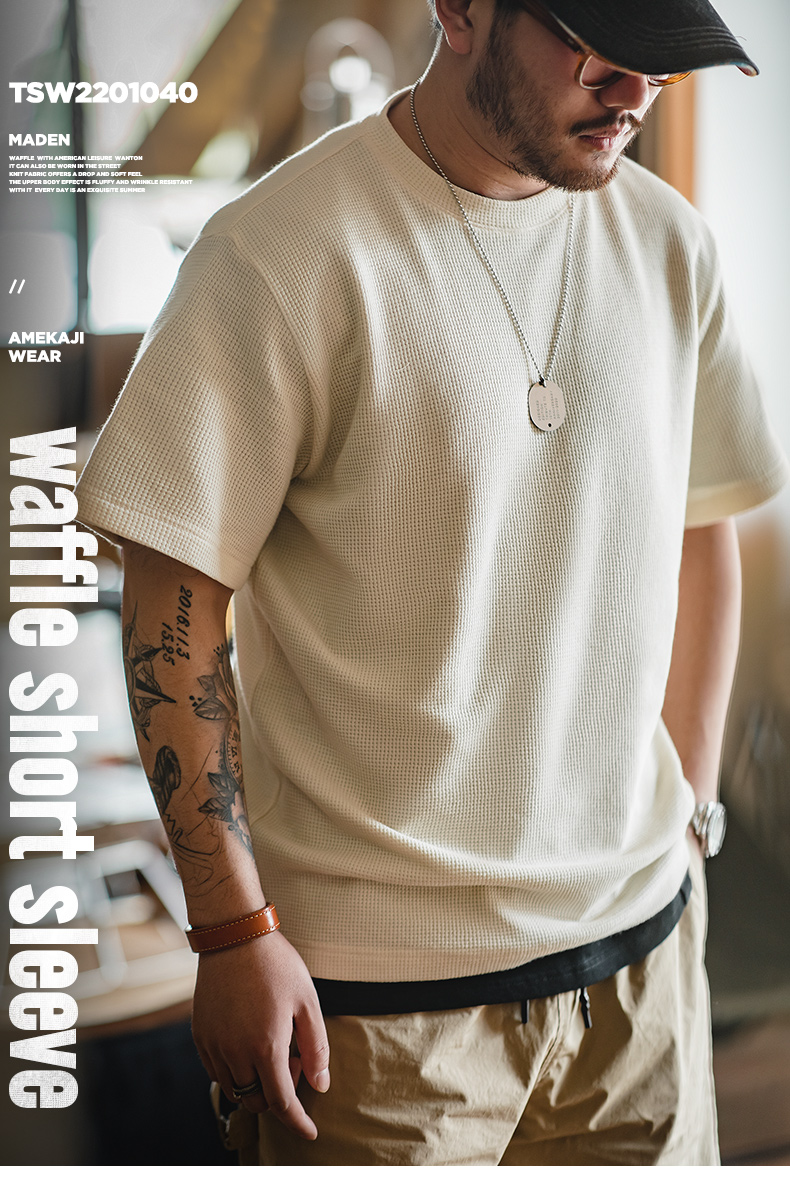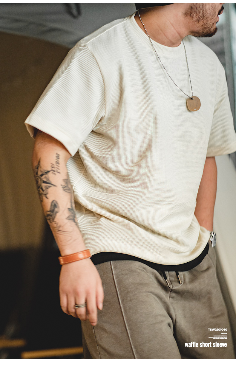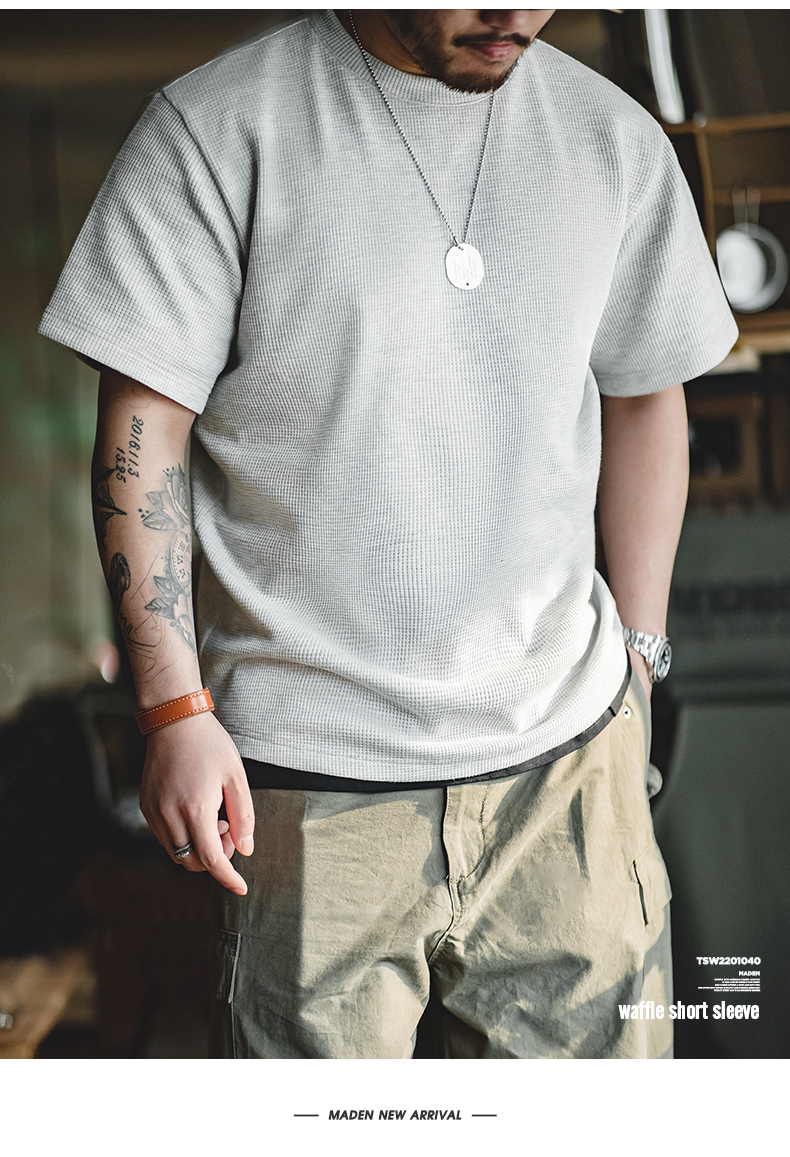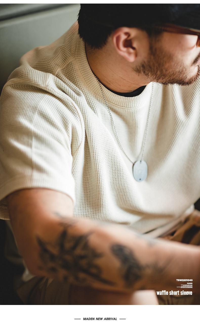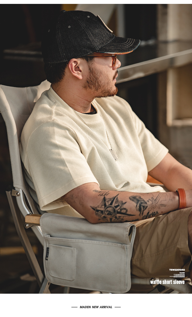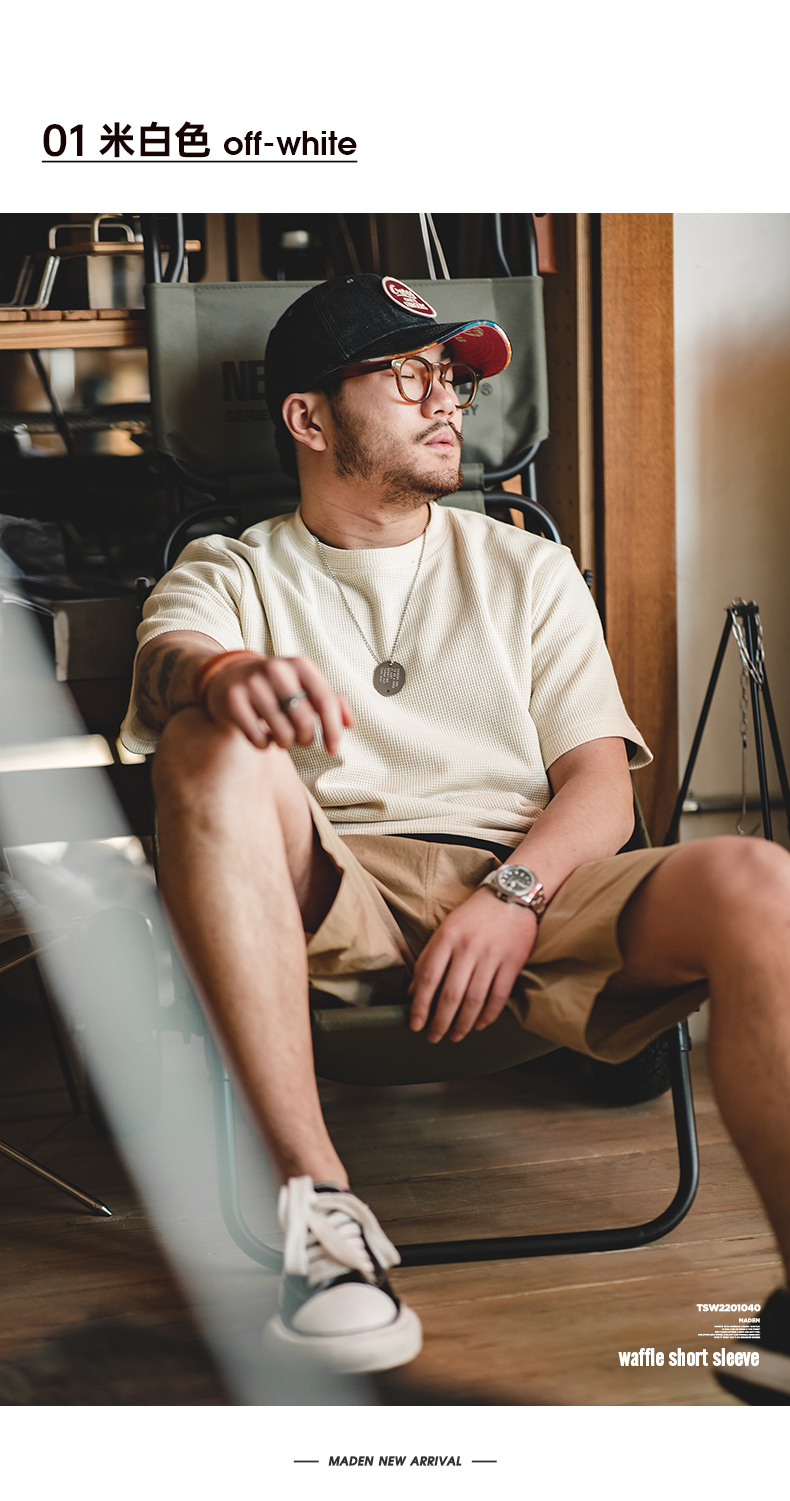 Madden Workwear American-Style Off-White Waffle Knit T-Shirt with Regular Shoulders, Heavyweight Old Money Style, Textured Short-Sleeve Men's Summer Wear