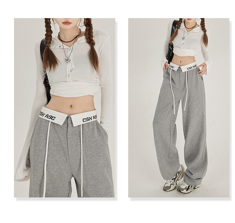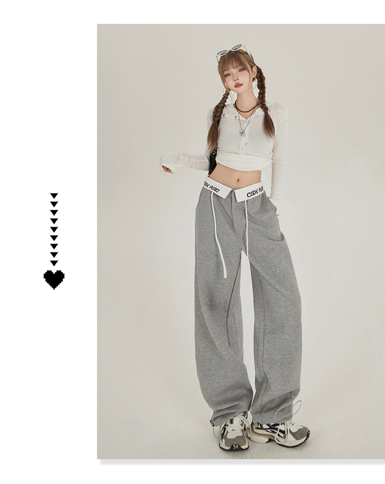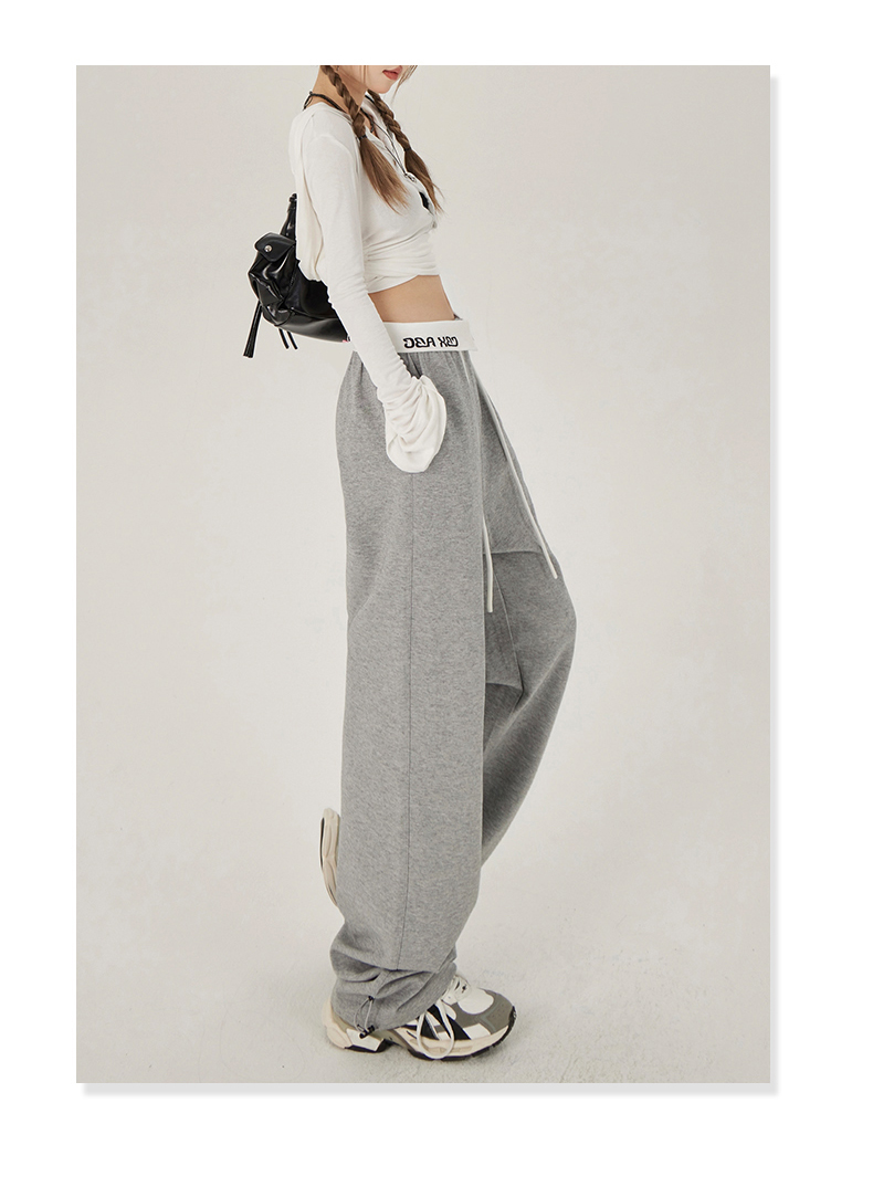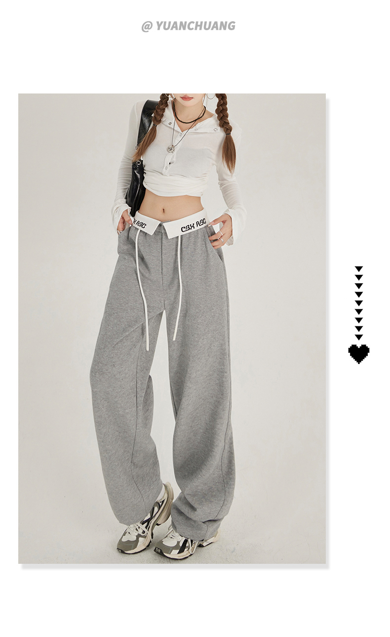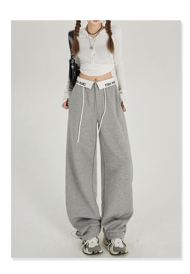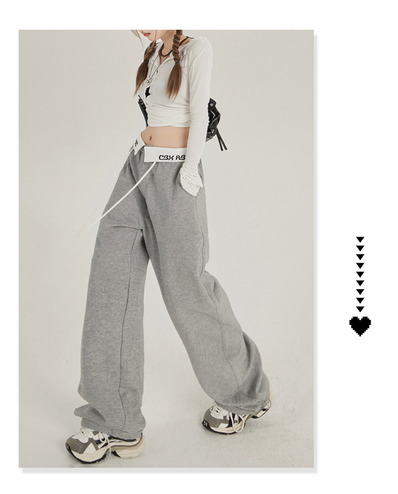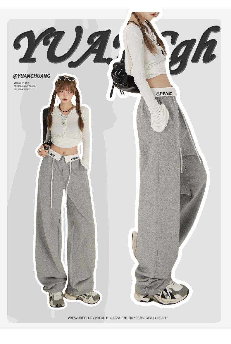 Mrzp American High Street Style Gray Cuffed Casual Pants for Women, Drawstring Loose Wide-Leg Sports Walking Jazz Dance Pants for Summer