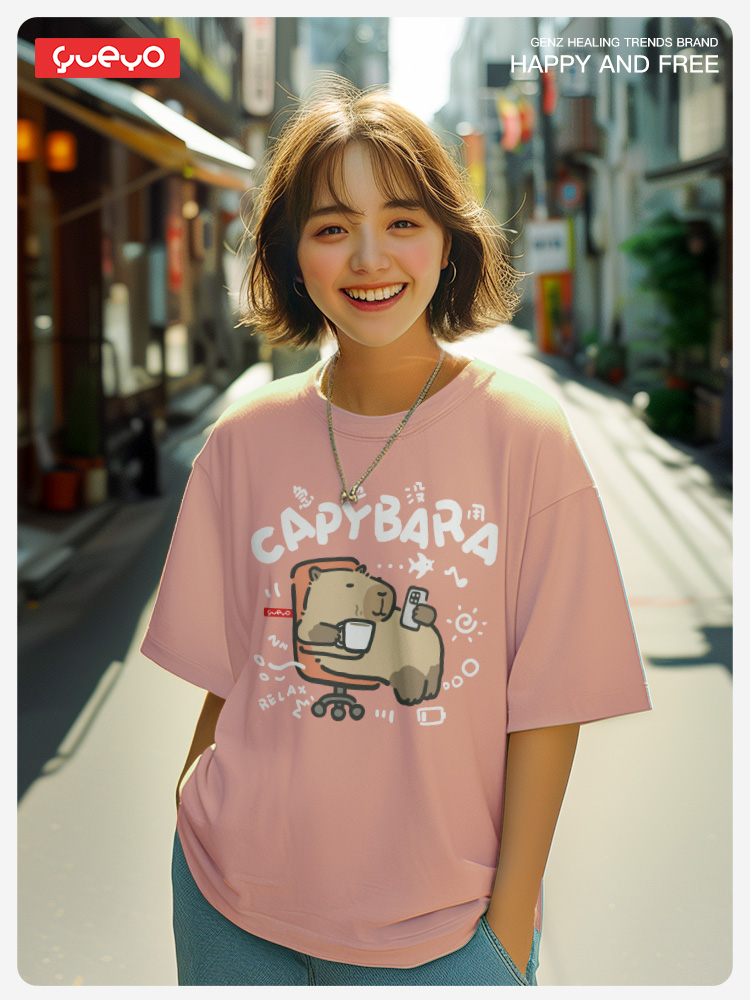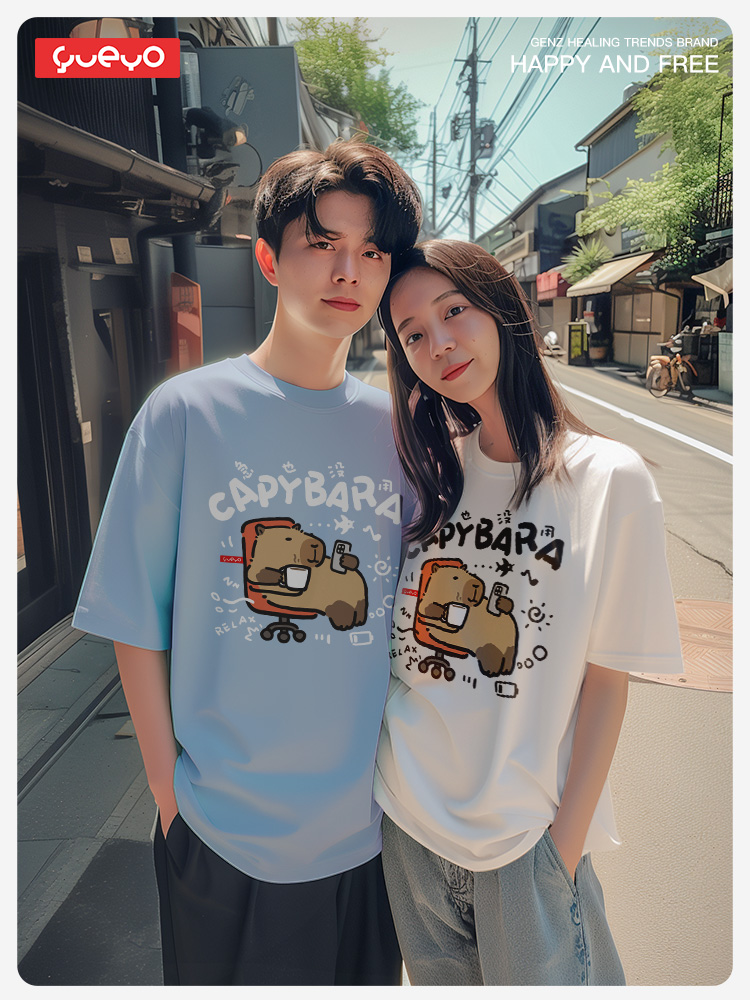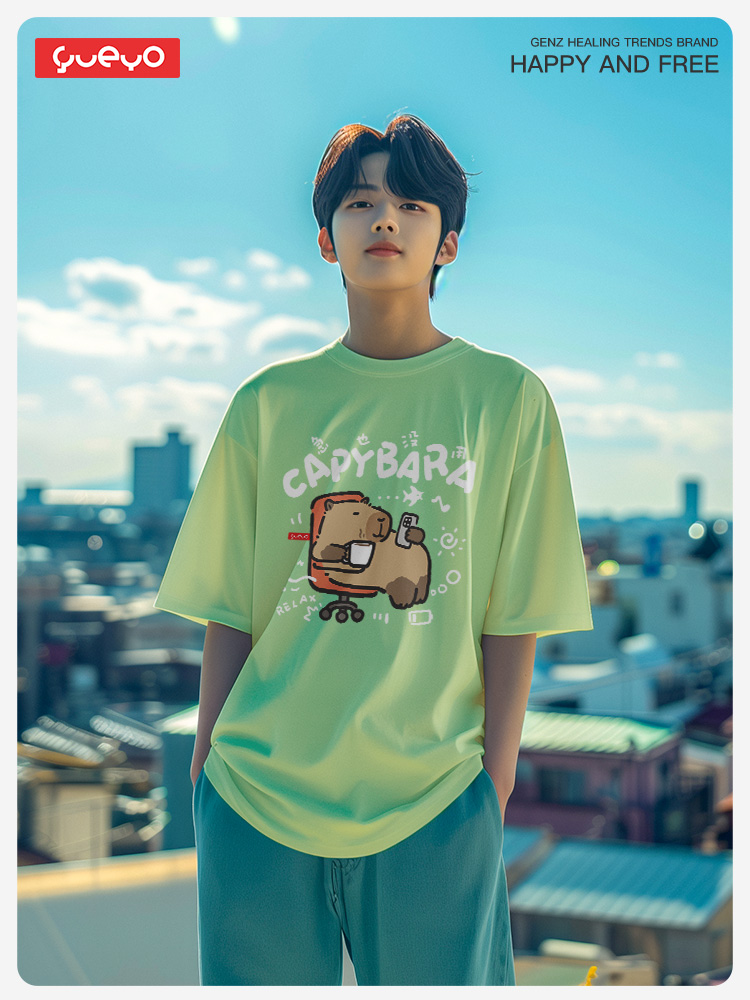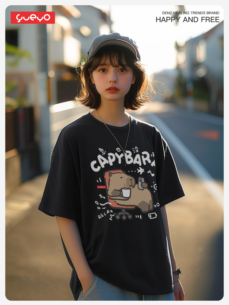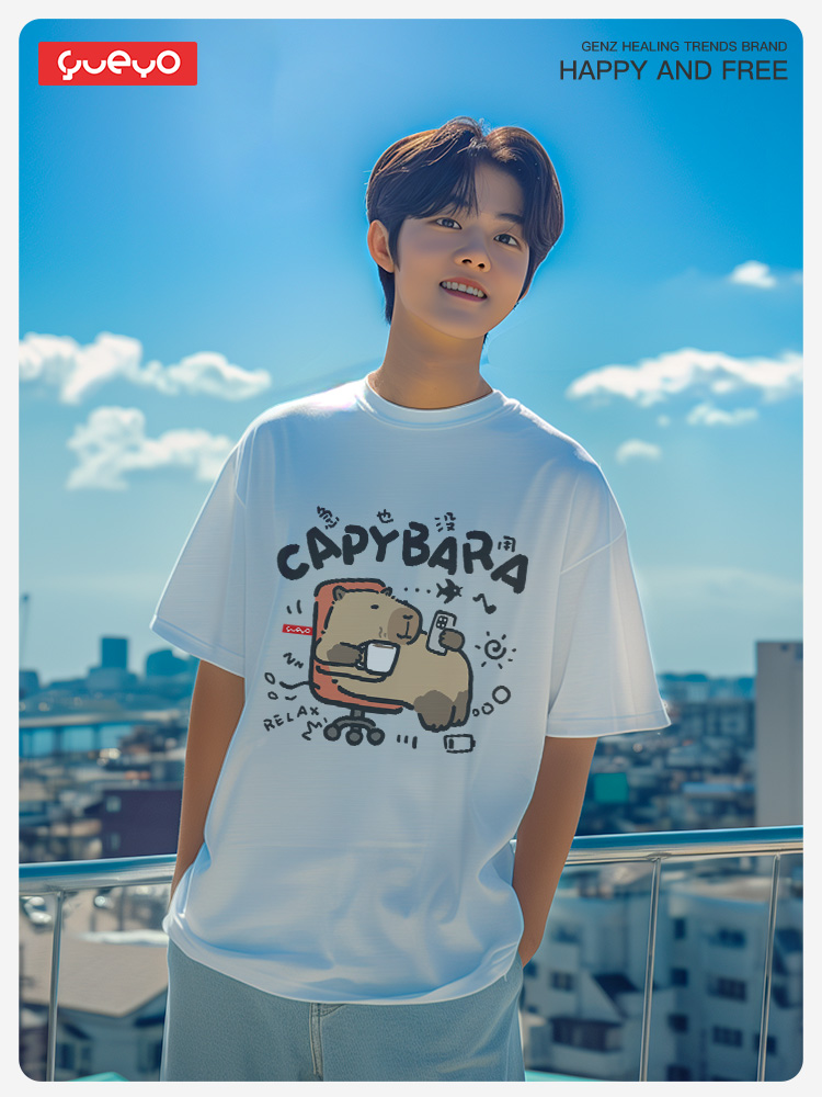 Yueyou Capibara Funny Working Capybara Calm Outfit Cute Summer Pure Cotton Drop Shoulder Short Sleeve T-Shirt for Men