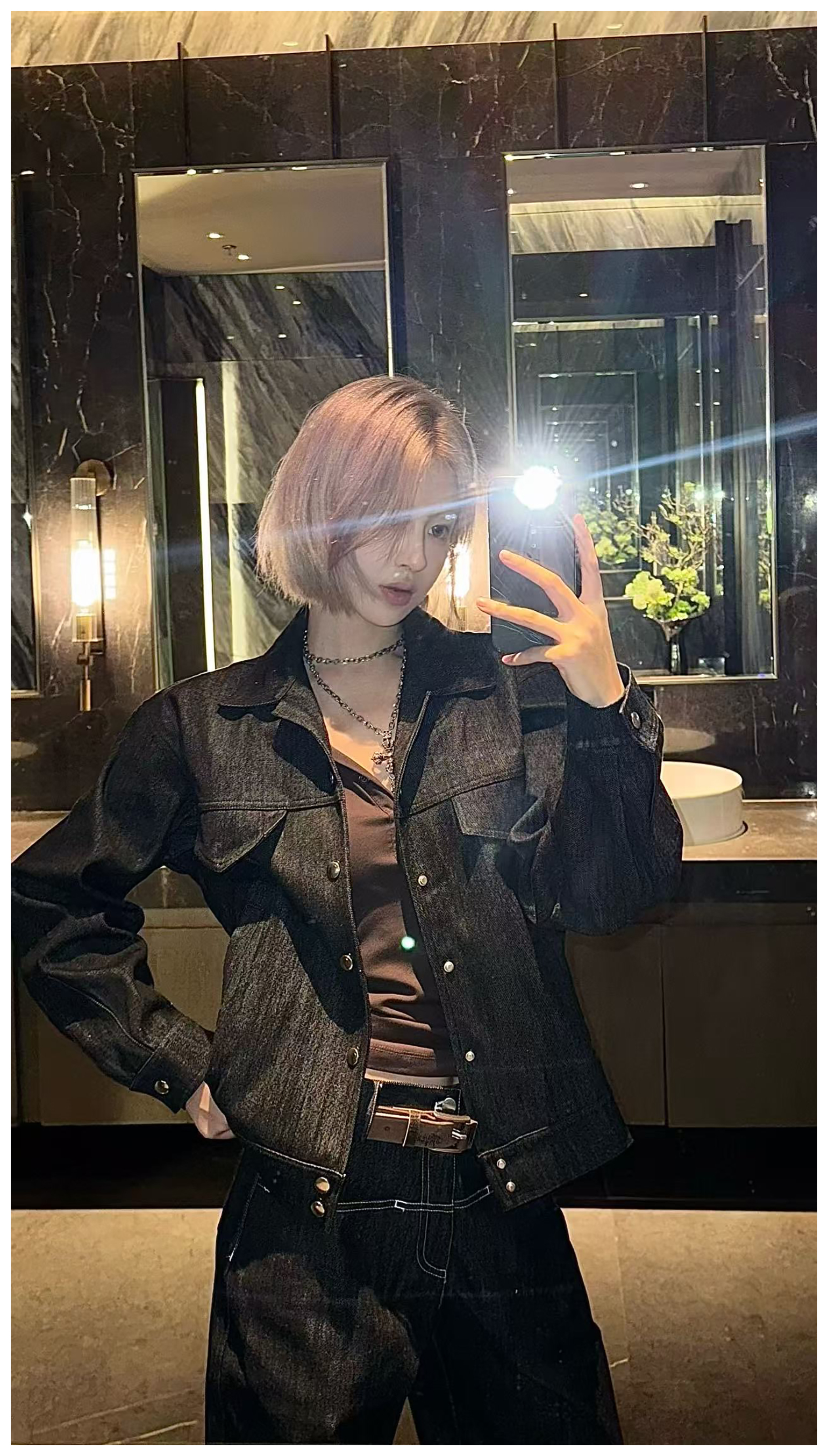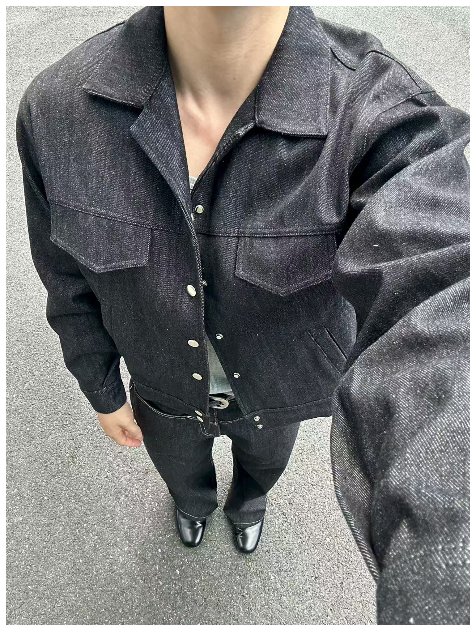 Mob En Costume 14oz Tencel Cuban Collar Raw Denim Jacket Black Long-Sleeve Shirt for Men