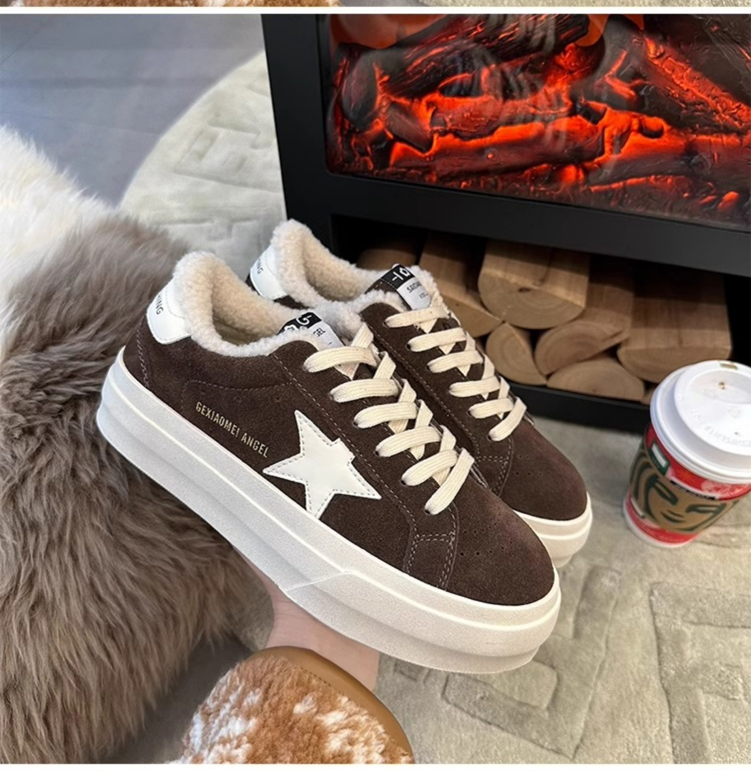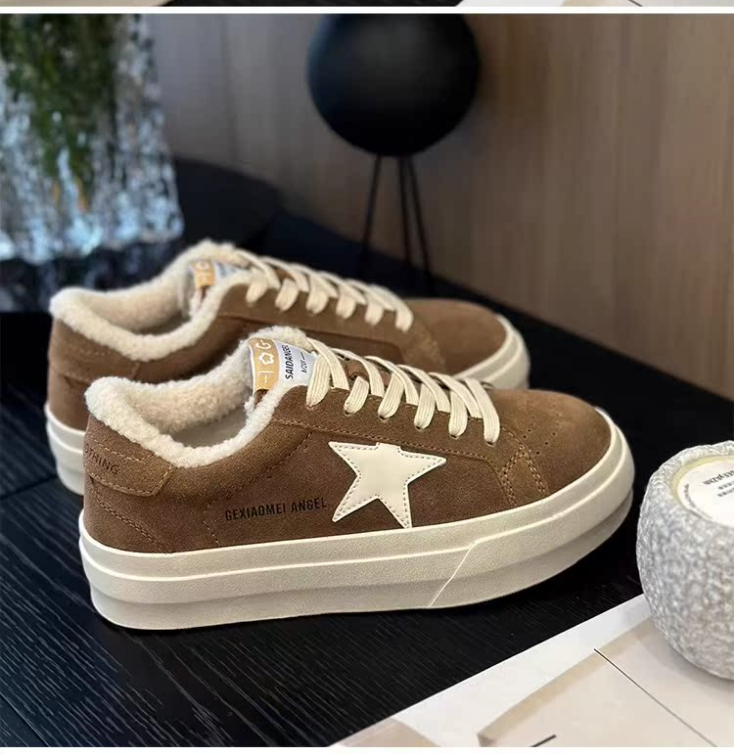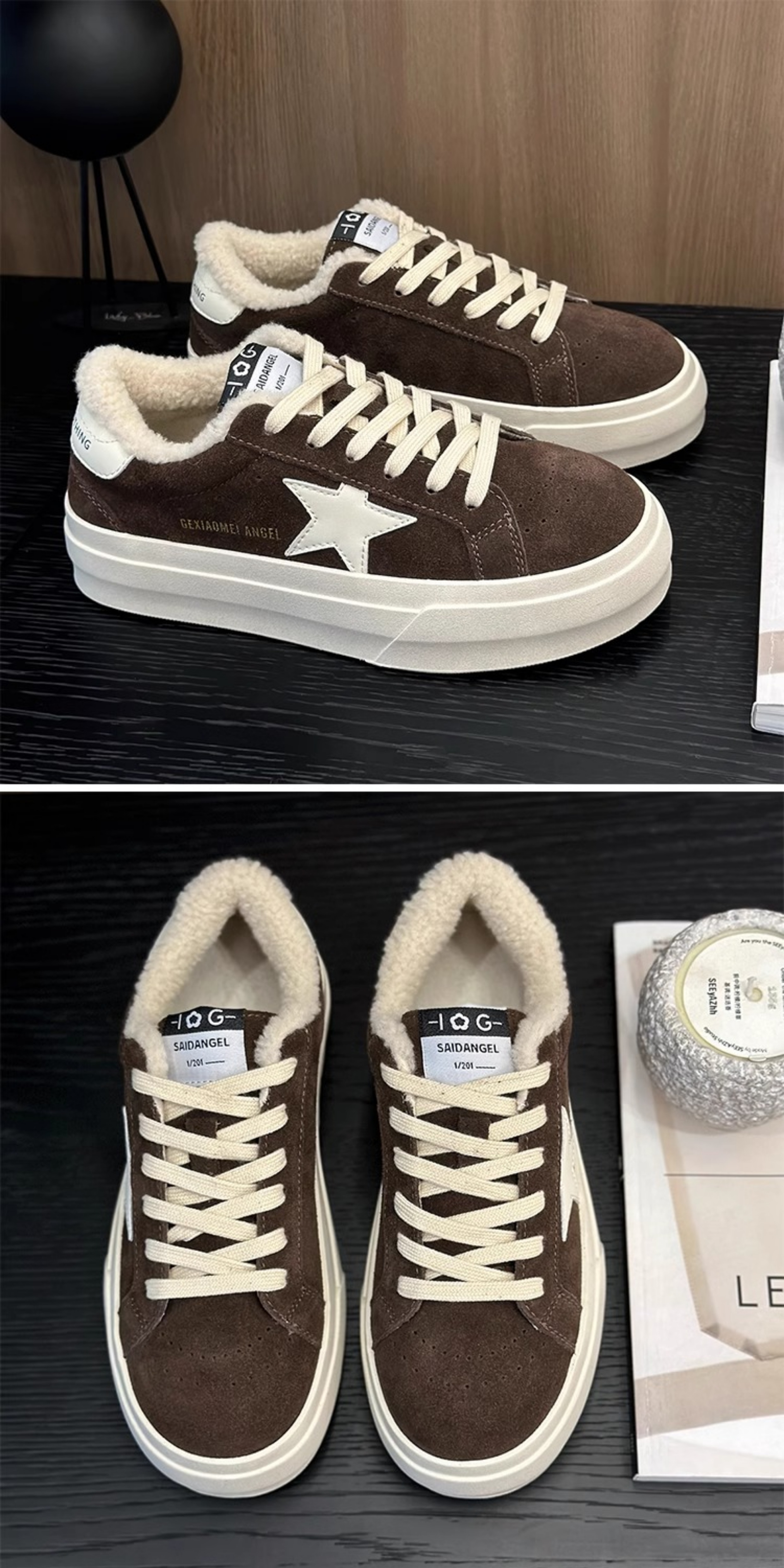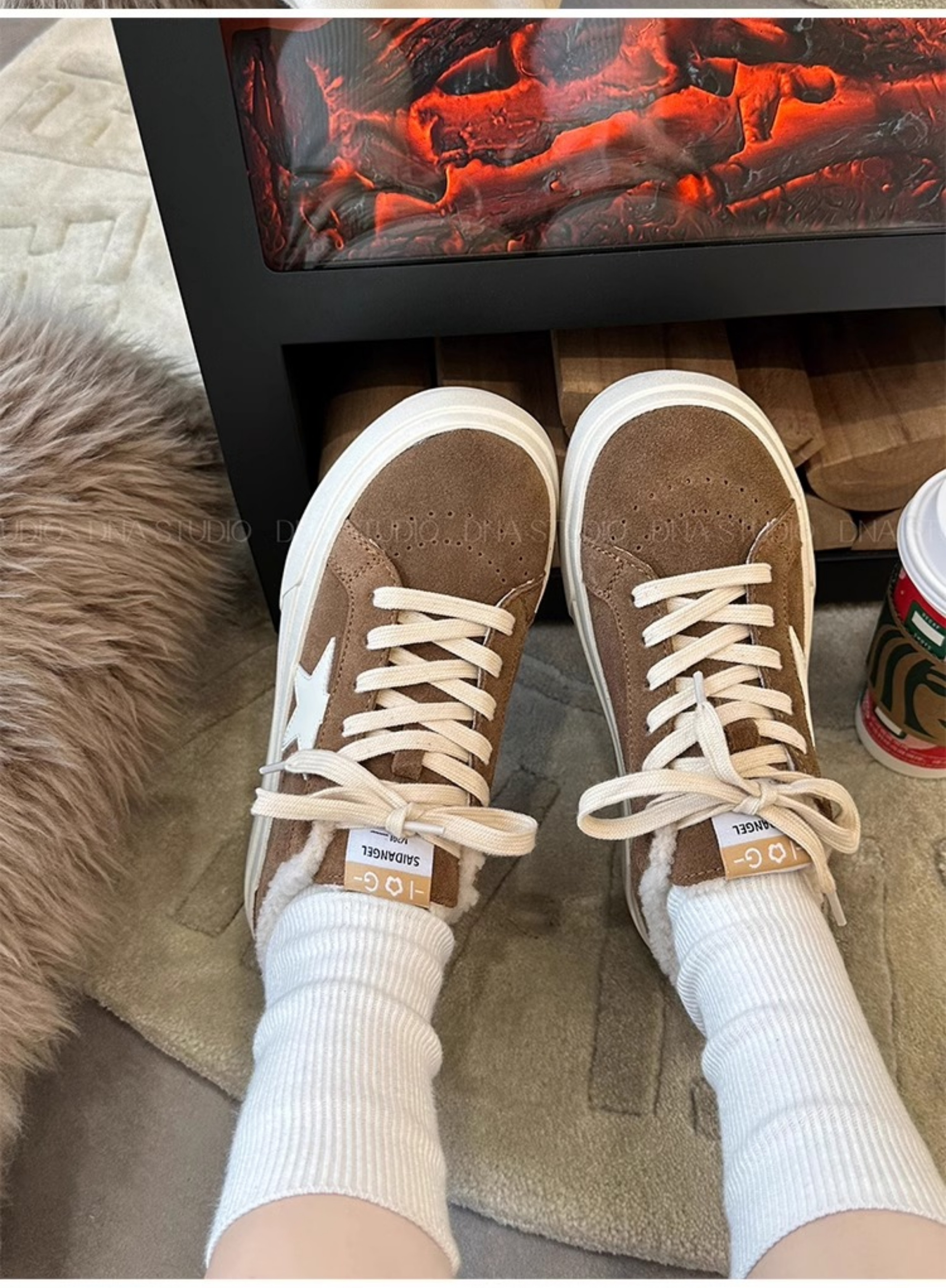 Hong Kong Genuine Leather Lamb Wool Star Shoes for Women 2025 New Winter Fleece-Lined Sports Casual Shoes Round Toe Lace-Up Sneakers