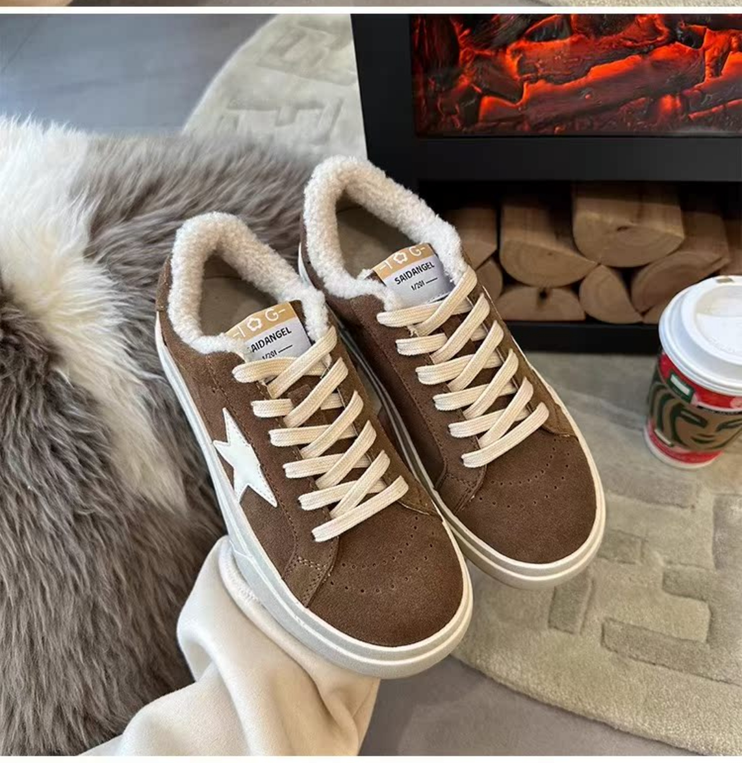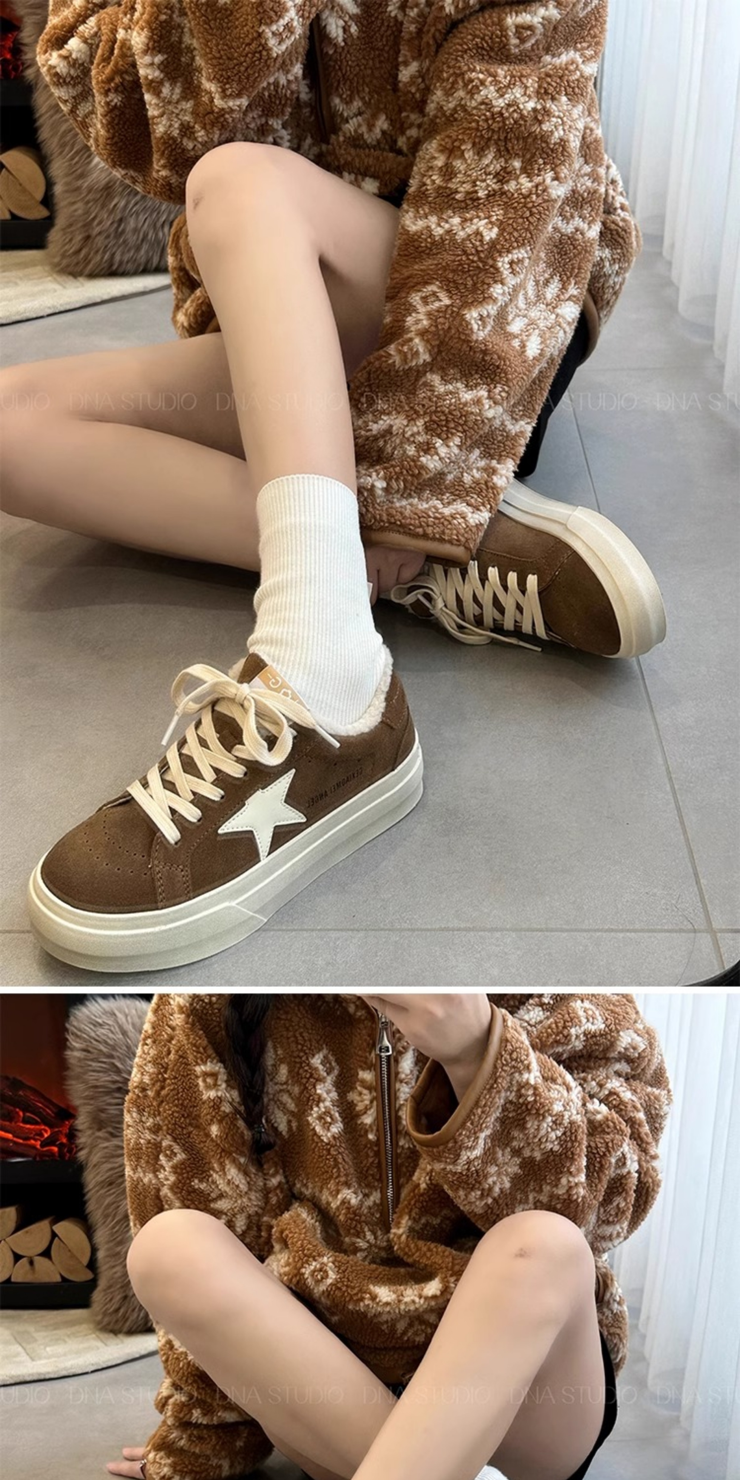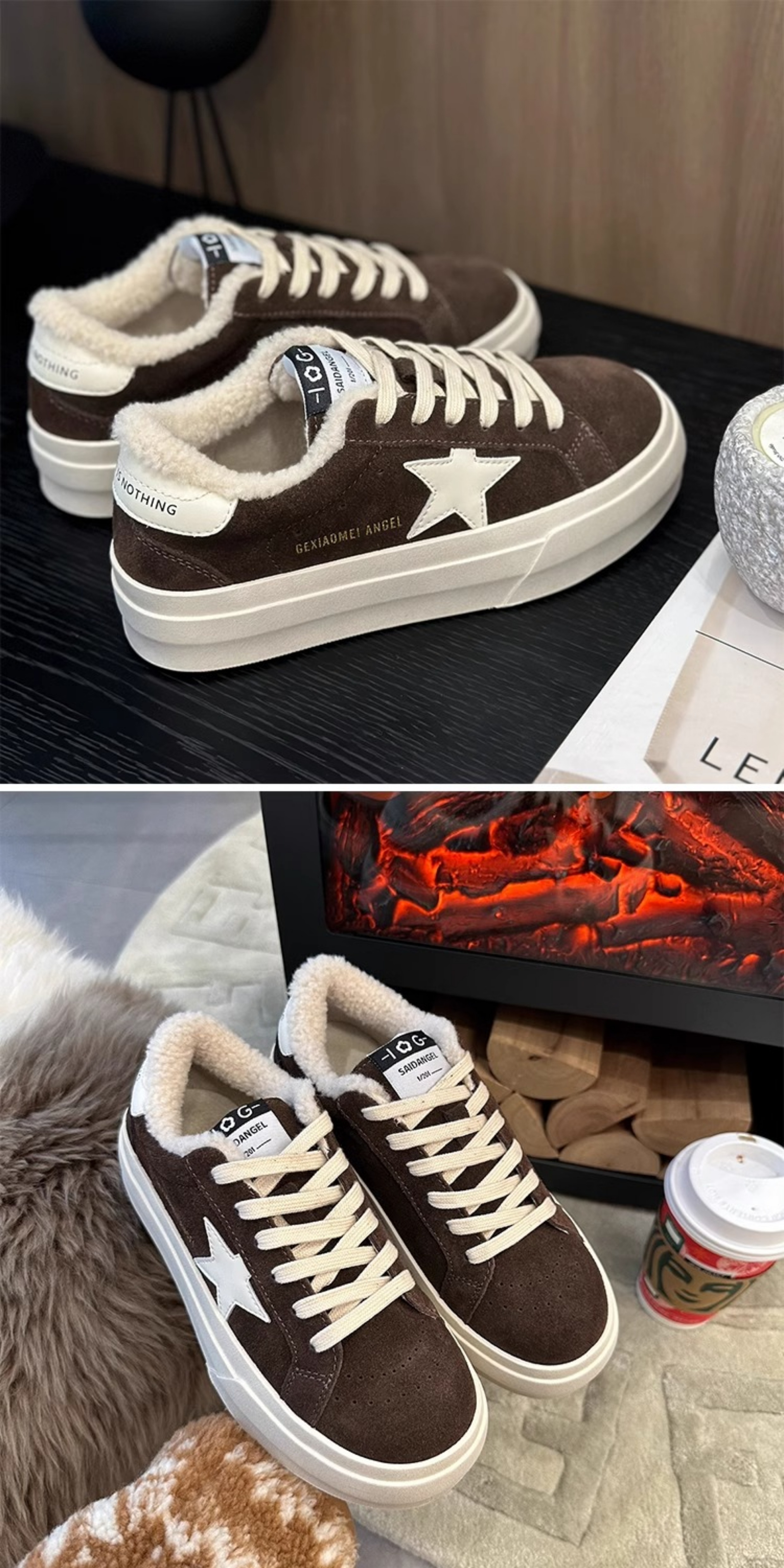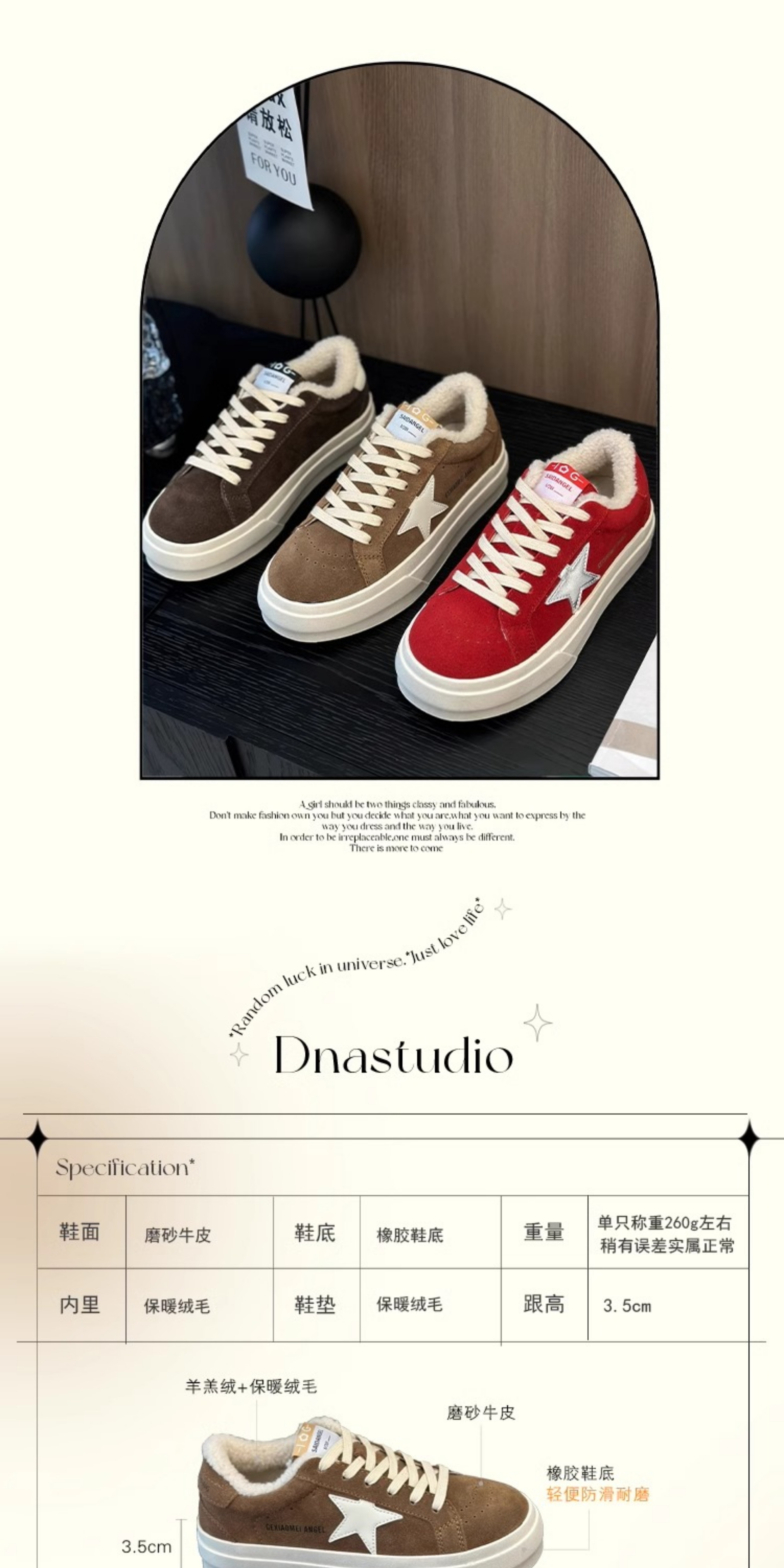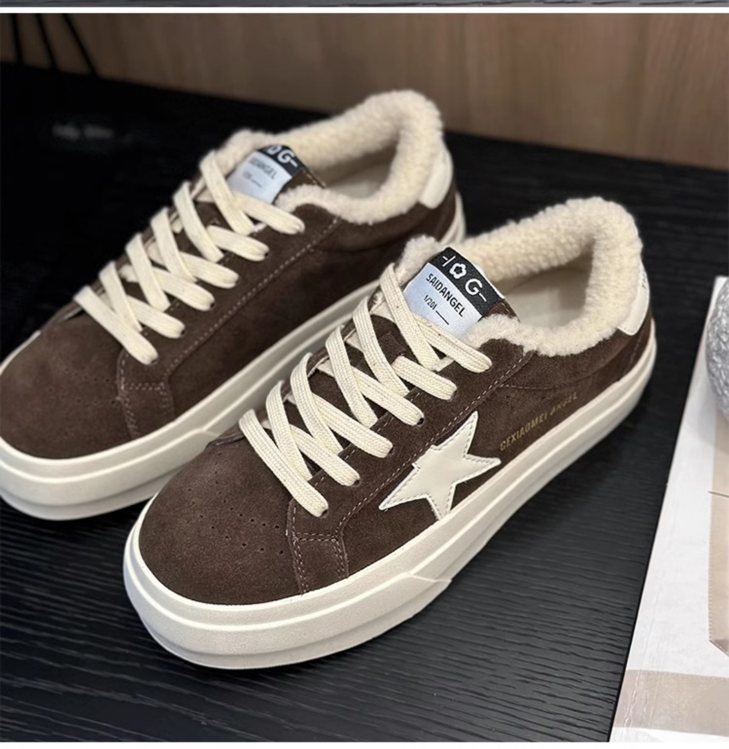 Hong Kong Genuine Leather Lamb Wool Star Shoes for Women 2025 New Winter Fleece-Lined Sports Casual Shoes Round Toe Lace-Up Sneakers