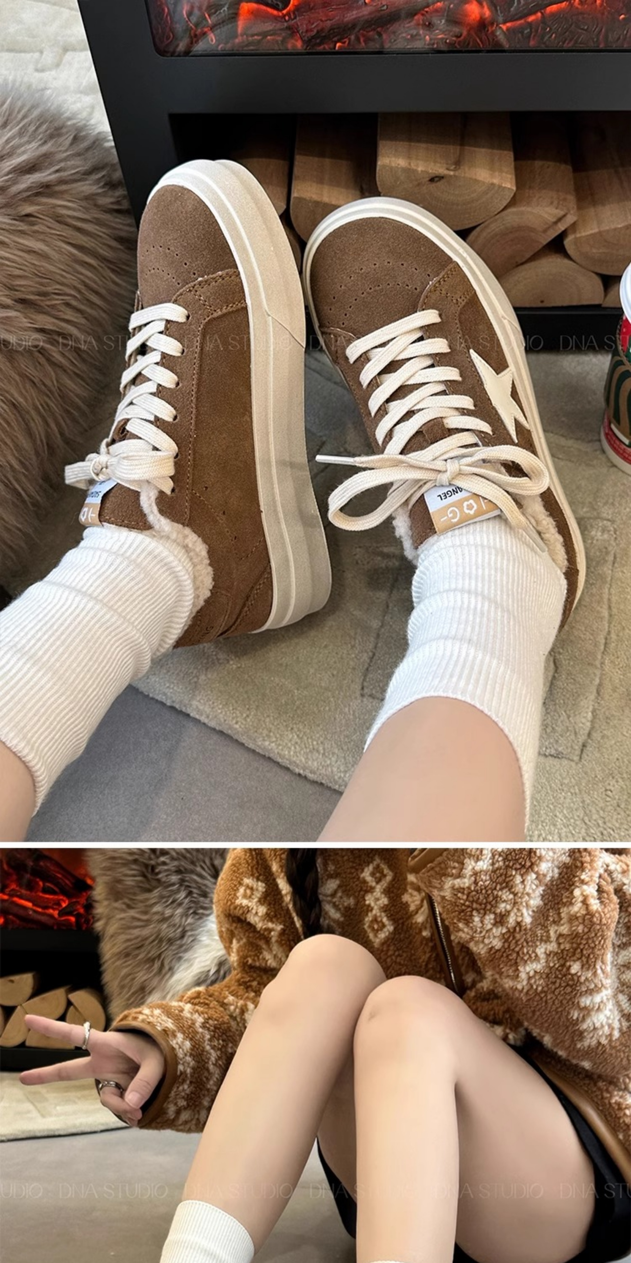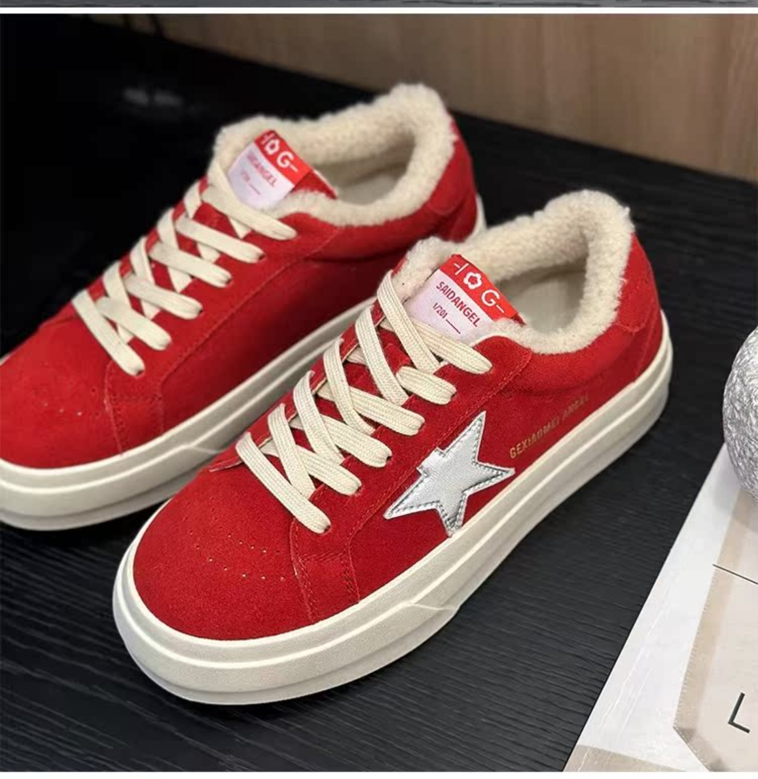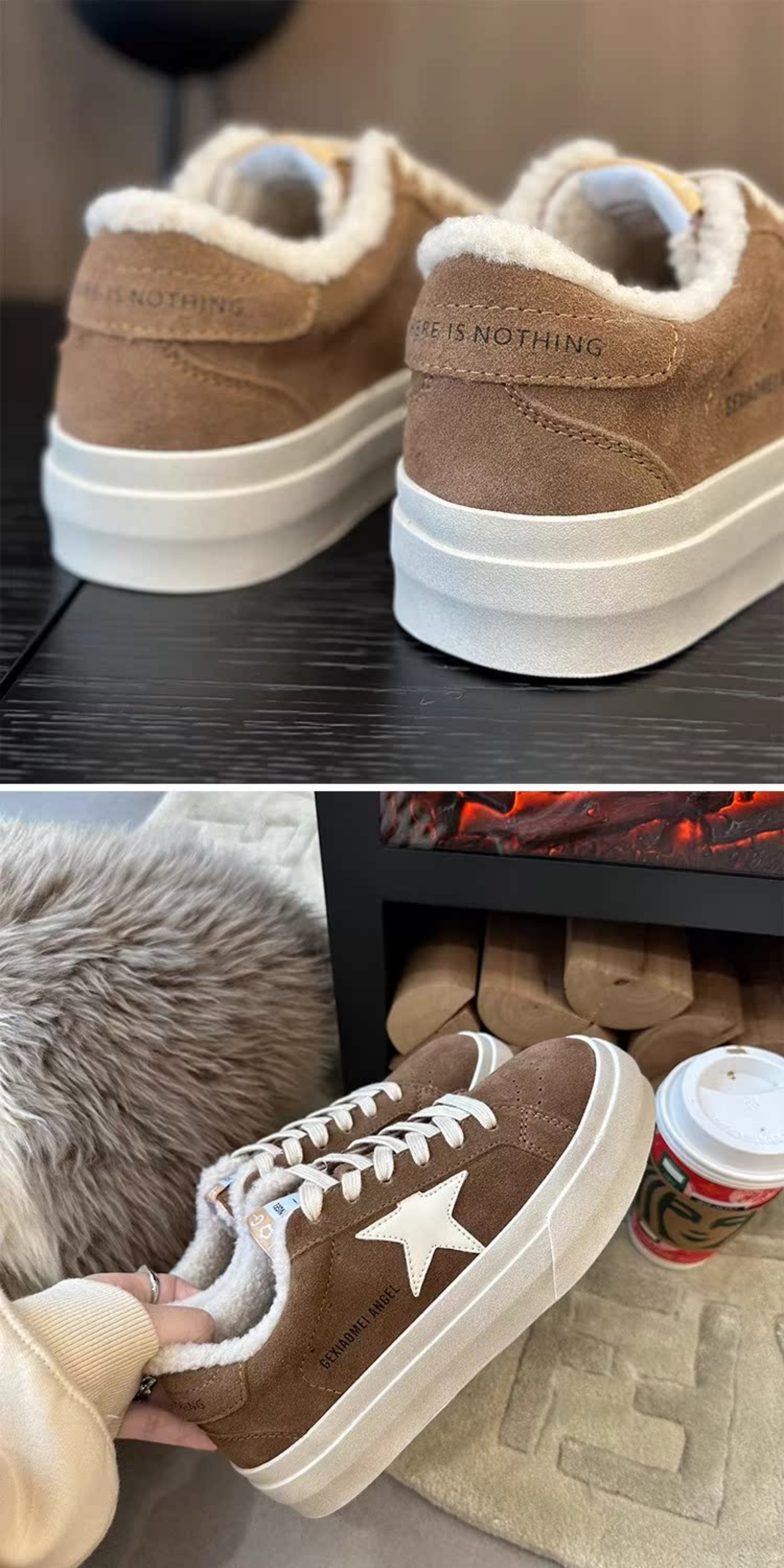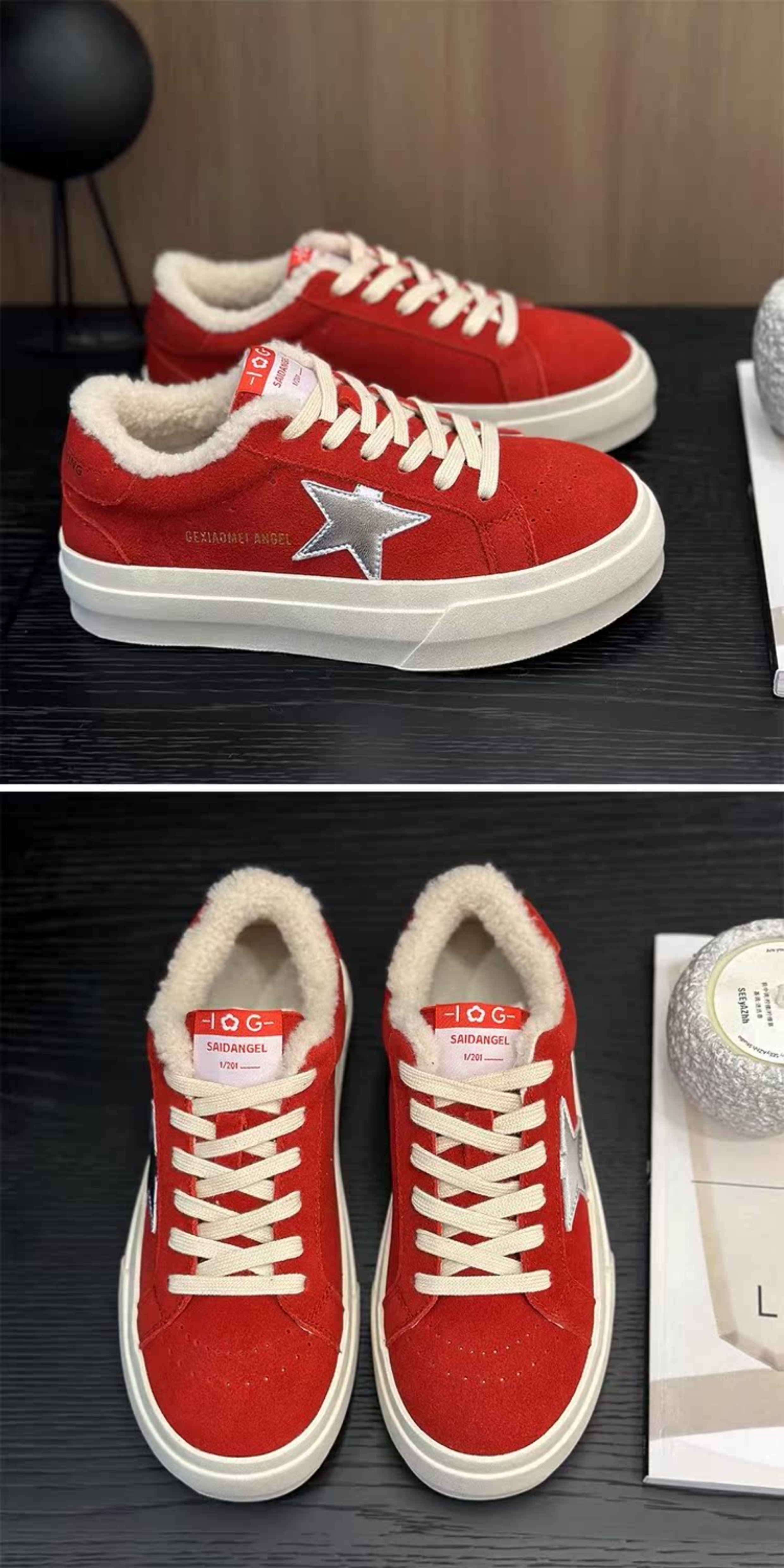 Hong Kong Genuine Leather Lamb Wool Star Shoes for Women 2025 New Winter Fleece-Lined Sports Casual Shoes Round Toe Lace-Up Sneakers