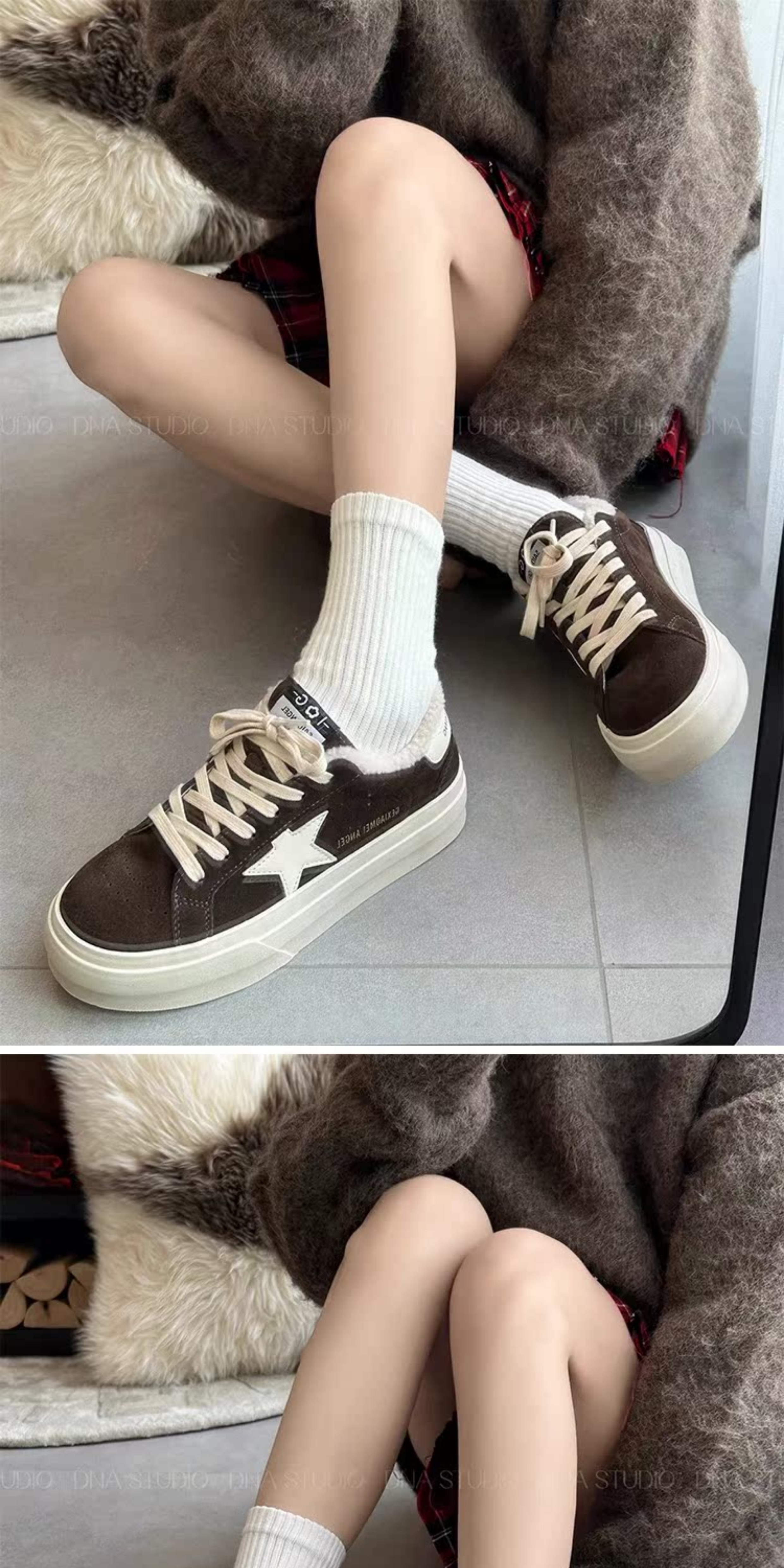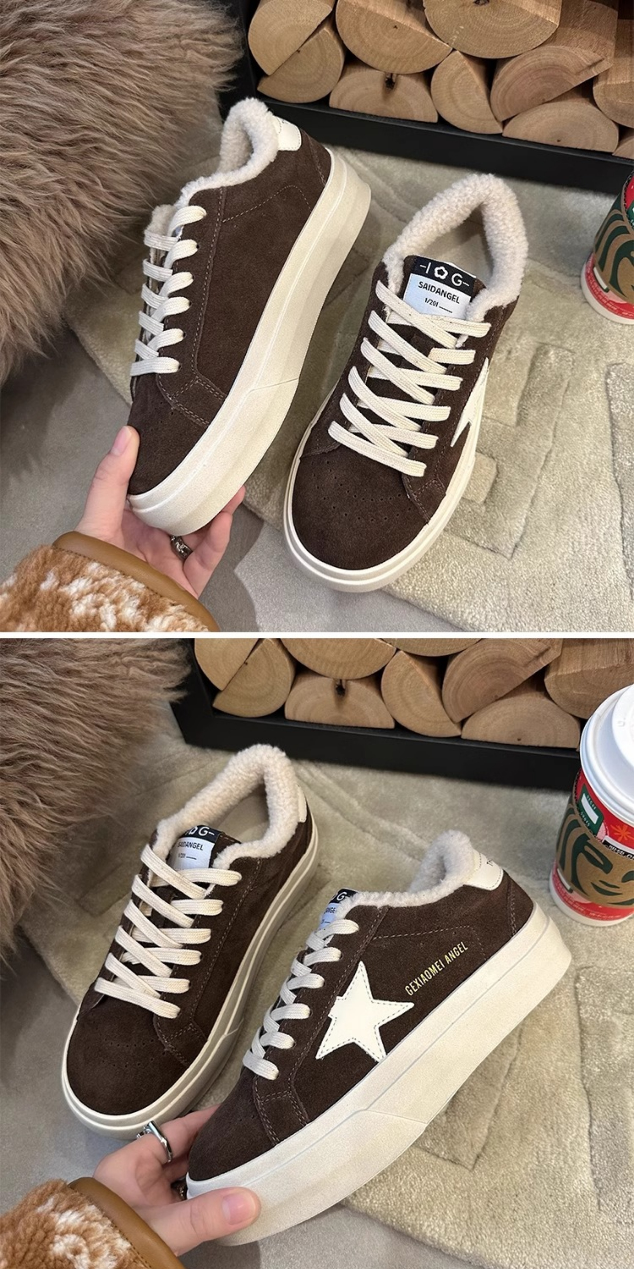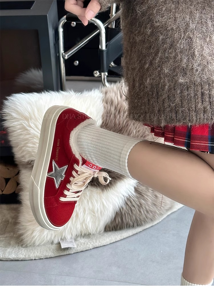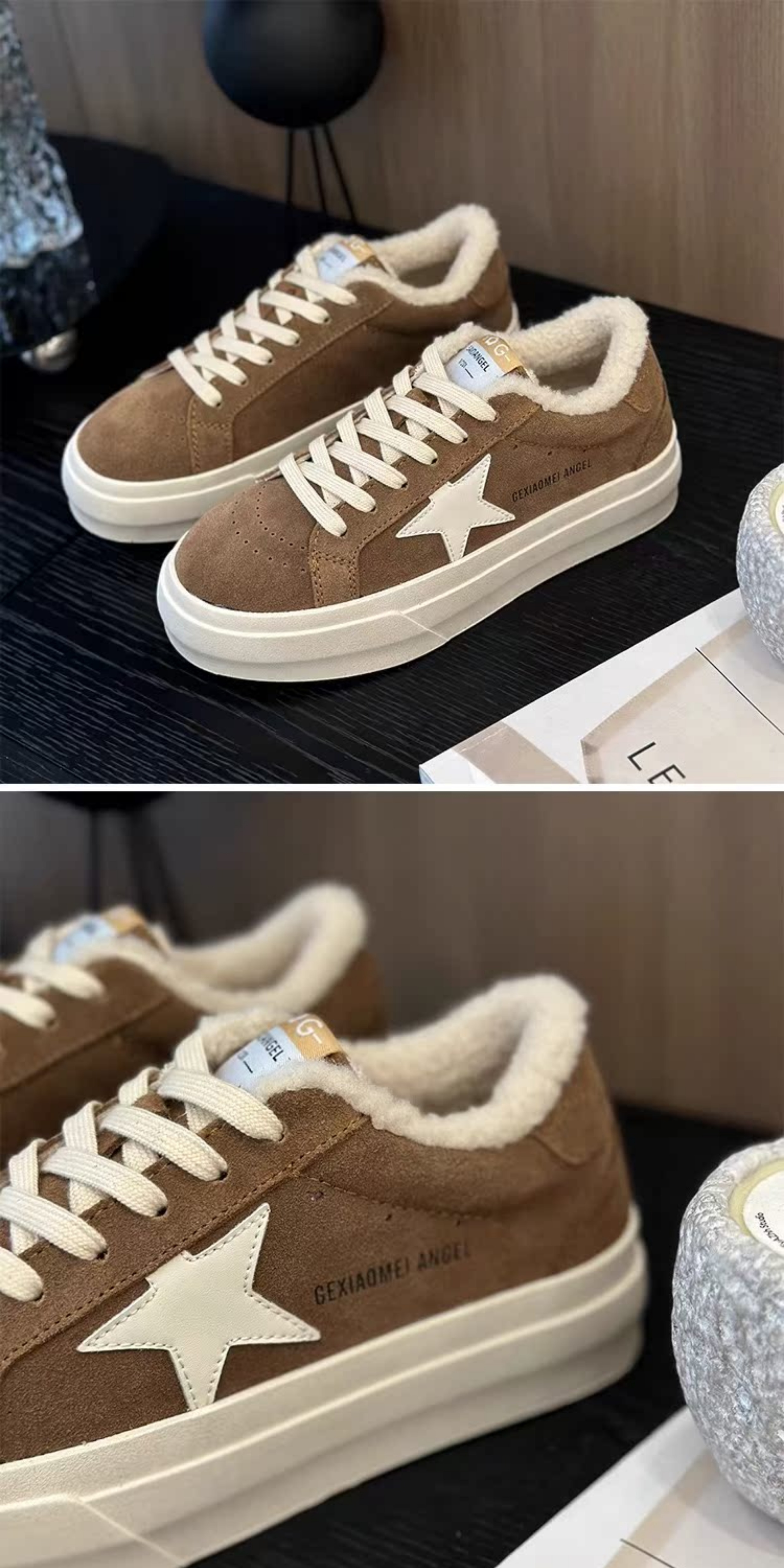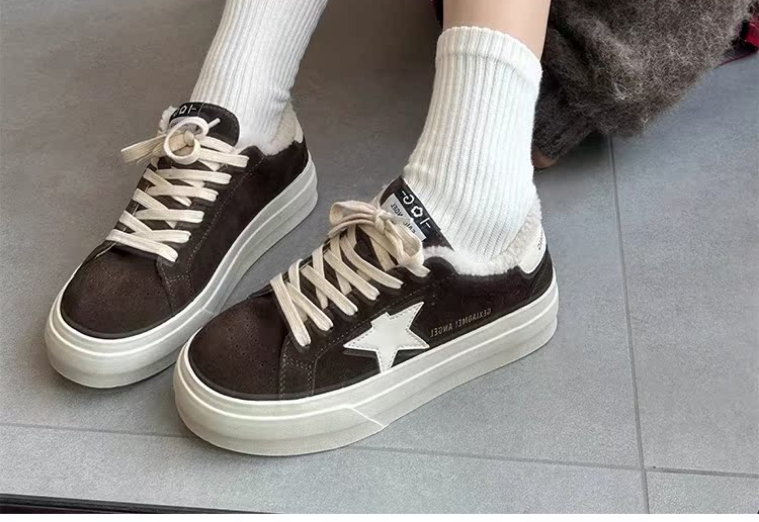Hong Kong Genuine Leather Lamb Wool Star Shoes for Women 2025 New Winter Fleece-Lined Sports Casual Shoes Round Toe Lace-Up Sneakers