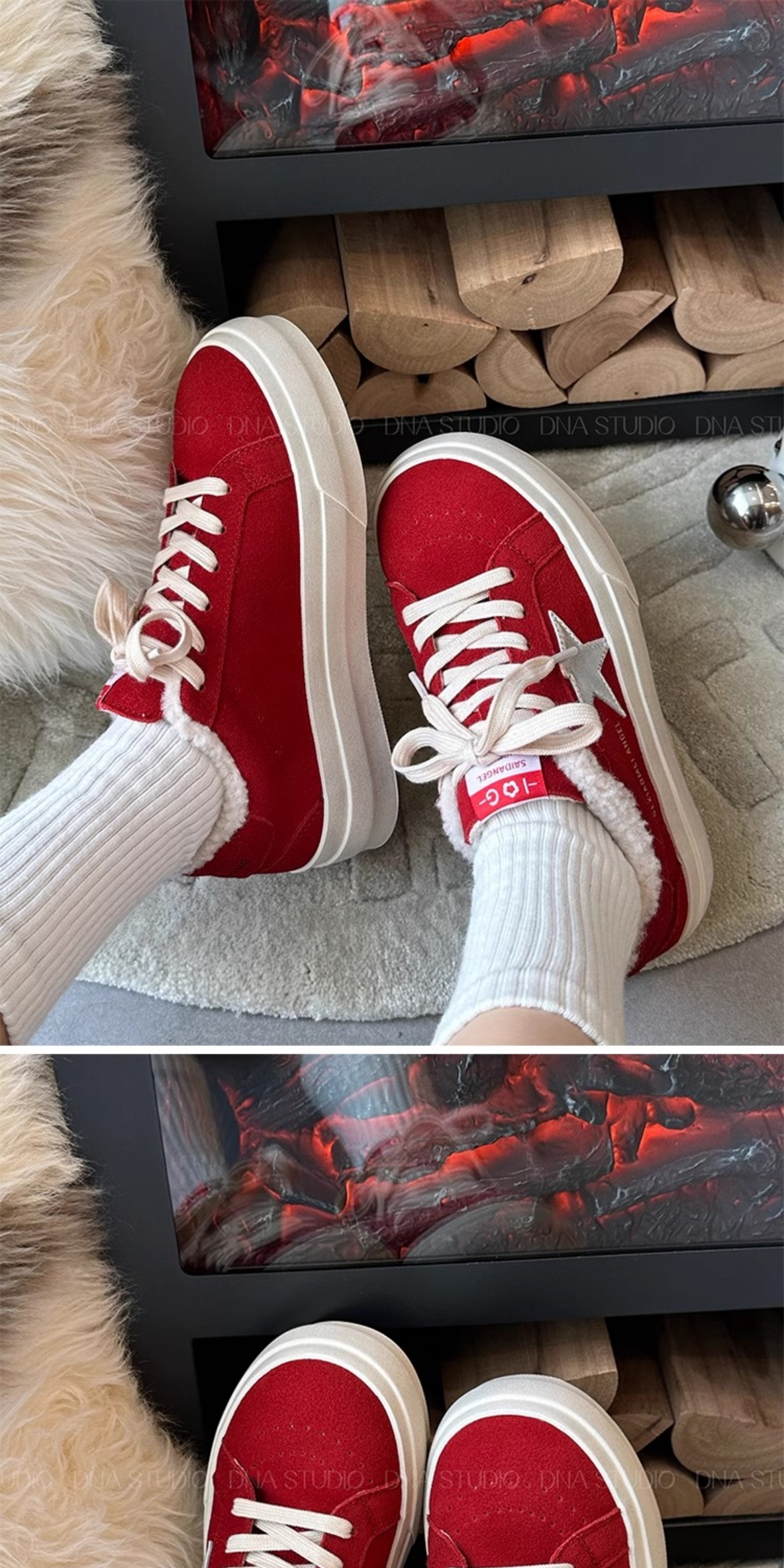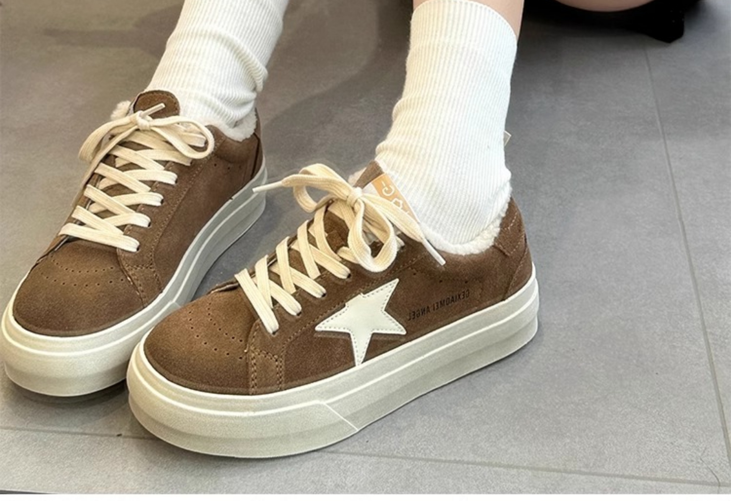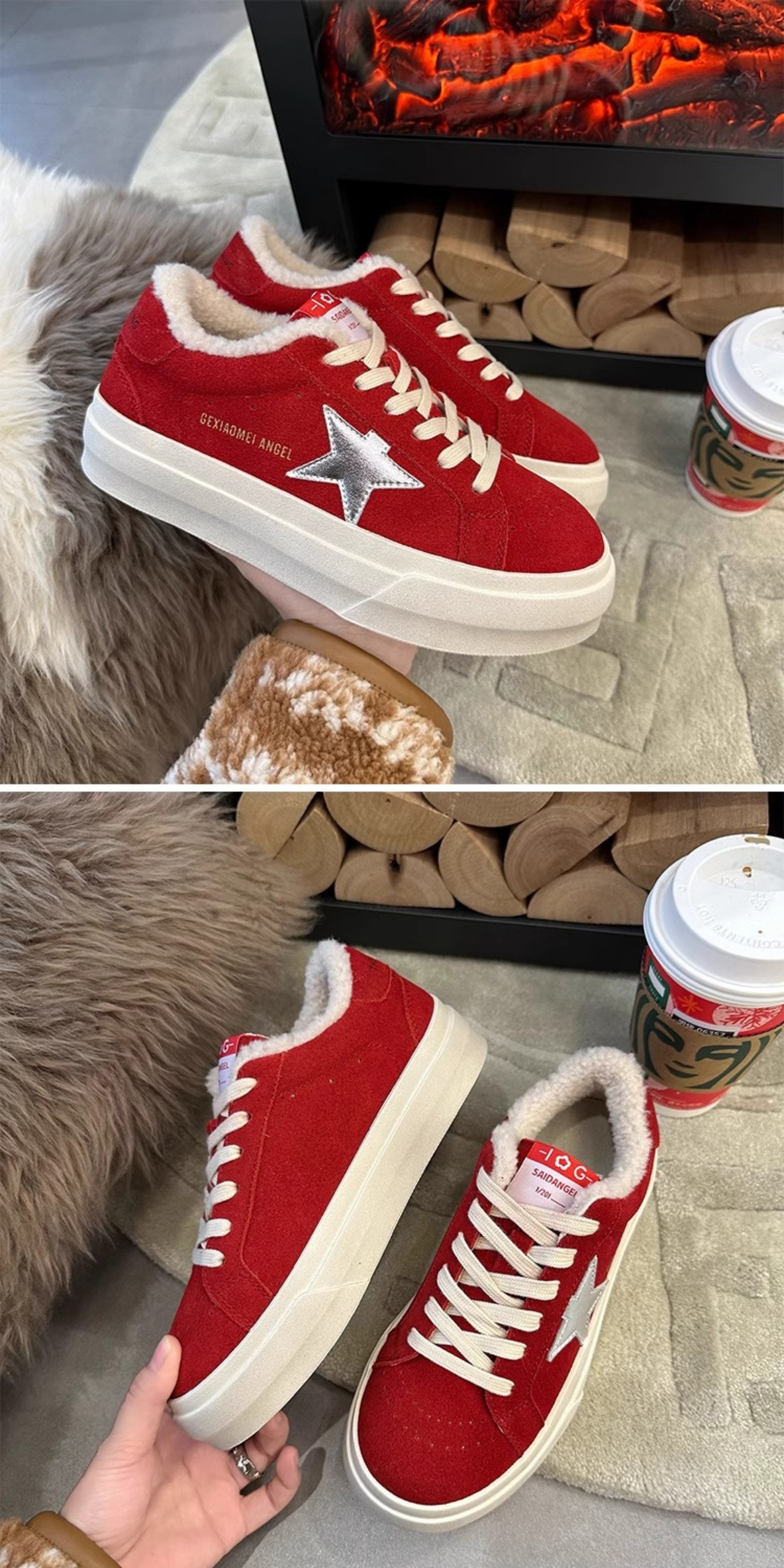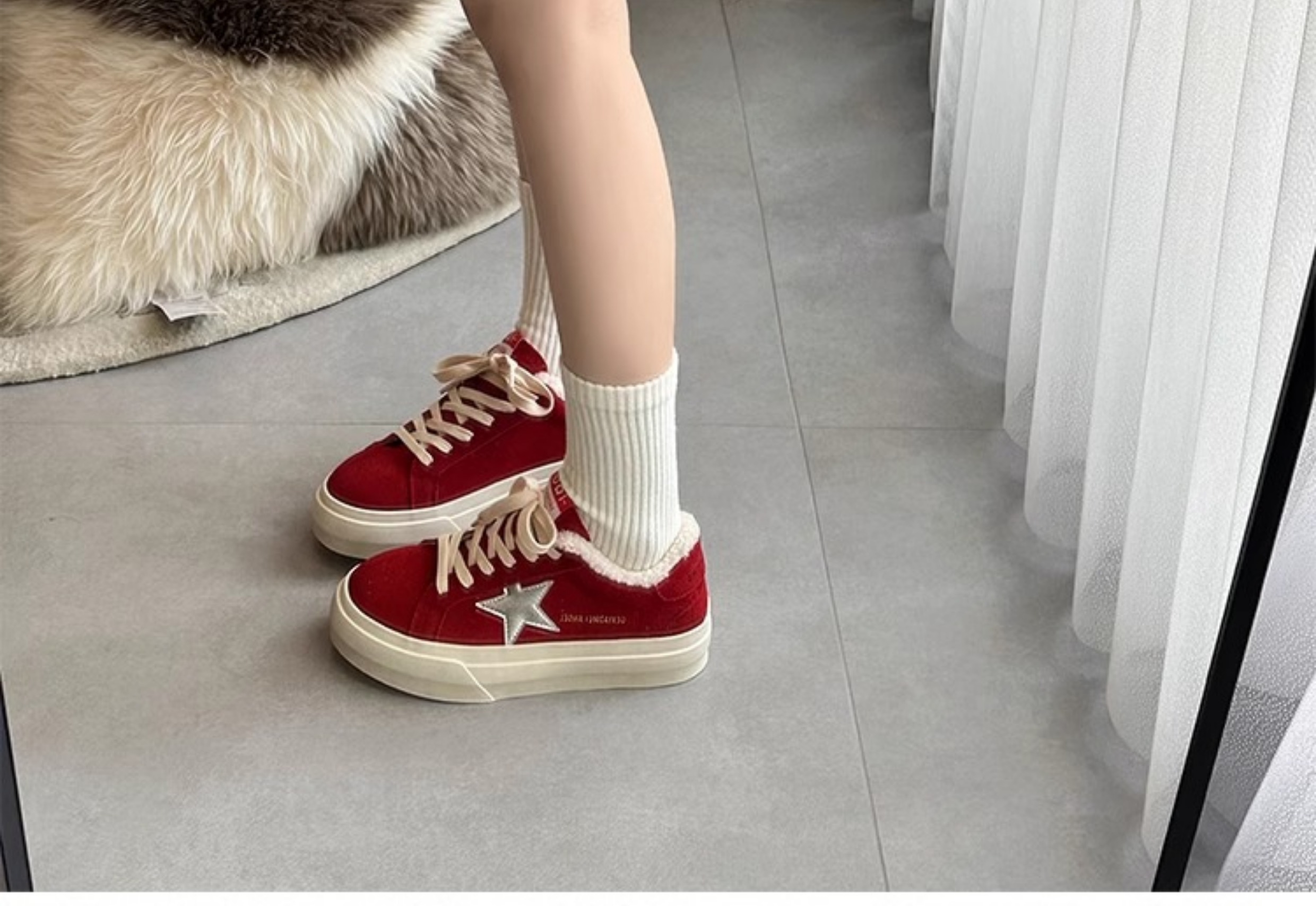 Hong Kong Genuine Leather Lamb Wool Star Shoes for Women 2025 New Winter Fleece-Lined Sports Casual Shoes Round Toe Lace-Up Sneakers