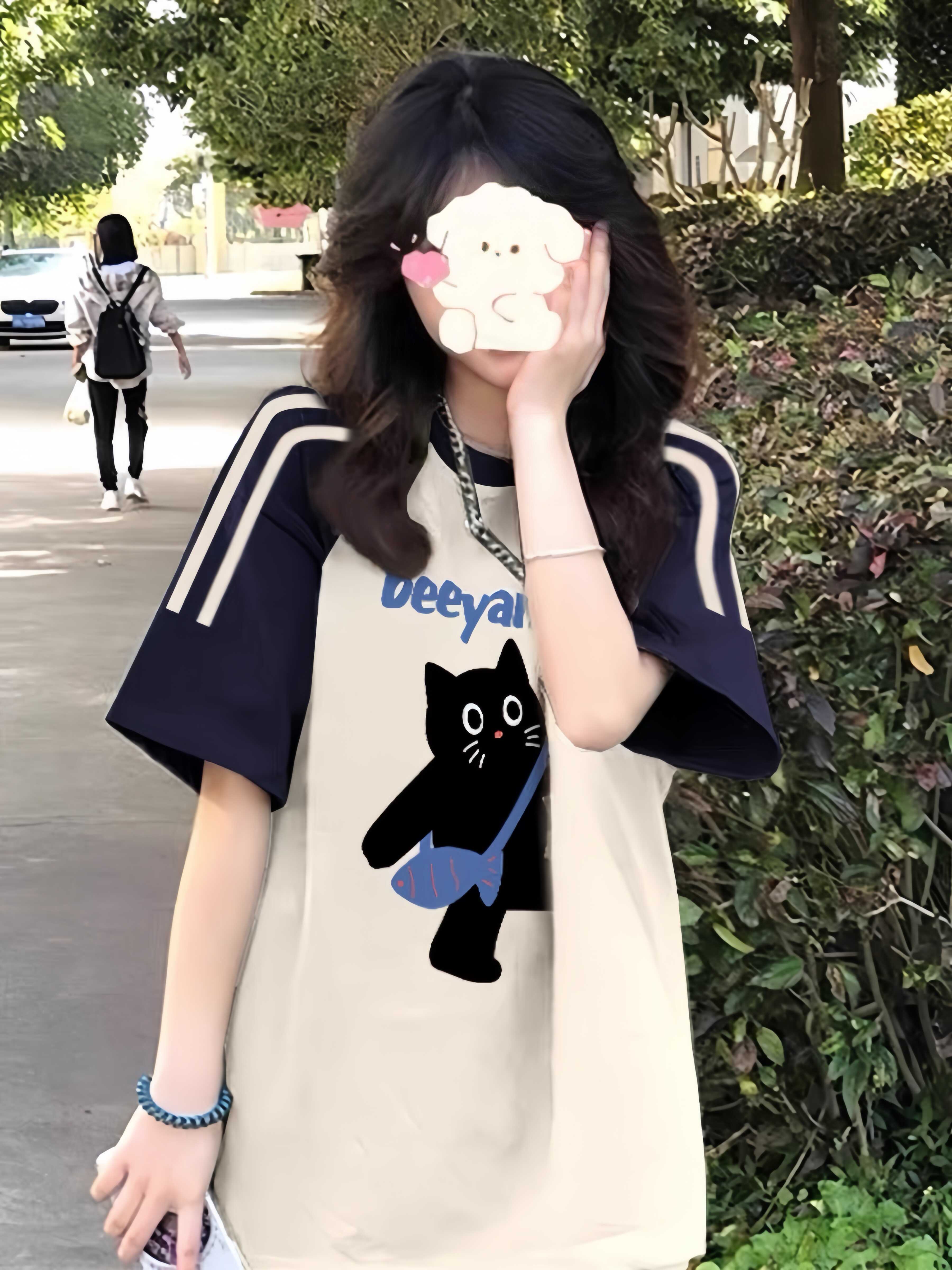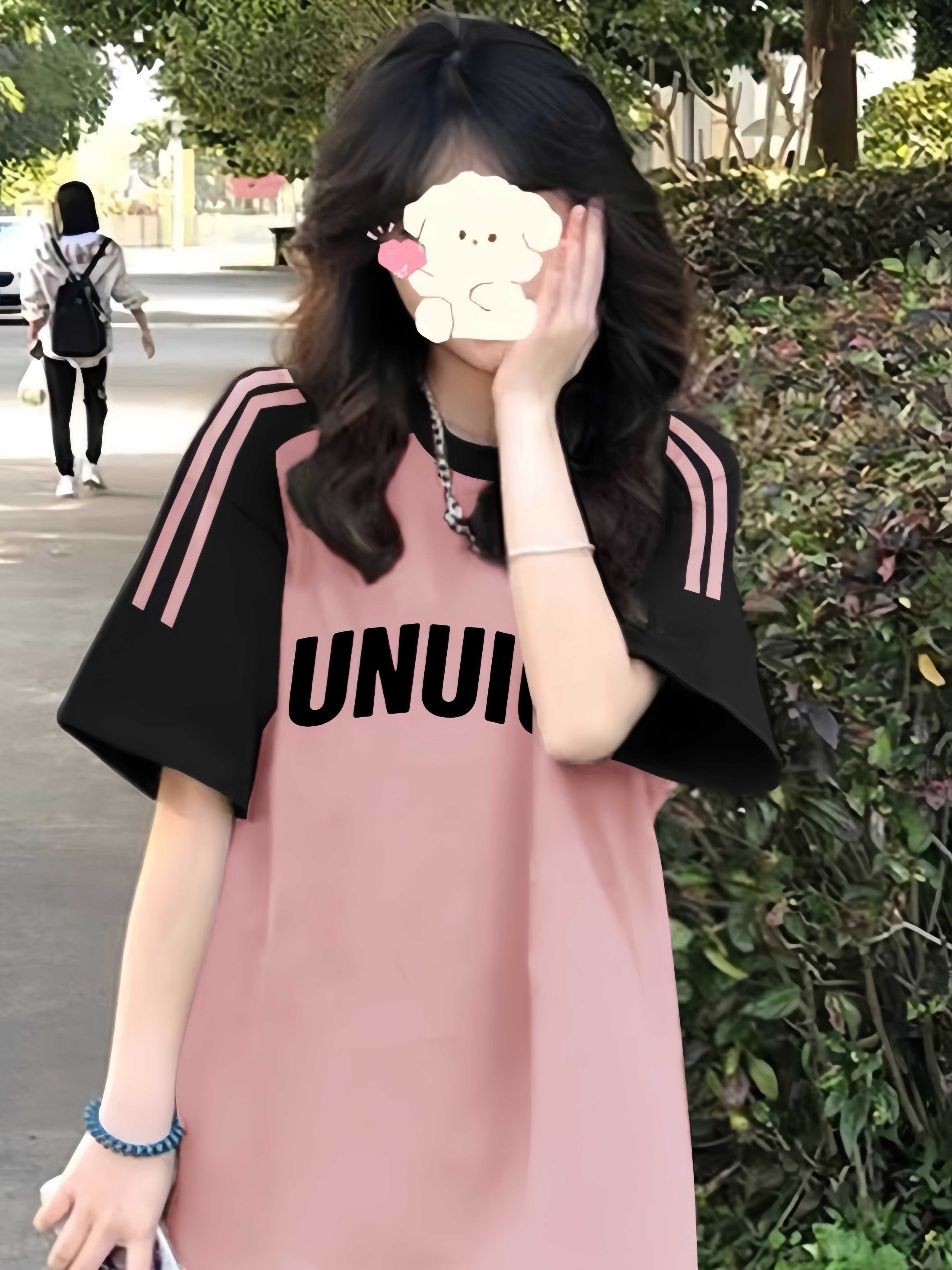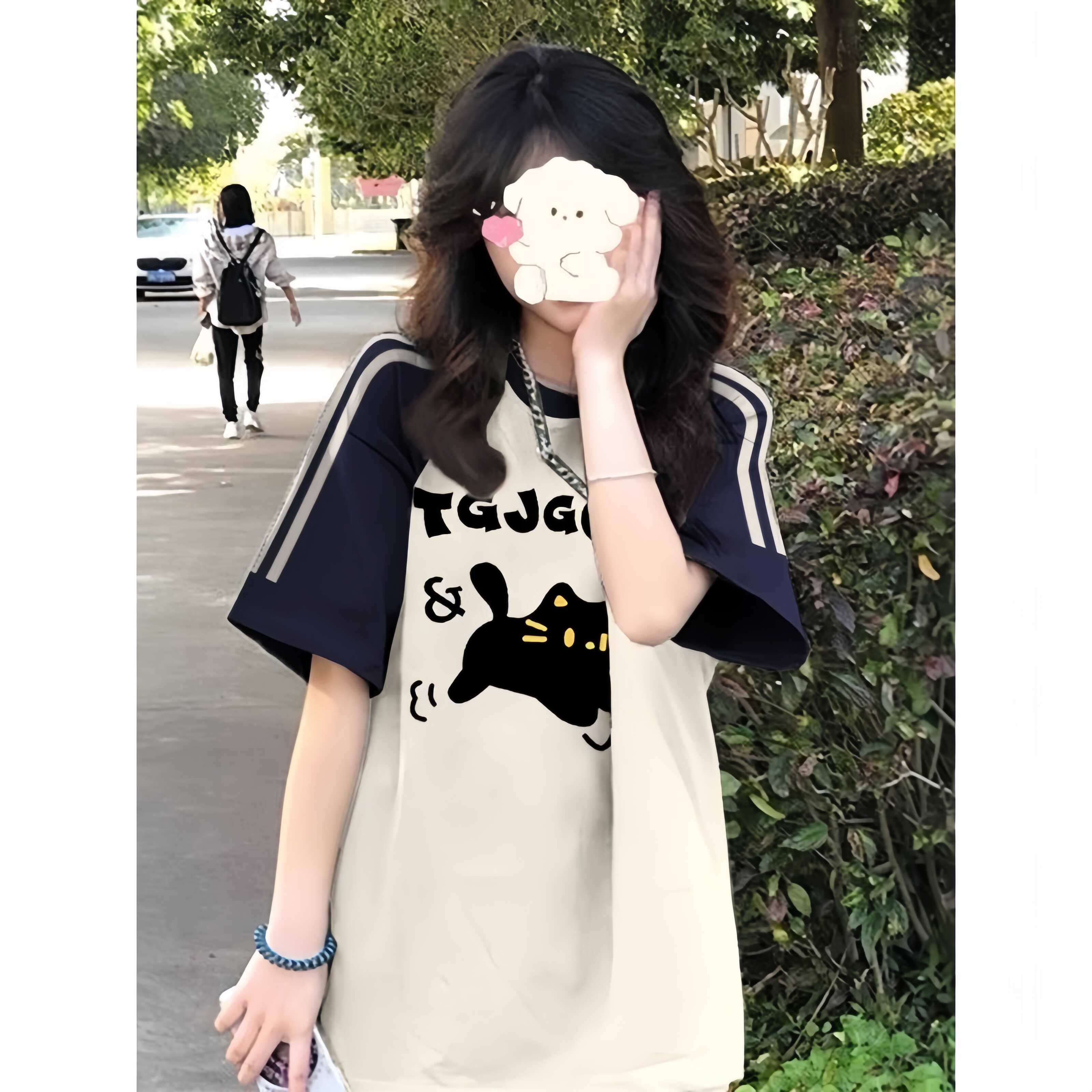American Retro Three-Stripe Raglan Short-Sleeve T-Shirt for Girls, Summer Loose Half-Sleeve Top for Middle and High School Students