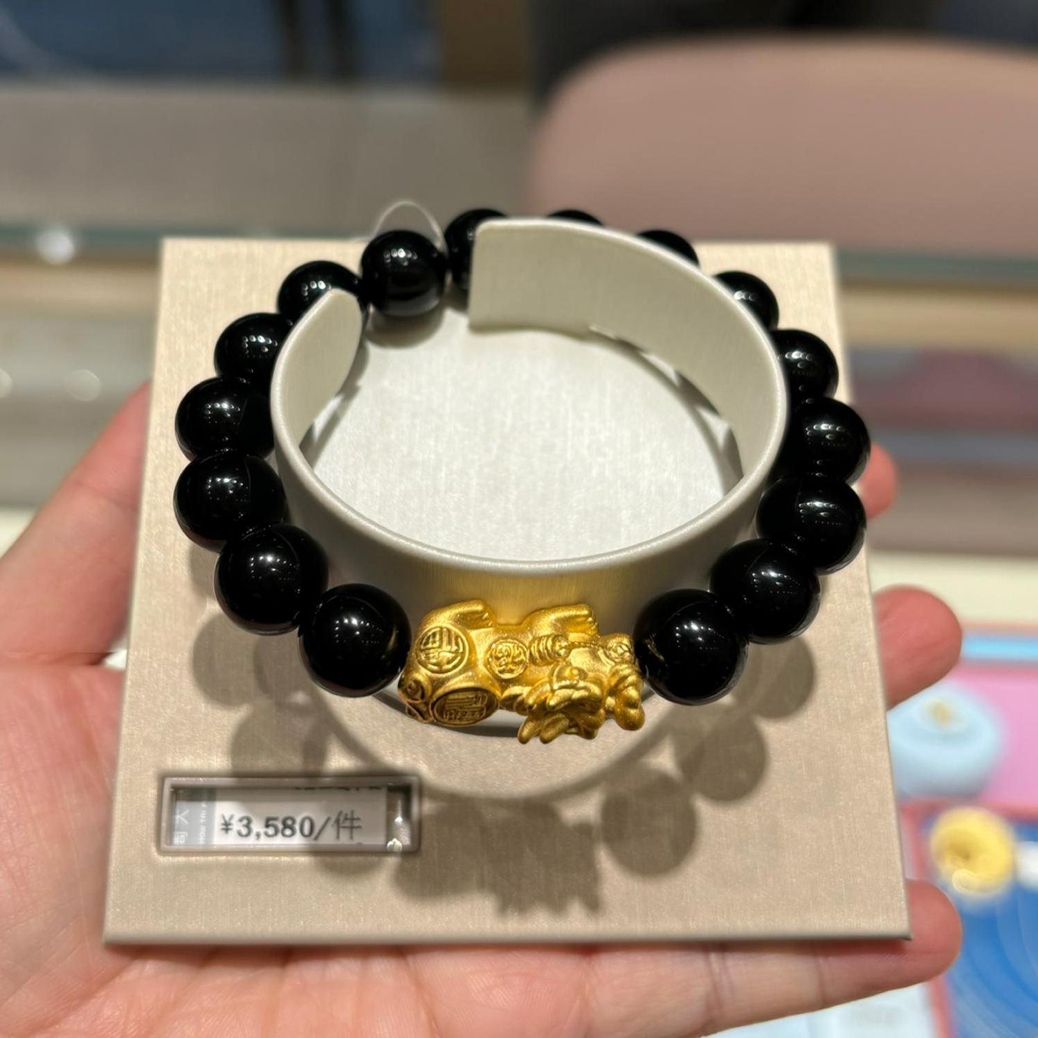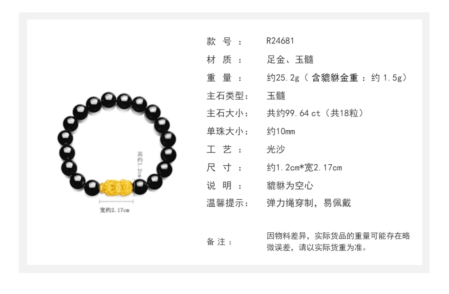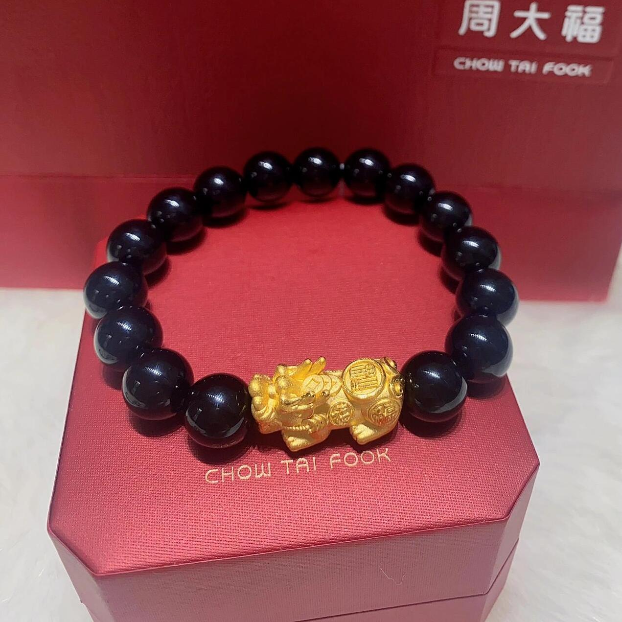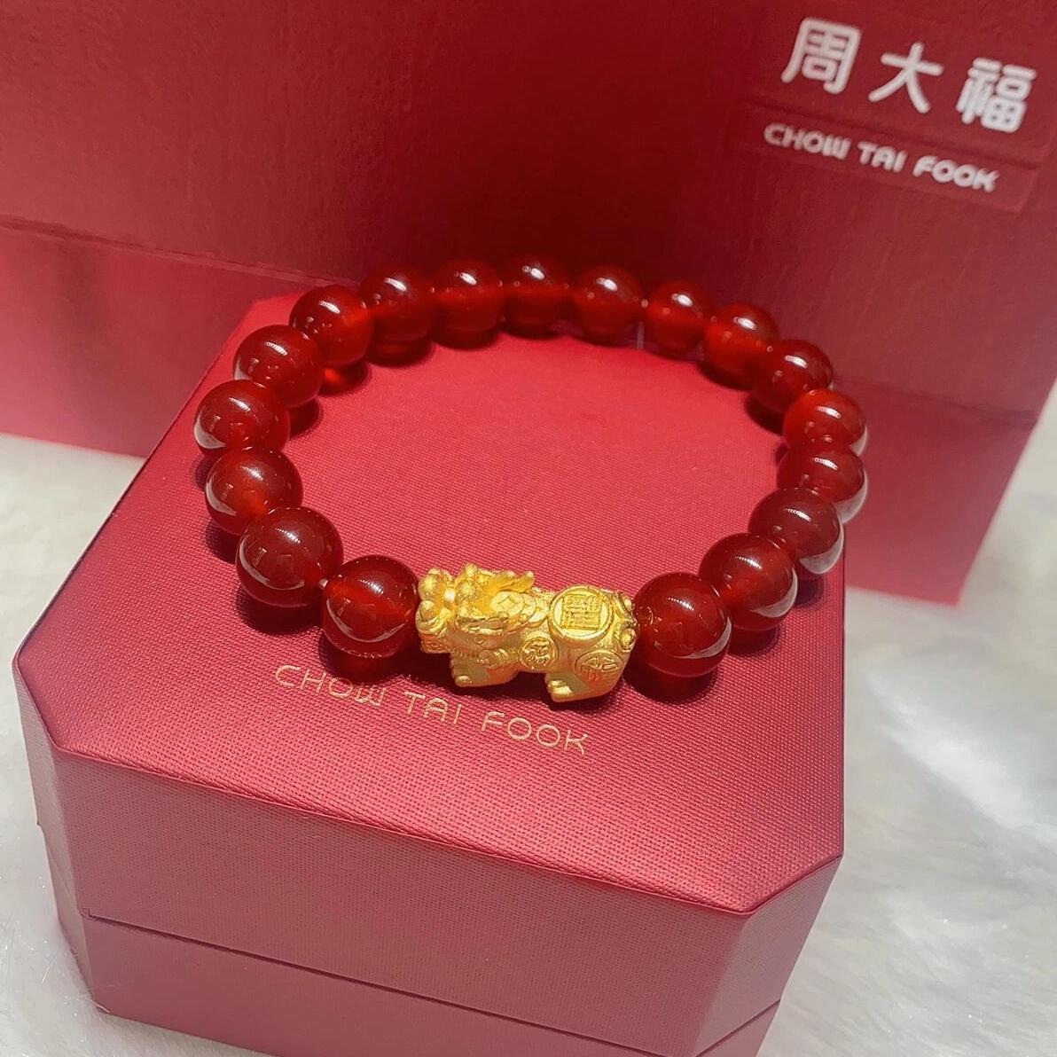 Chow Tai Fook's New Model, Ruyi Yuanbao with the Character for Fortune, Pixiu Gold Transfer Bead, Black and Red Agate Bracelet, Pure Gold R24672