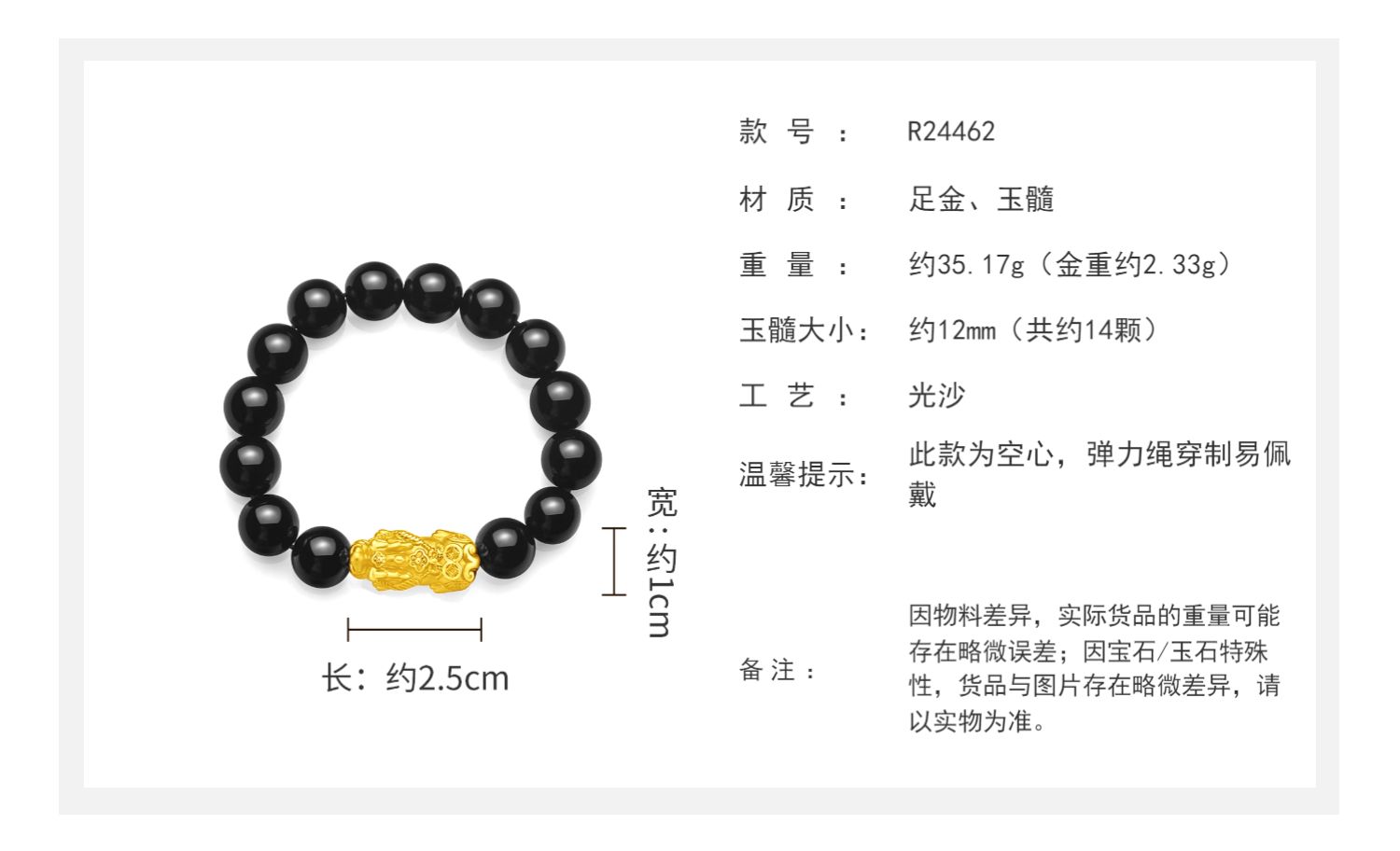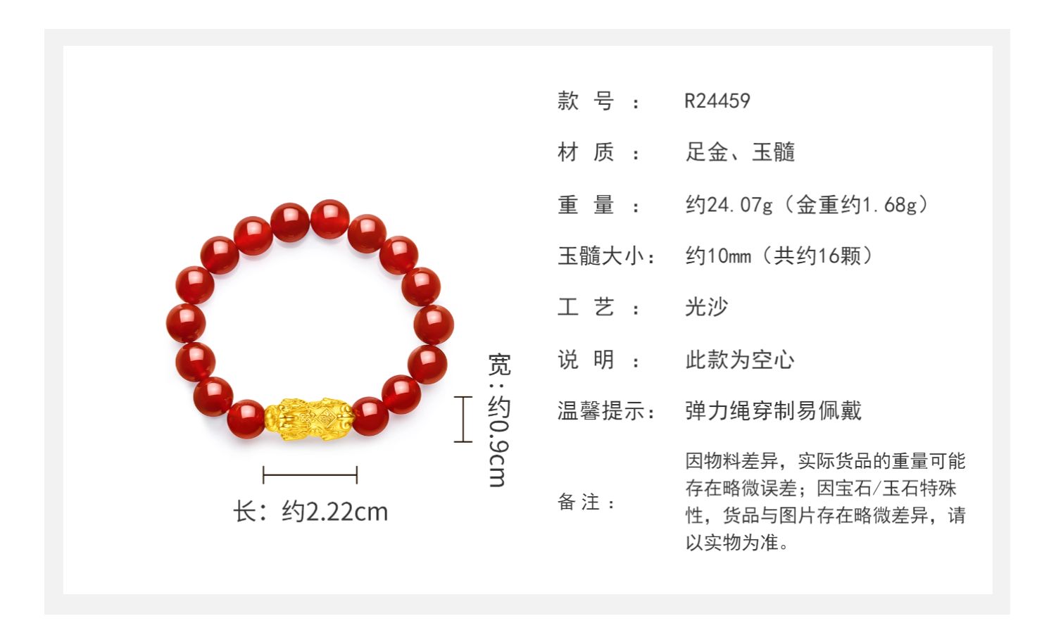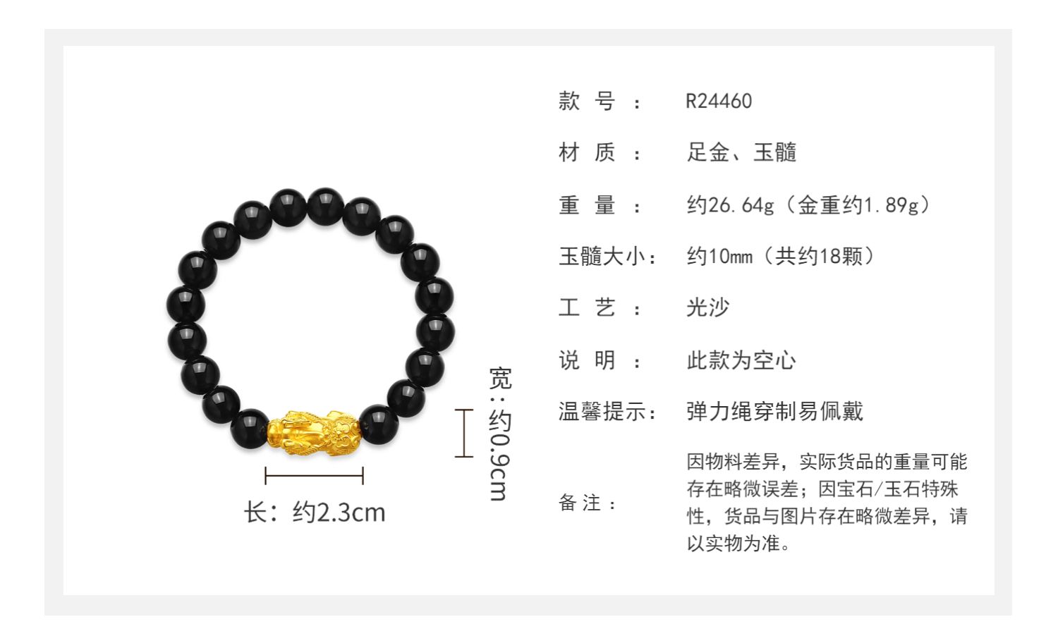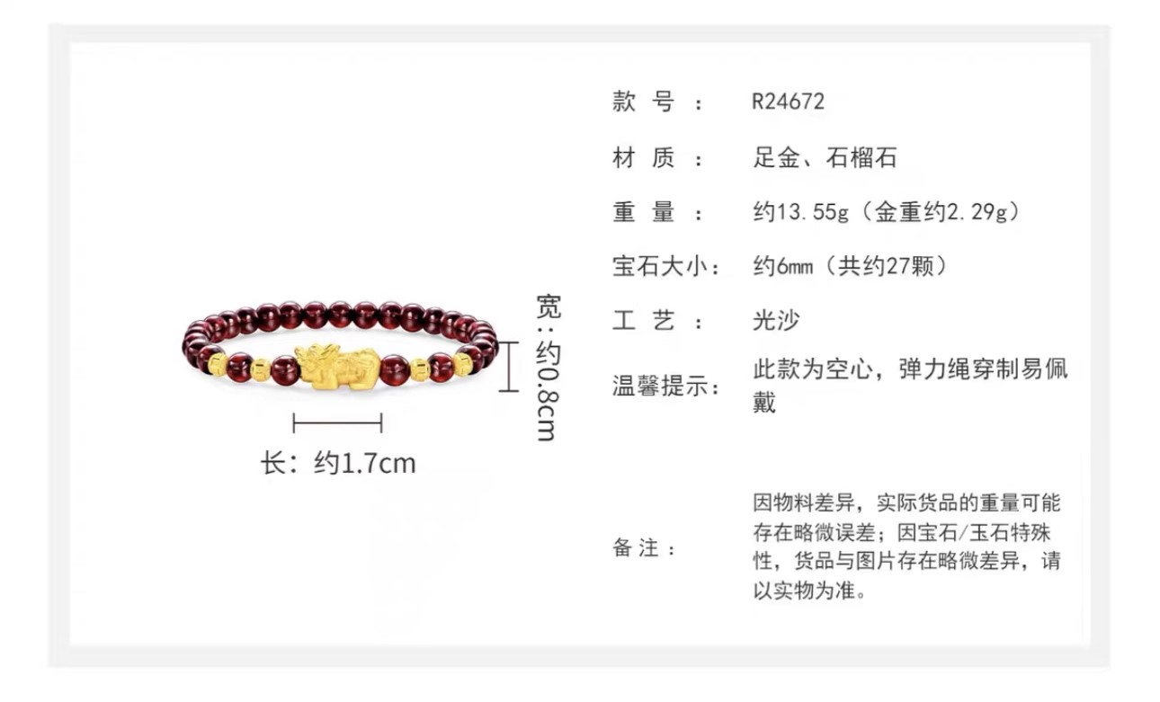 Chow Tai Fook's New Model, Ruyi Yuanbao with the Character for Fortune, Pixiu Gold Transfer Bead, Black and Red Agate Bracelet, Pure Gold R24672