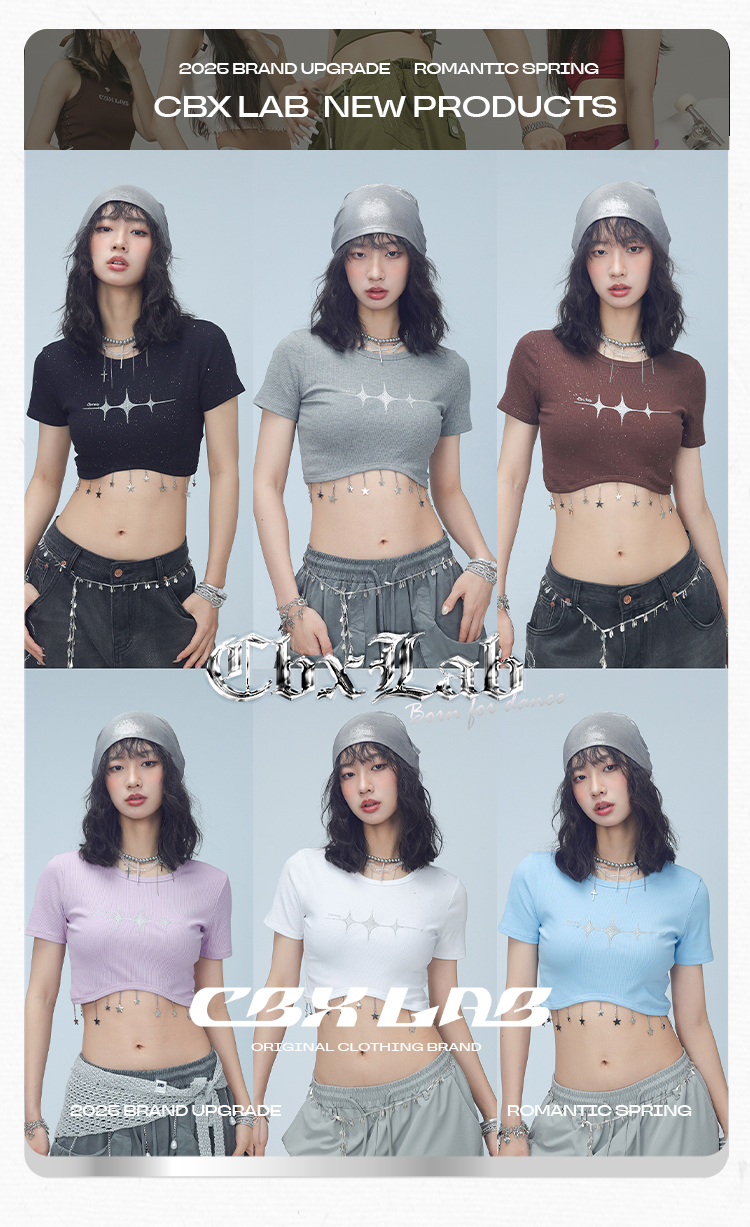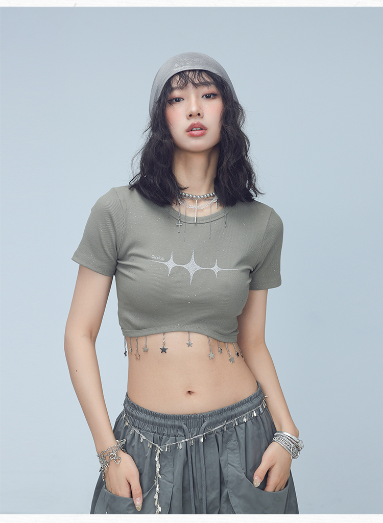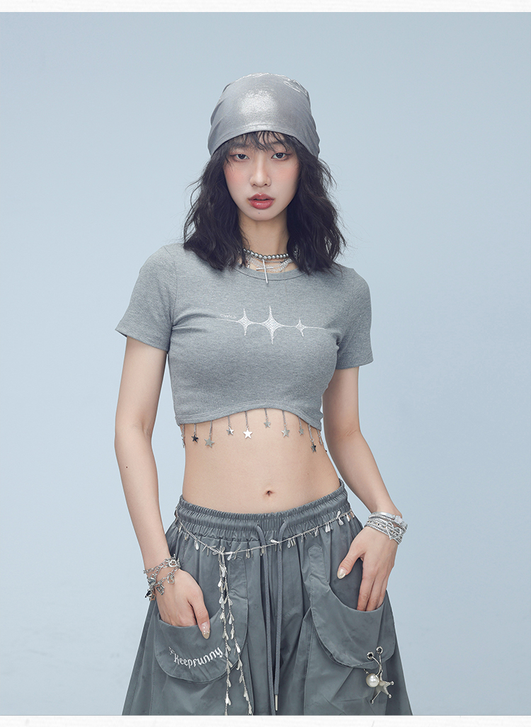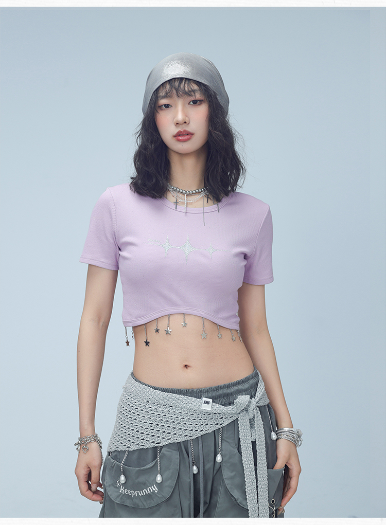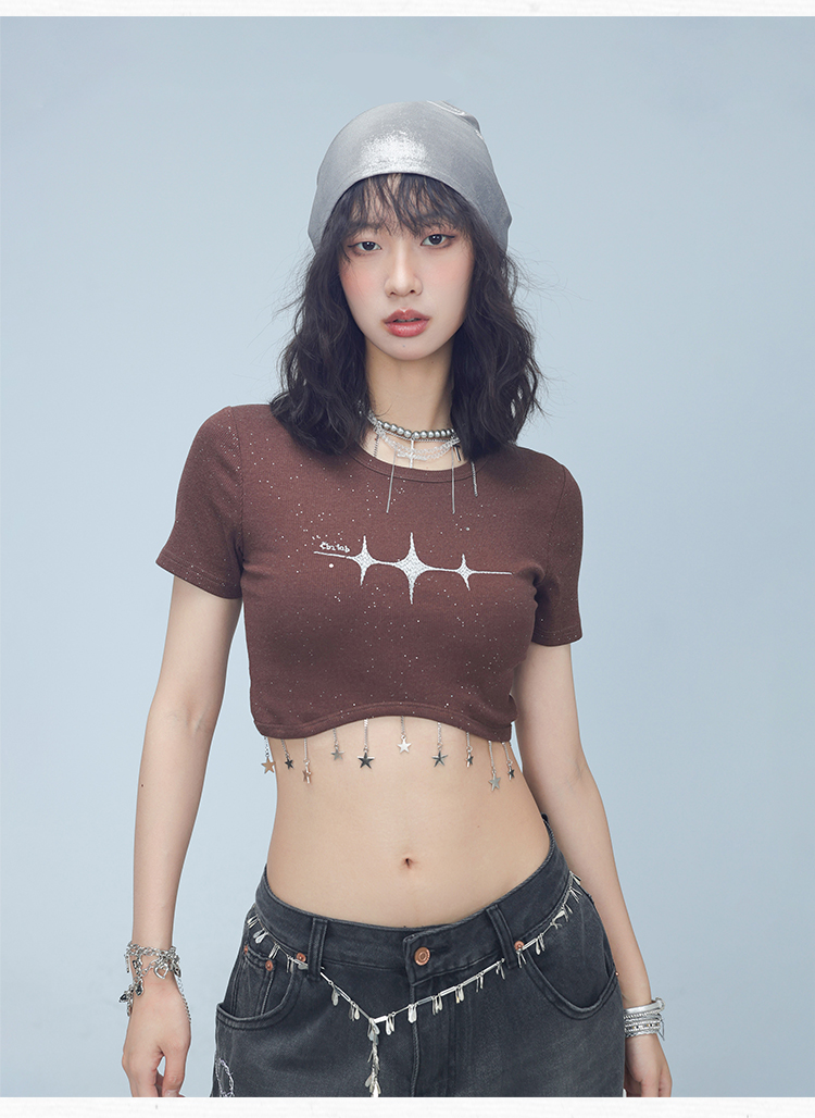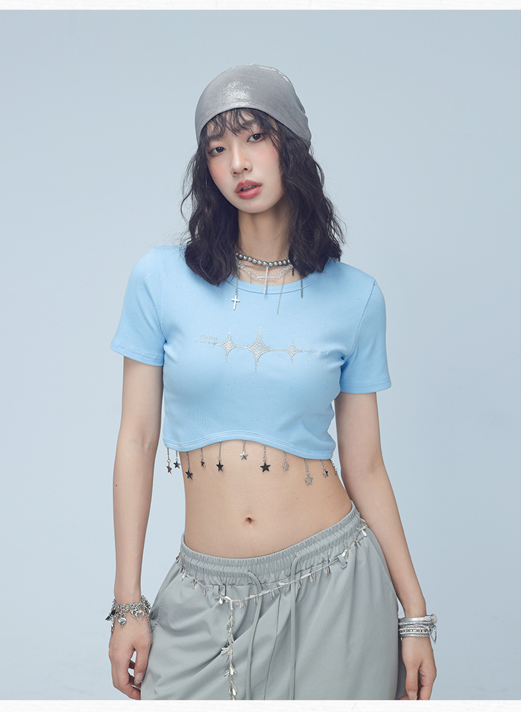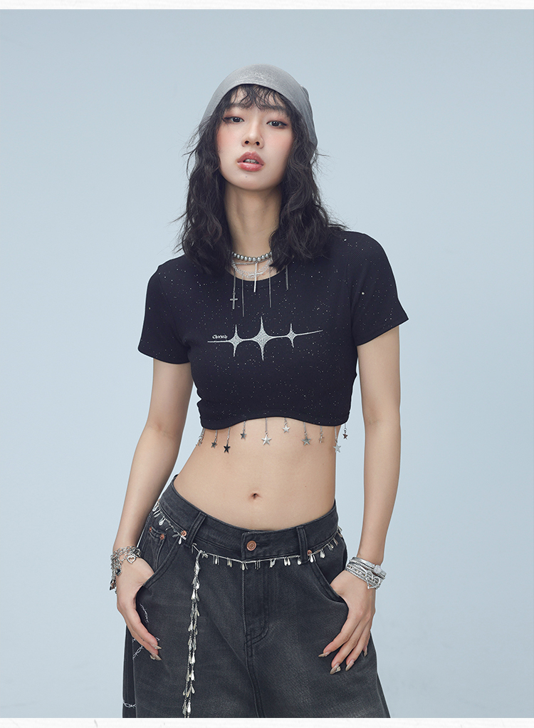 Cbxlab Street Dance Trendy Brand Summer Wave Crop Top Embroidered Short-Sleeve Star Chain Kpop Spicy Girl Slim Fit Top for Women