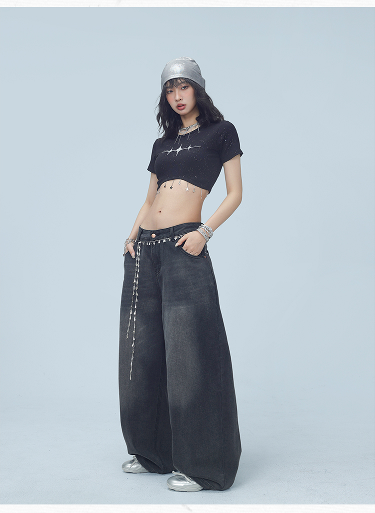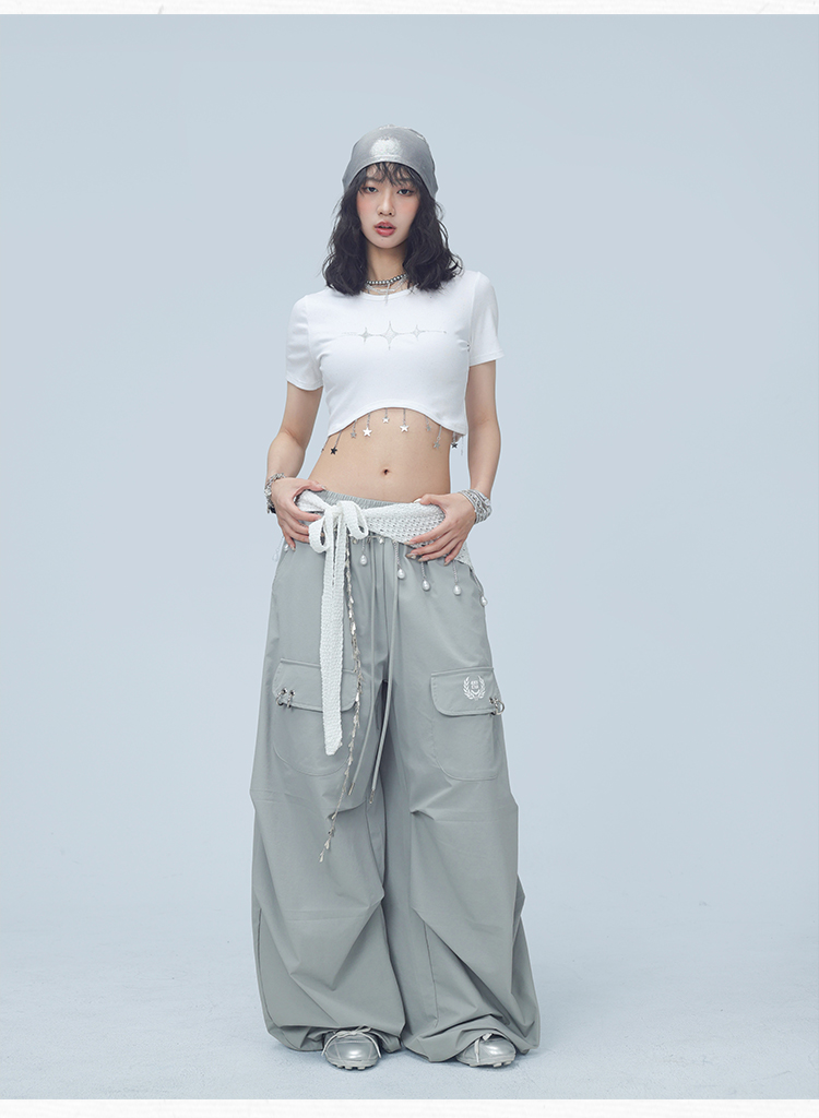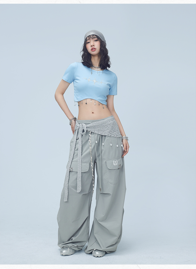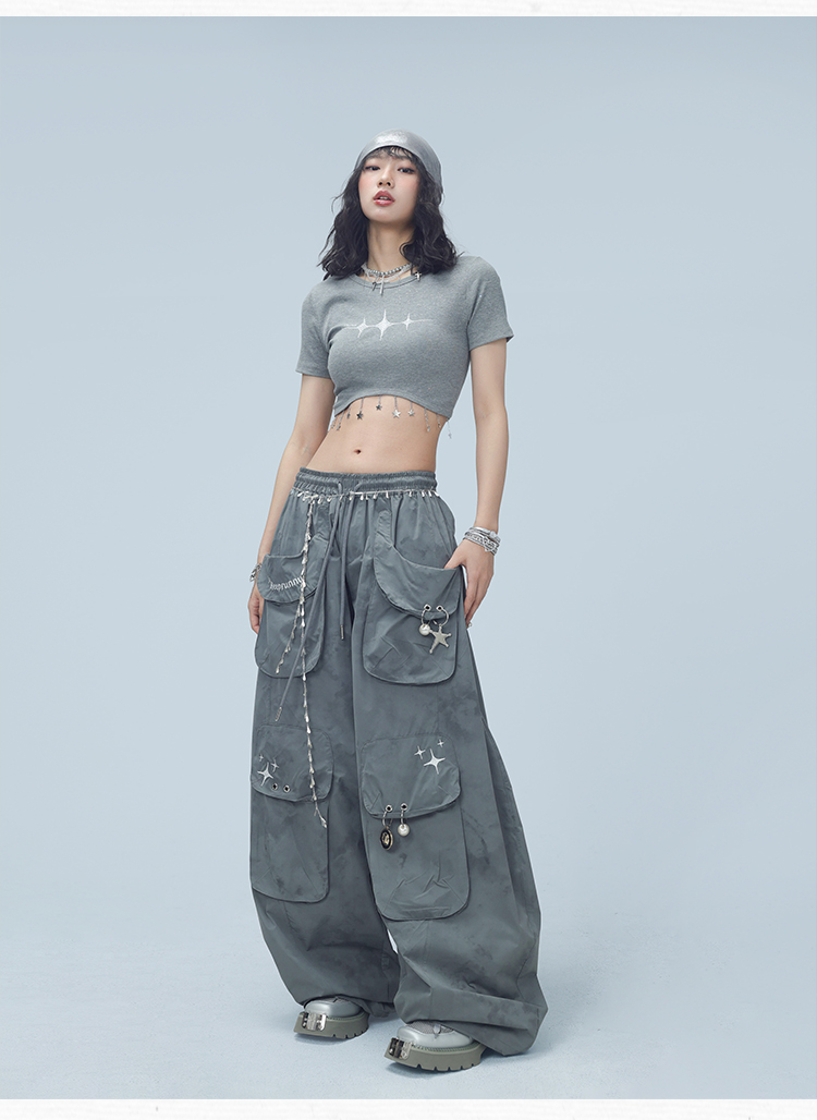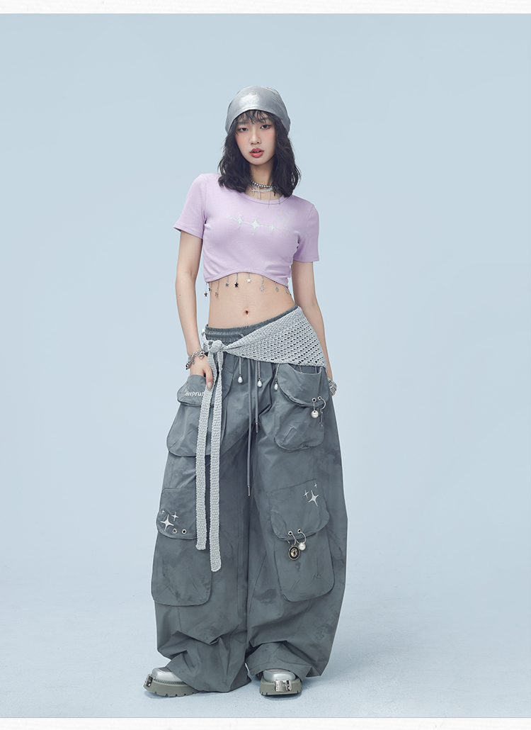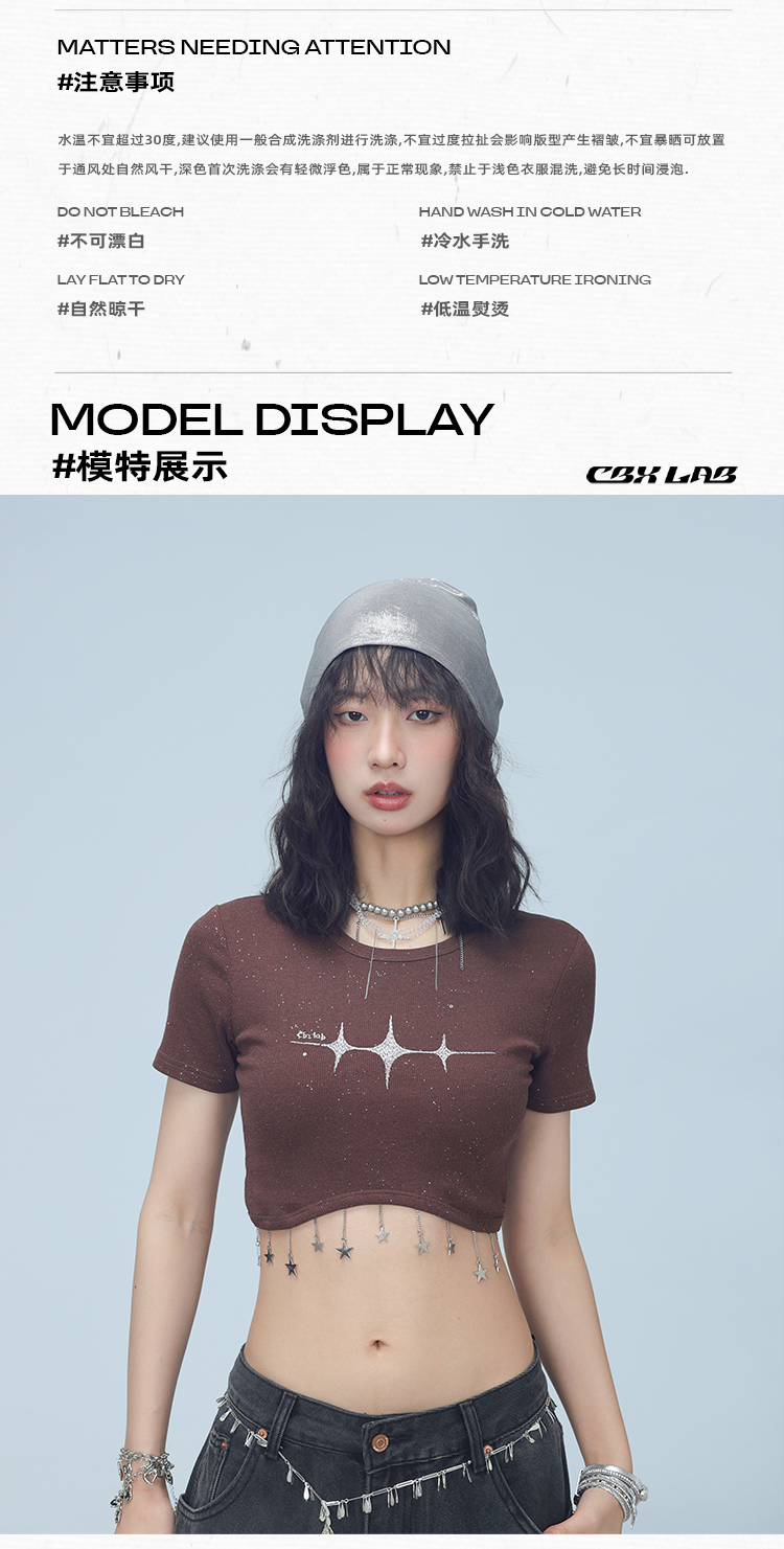 Cbxlab Street Dance Trendy Brand Summer Wave Crop Top Embroidered Short-Sleeve Star Chain Kpop Spicy Girl Slim Fit Top for Women