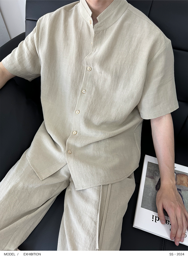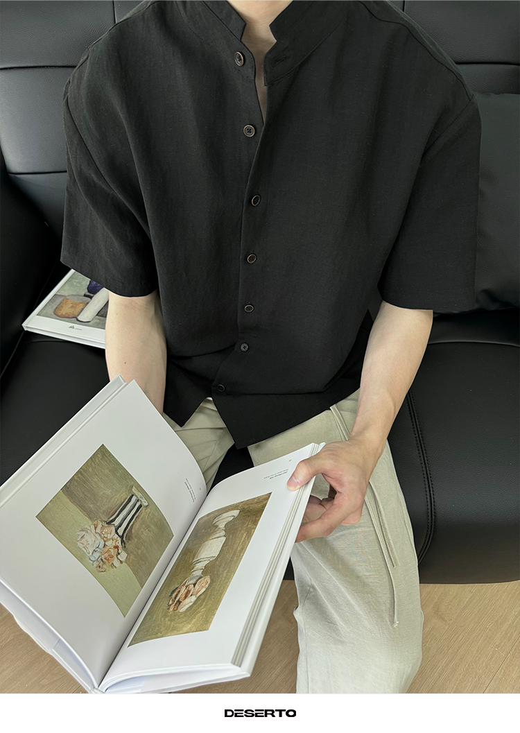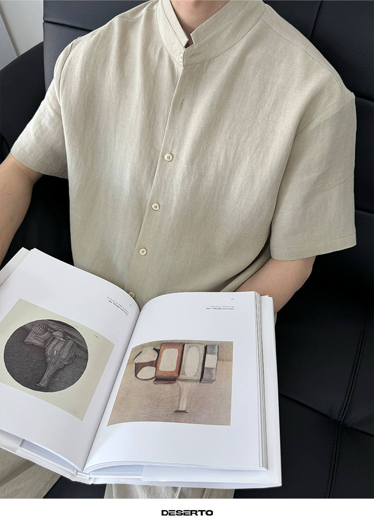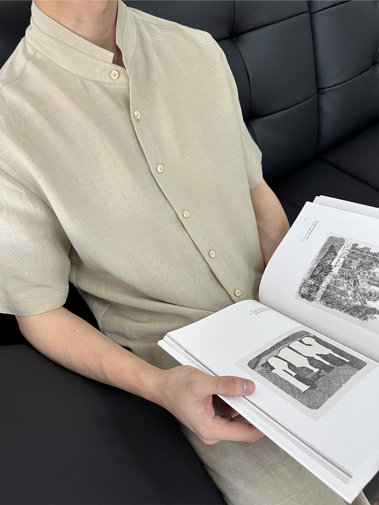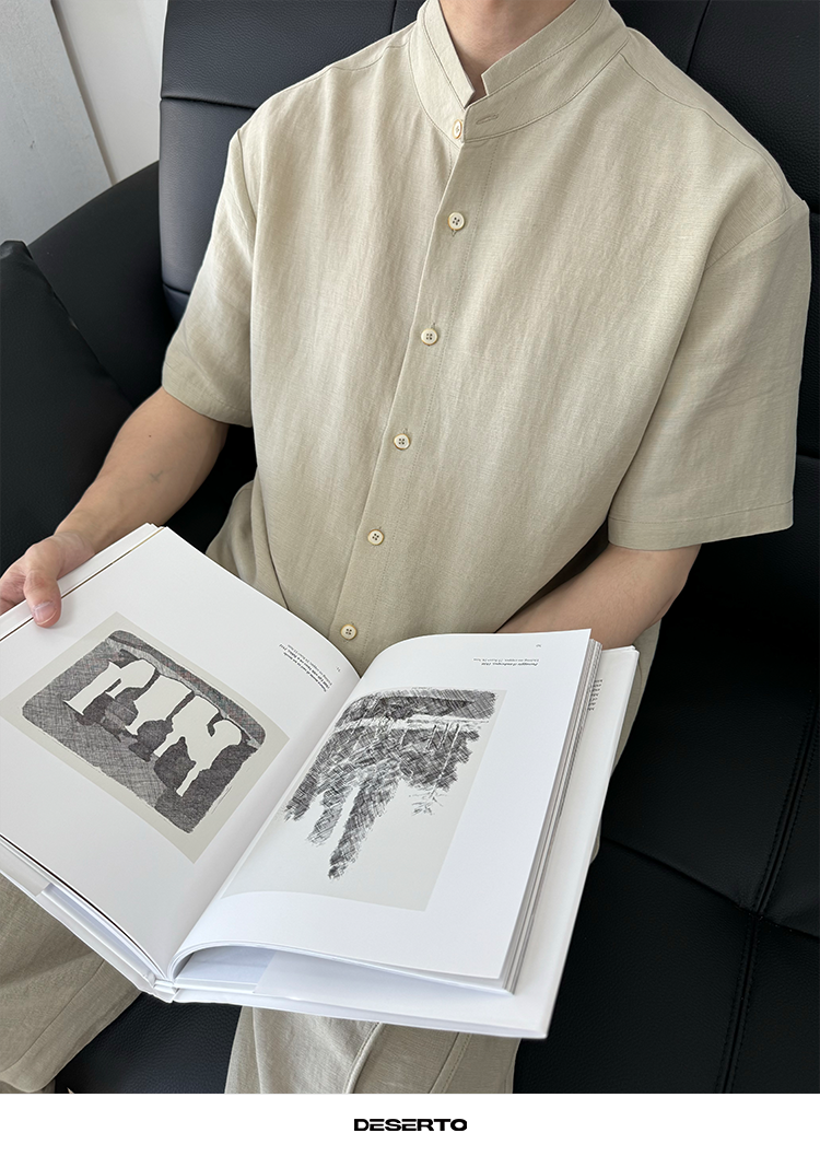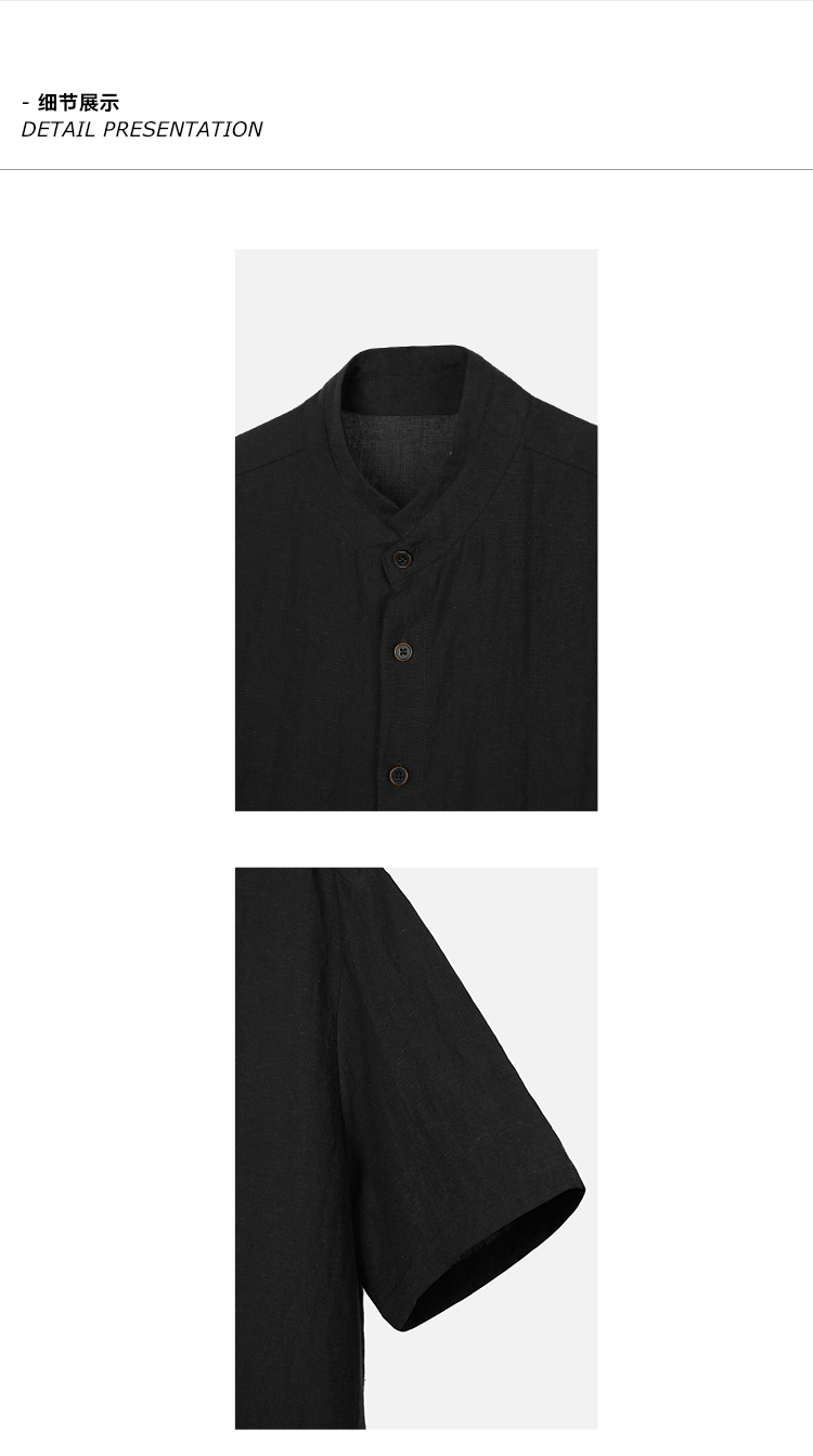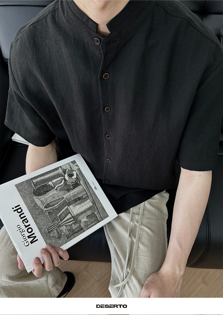 Deserto Linen Sand-Washed Wrinkled Texture New Chinese Style Stand-Up Collar Casual Workwear Short-Sleeved Shirt with Fire-Fruit Buttons