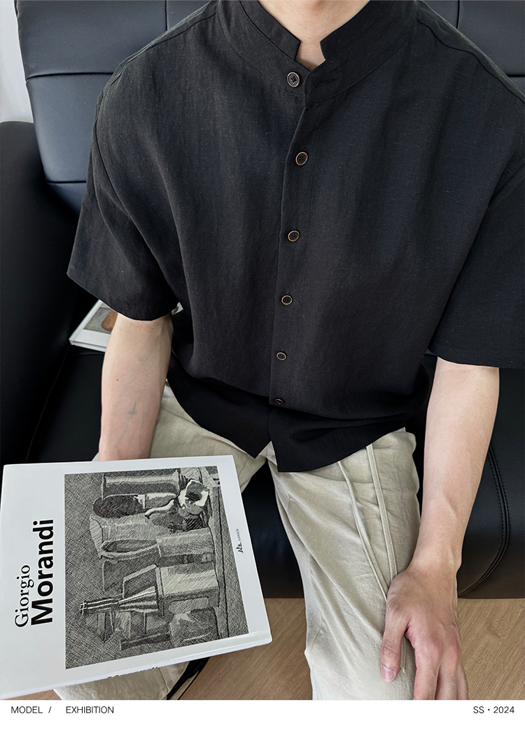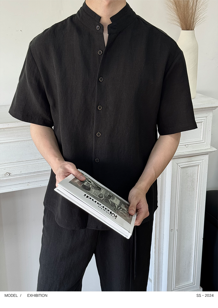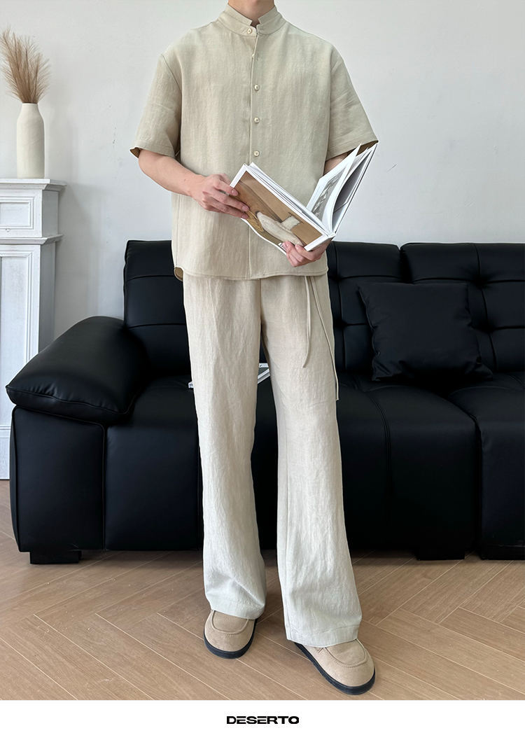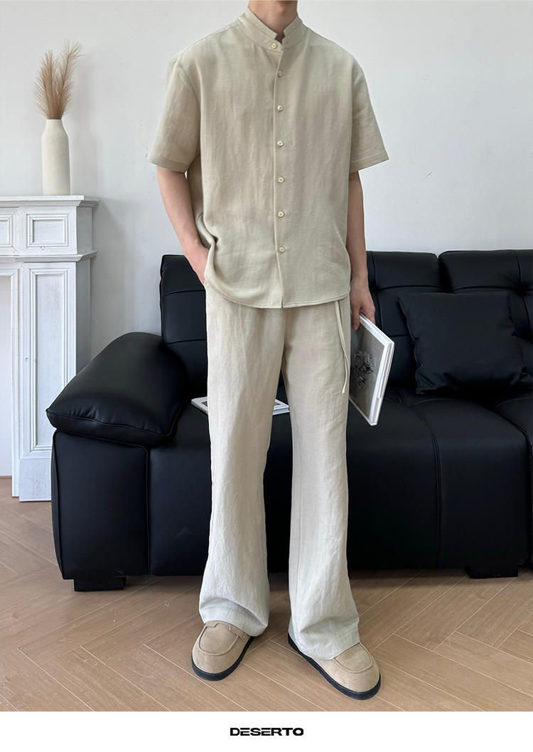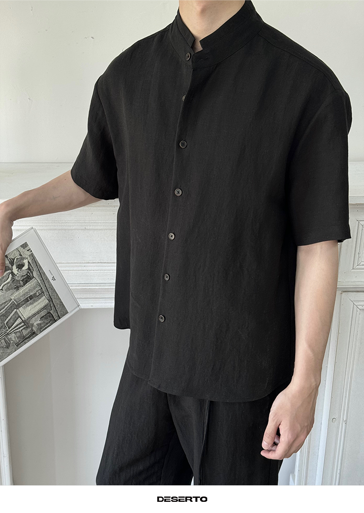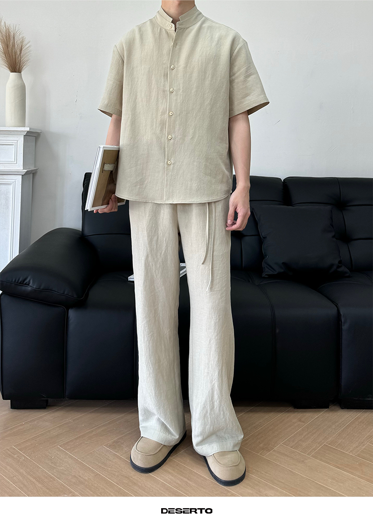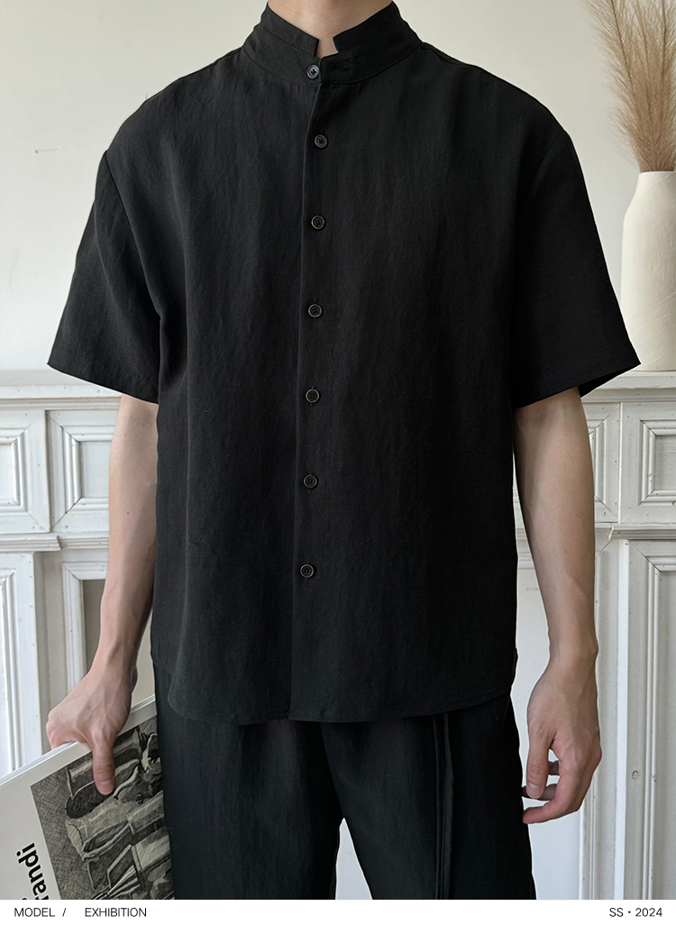 Deserto Linen Sand-Washed Wrinkled Texture New Chinese Style Stand-Up Collar Casual Workwear Short-Sleeved Shirt with Fire-Fruit Buttons