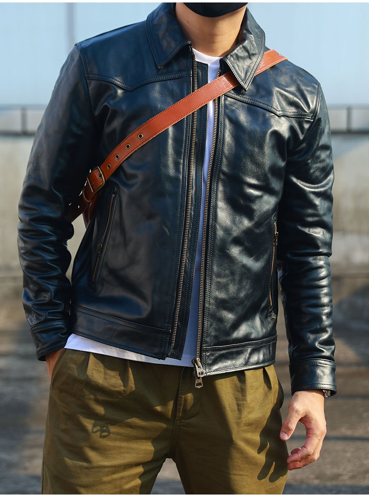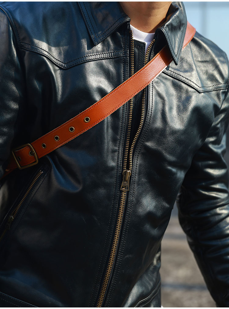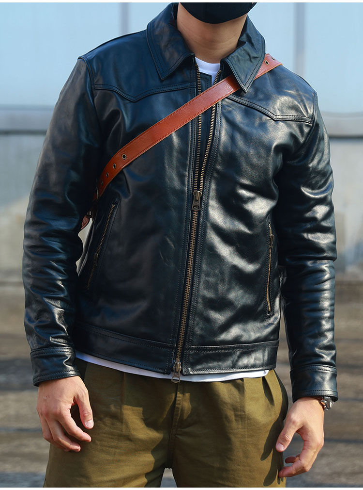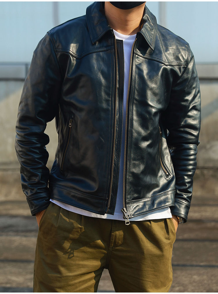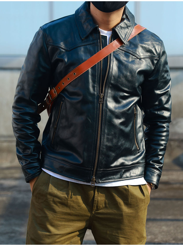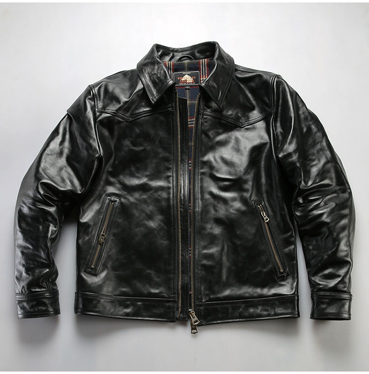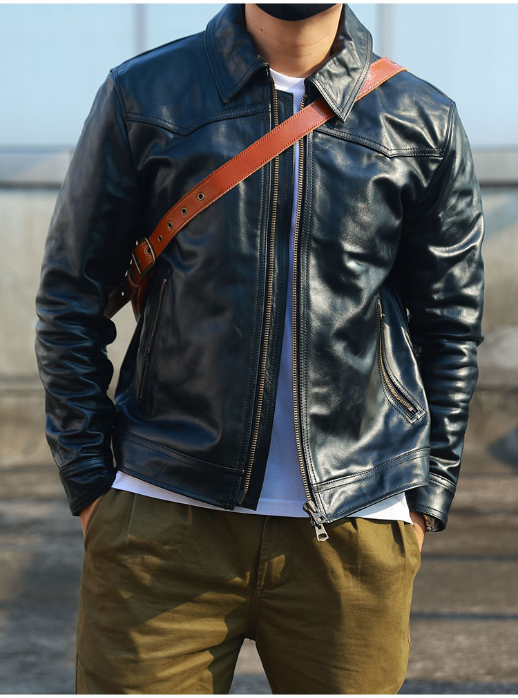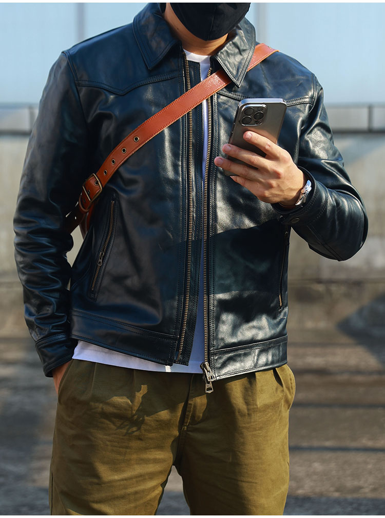 Retro Rrl 1.2mm Oil Wax Tea Core Horse Leather Lapel Slim Short Motorcycle Leather Jacket Men's Genuine Leather Jacket