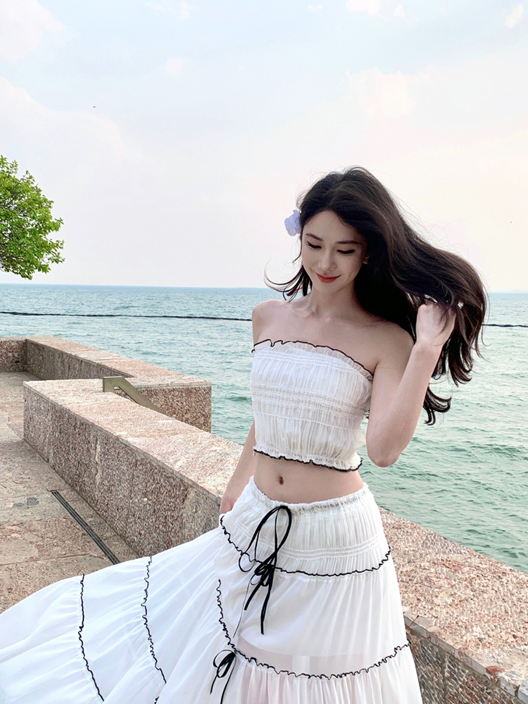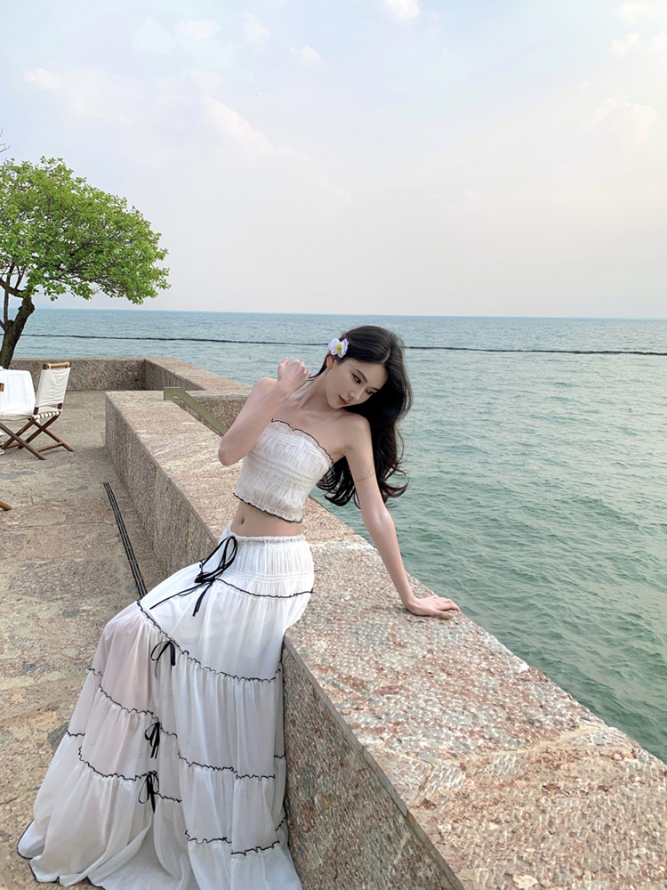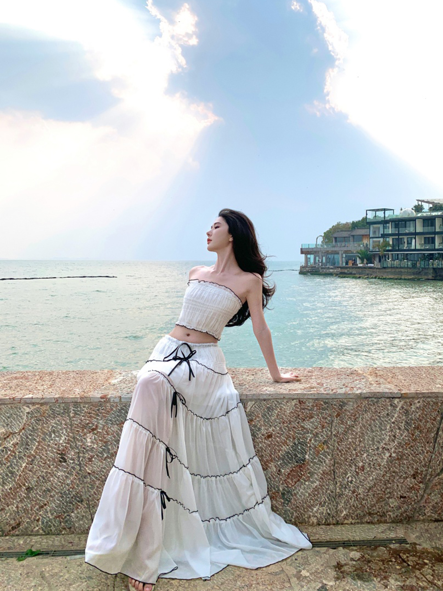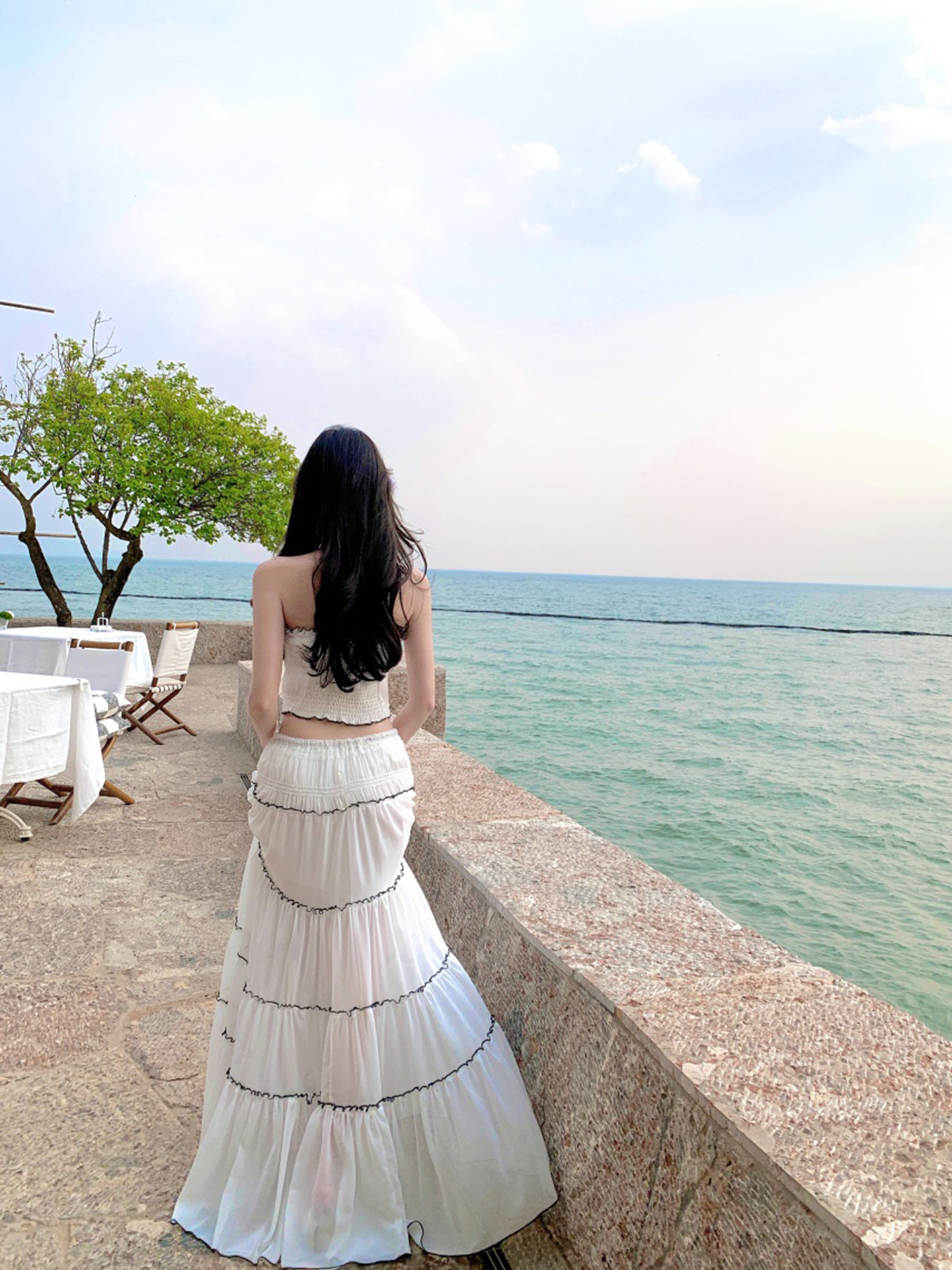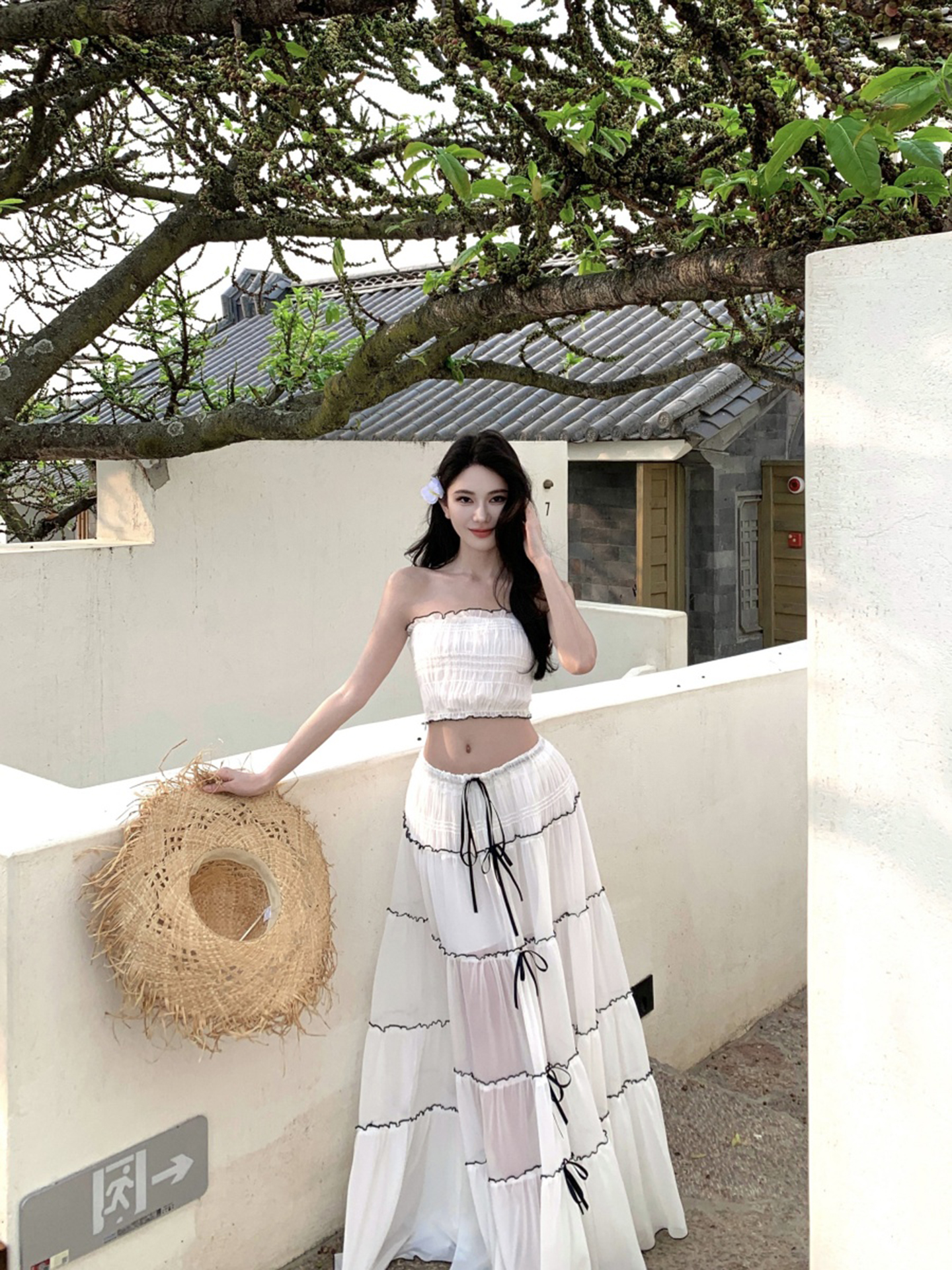 Thai Beach Vacation Outfit for Women, Pure and Sexy Backless Halter Top with See-Through Skirt Two-Piece Dress Set