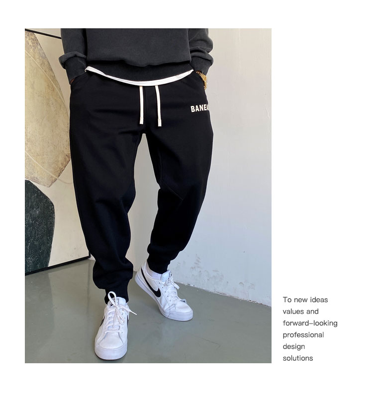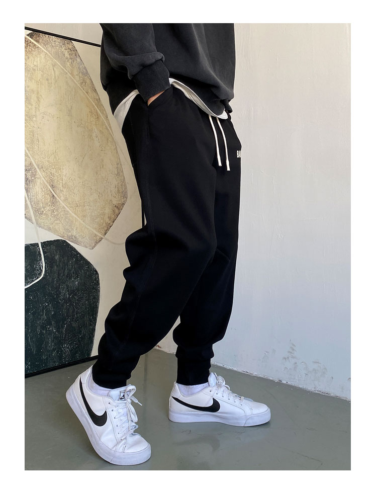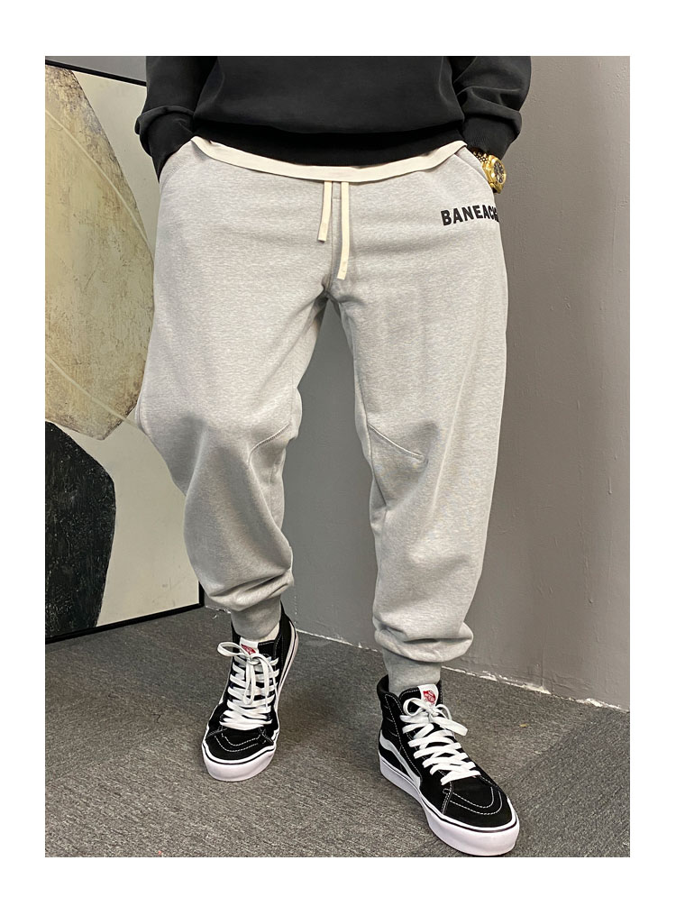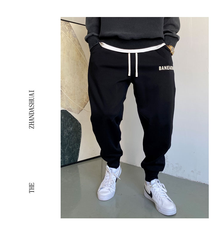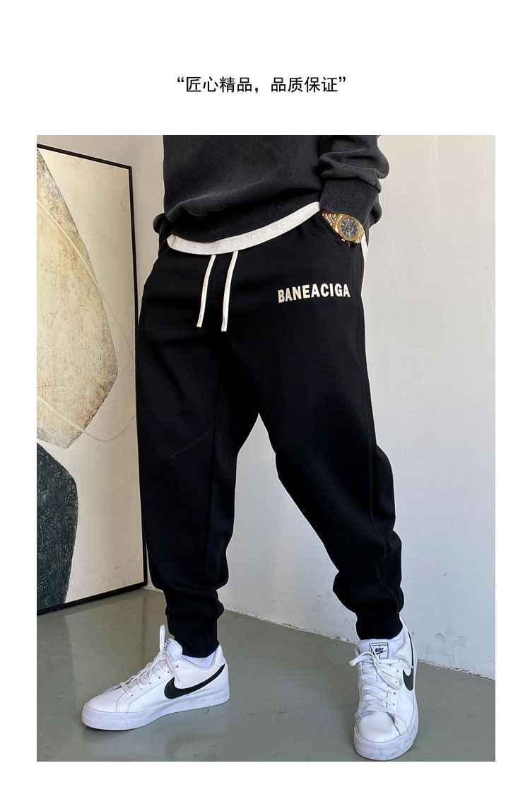 Autumn and Winter American Casual High-End Black Fleece-Lined Knit Sweatpants for Men, Loose Jogger Pants, Trendy Sports Long Pants
