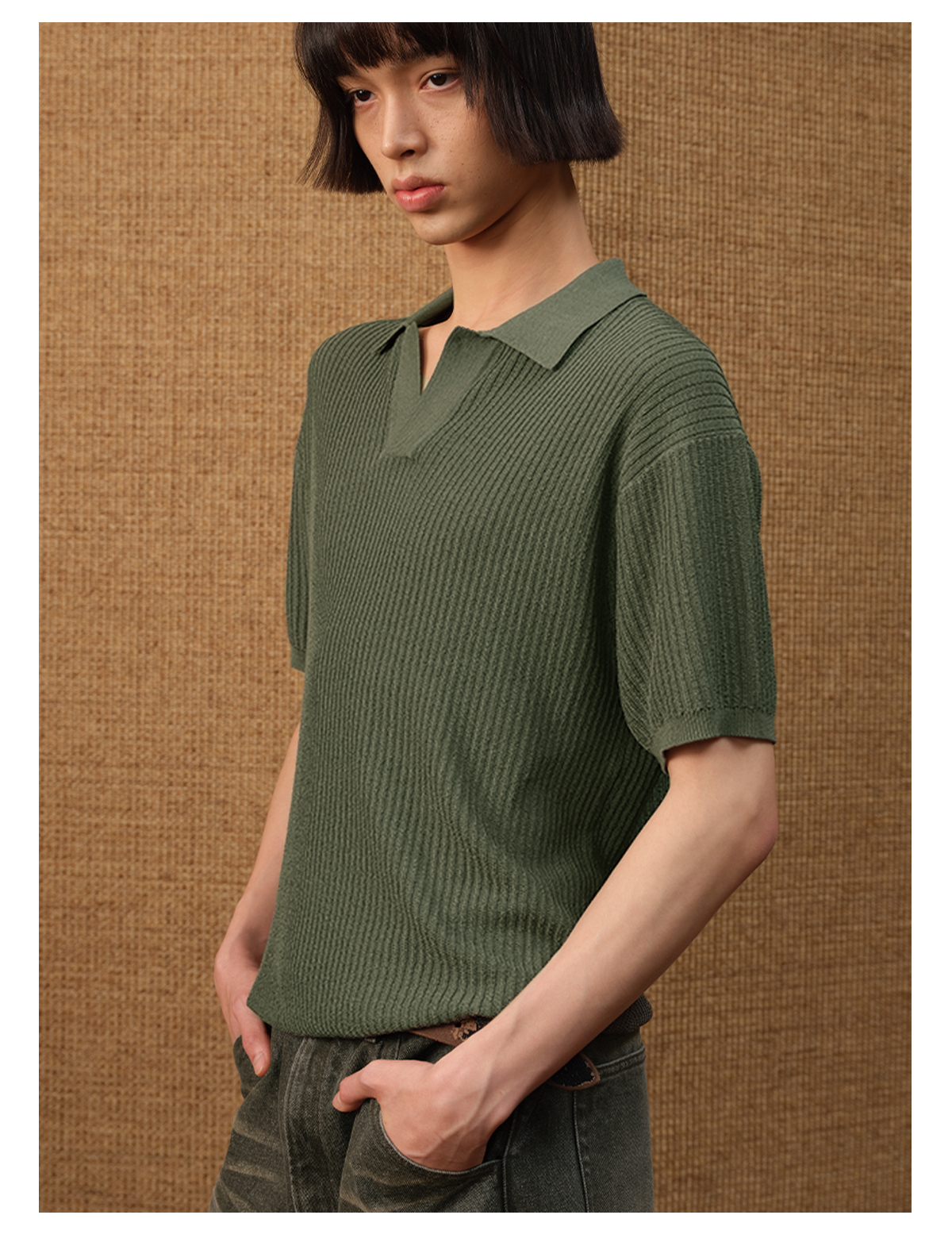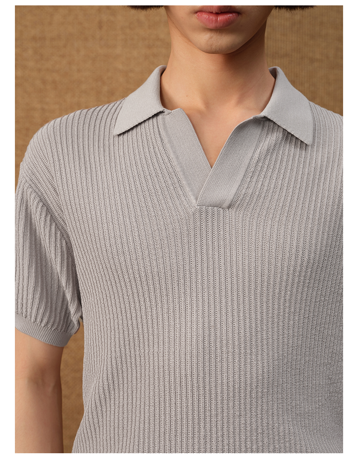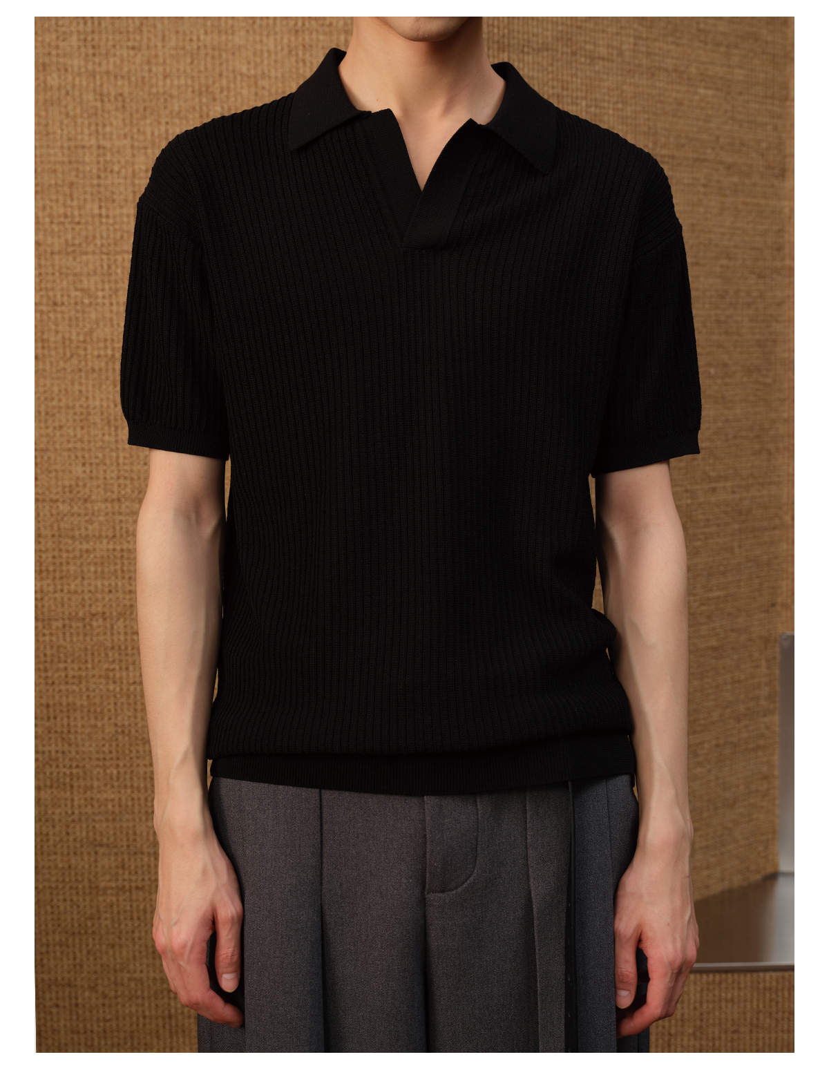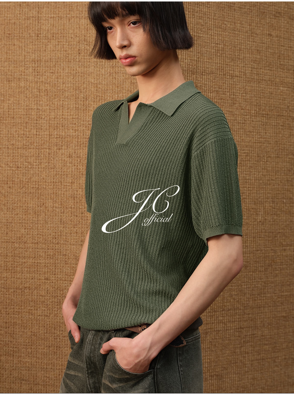 Jcaesar Tee Polo Collar Ice Silk Knit Short-Sleeve Vertical Stripe Texture Fitted Slim Fit Ribbed Hem and Cuffs
