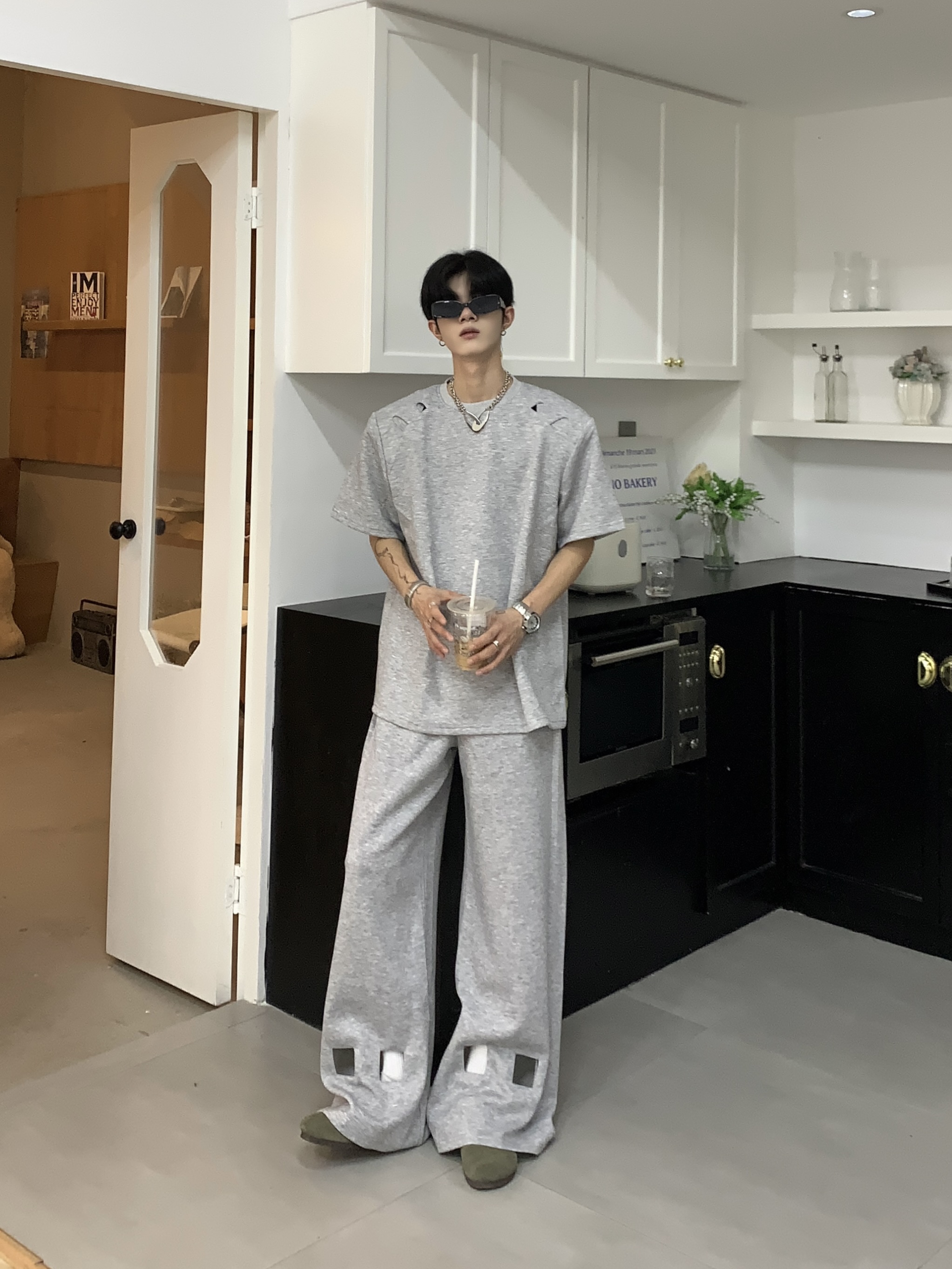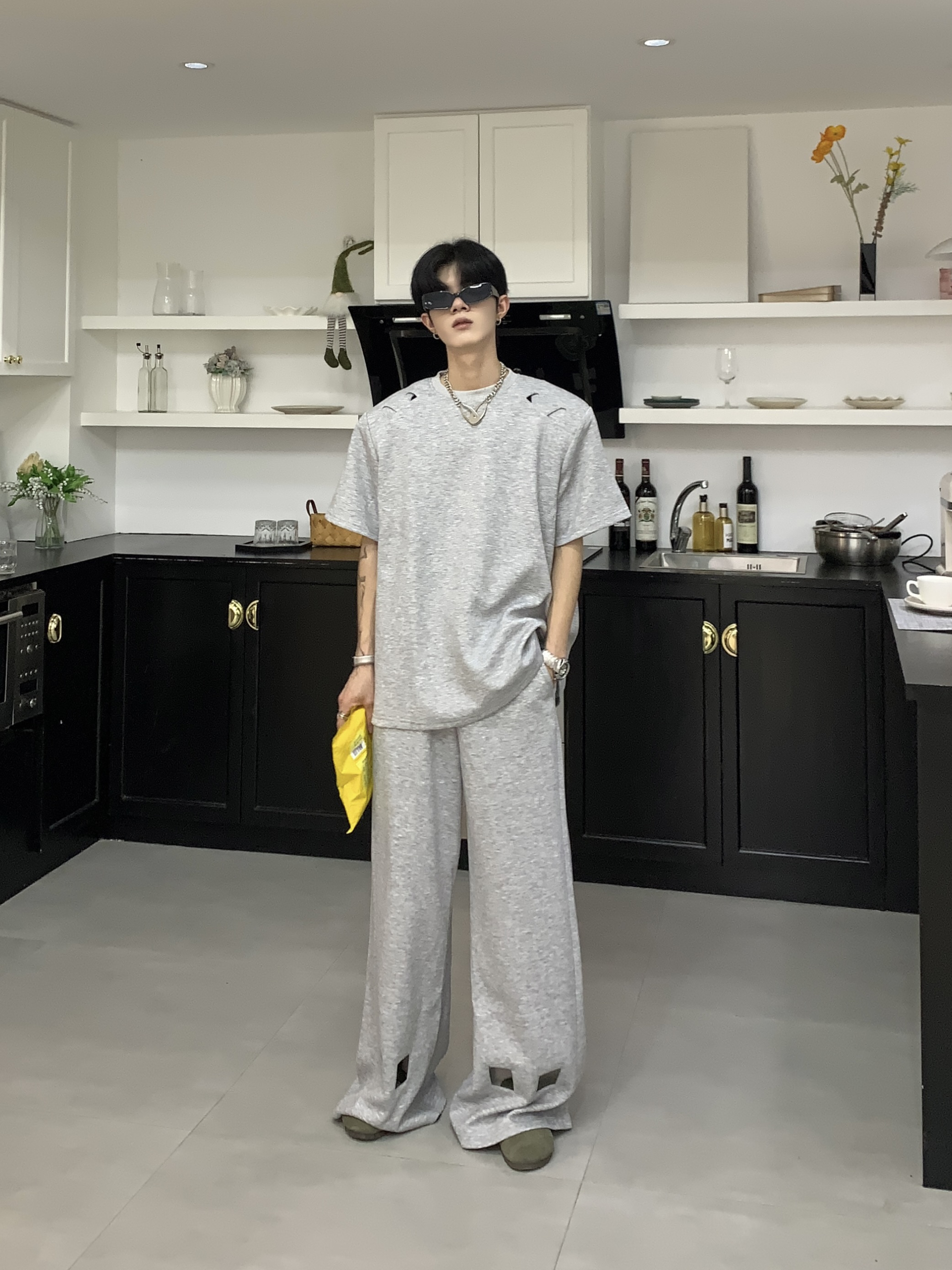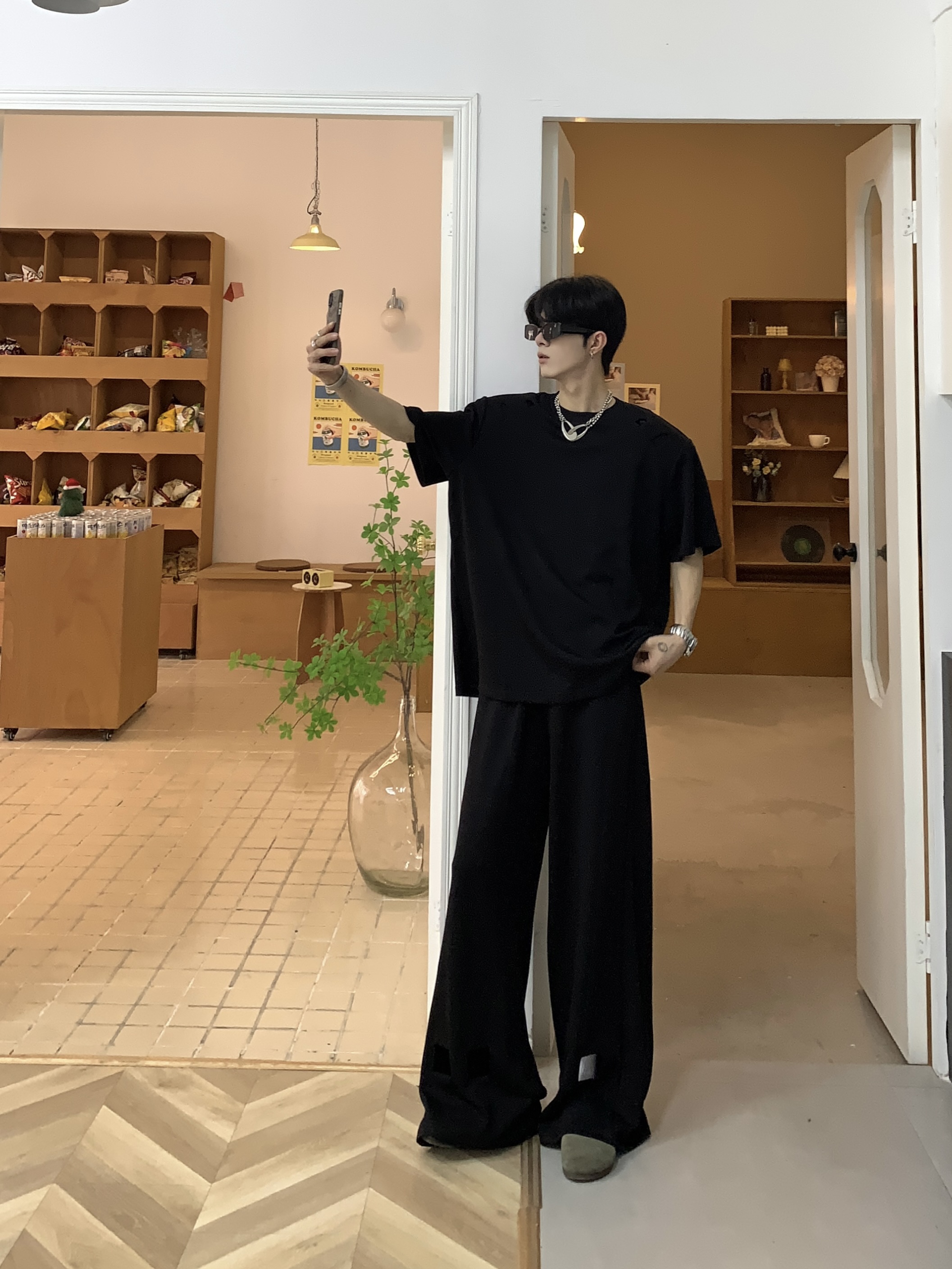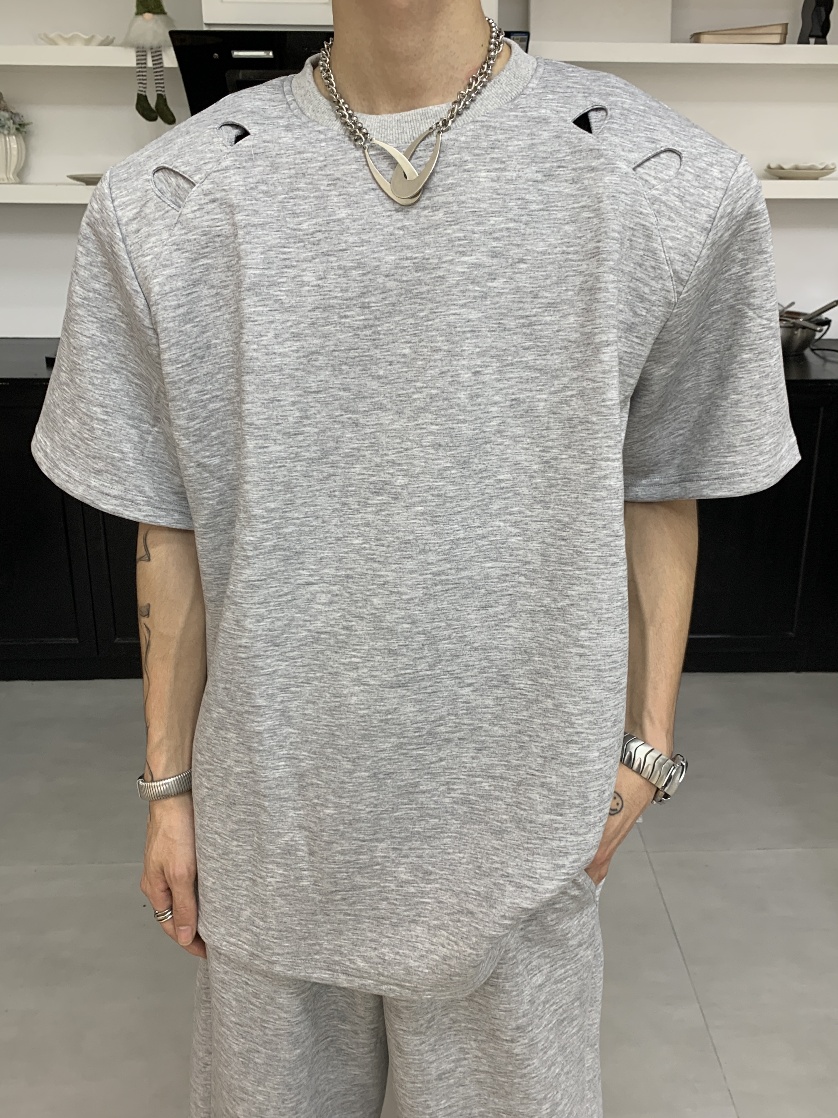 Med's Uncle's Korean-Style Fashionable Casual Sports Suit with Distressed Design, Men's Summer Design with Shoulder Pads, Short-Sleeved T-Shirt, Trendy