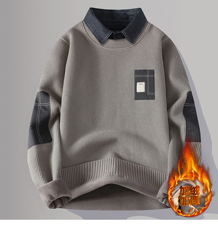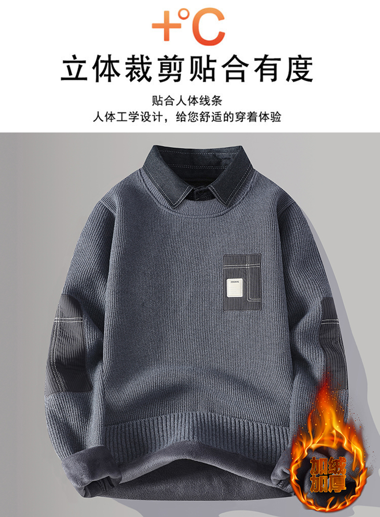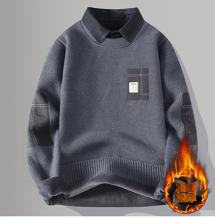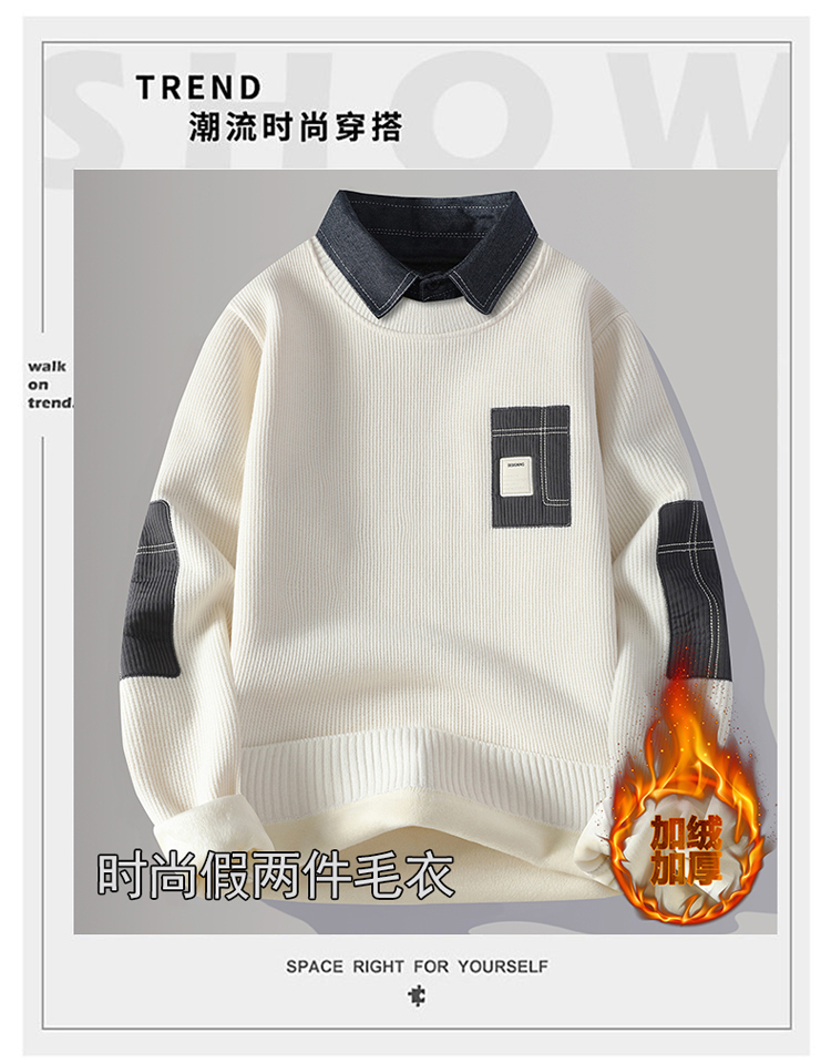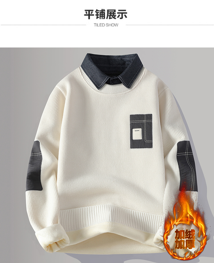 Playboy One-Piece Fleece Sweater for Men, Autumn and Winter, Youth Color-Blocking Fake Two-Piece Casual Warm Shirt Collar Knitwear