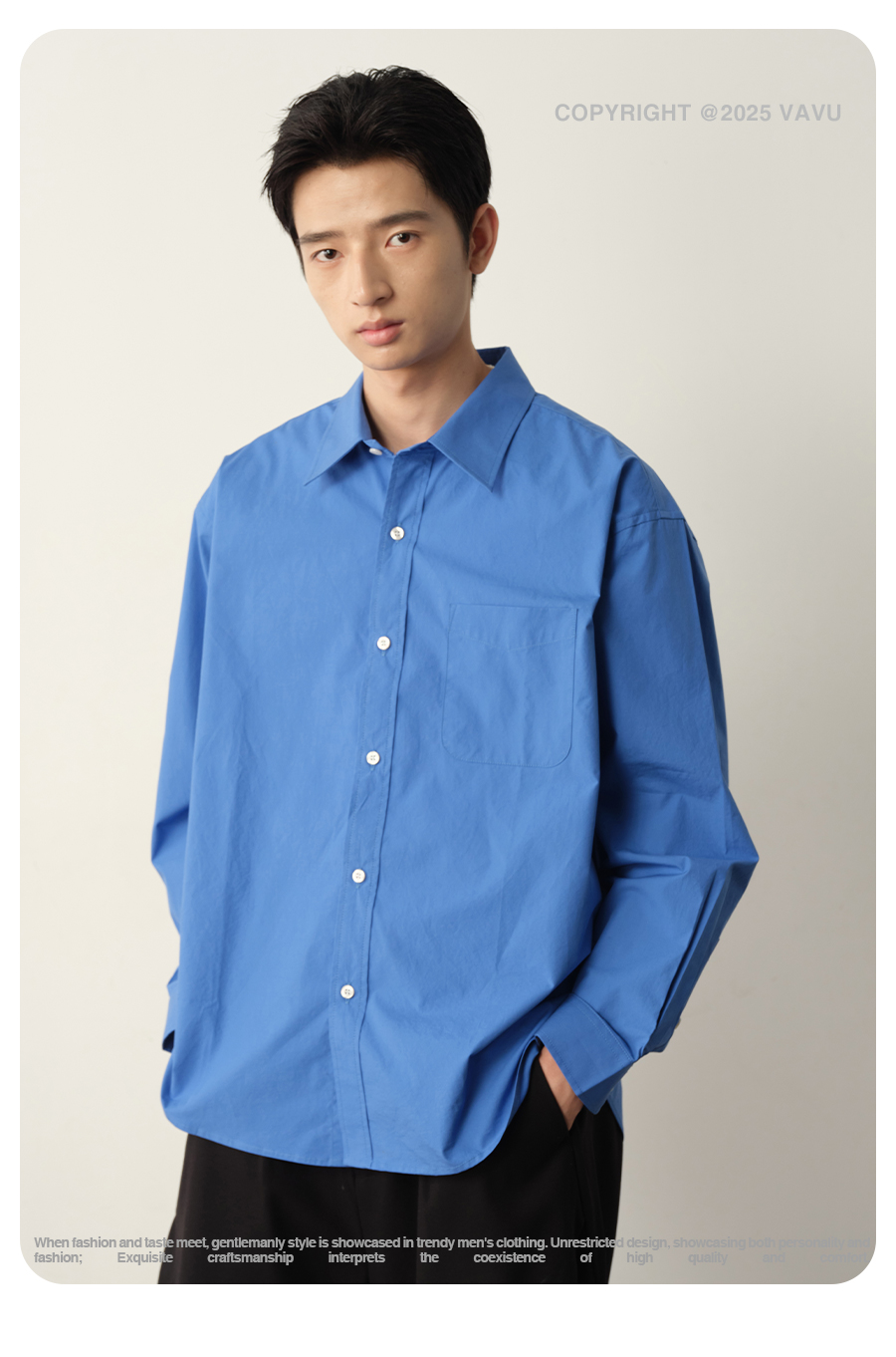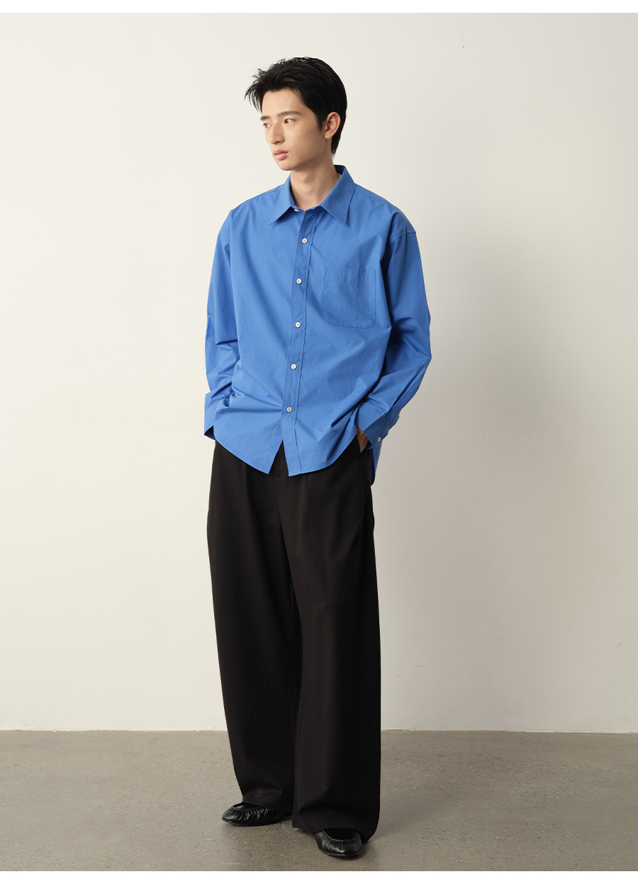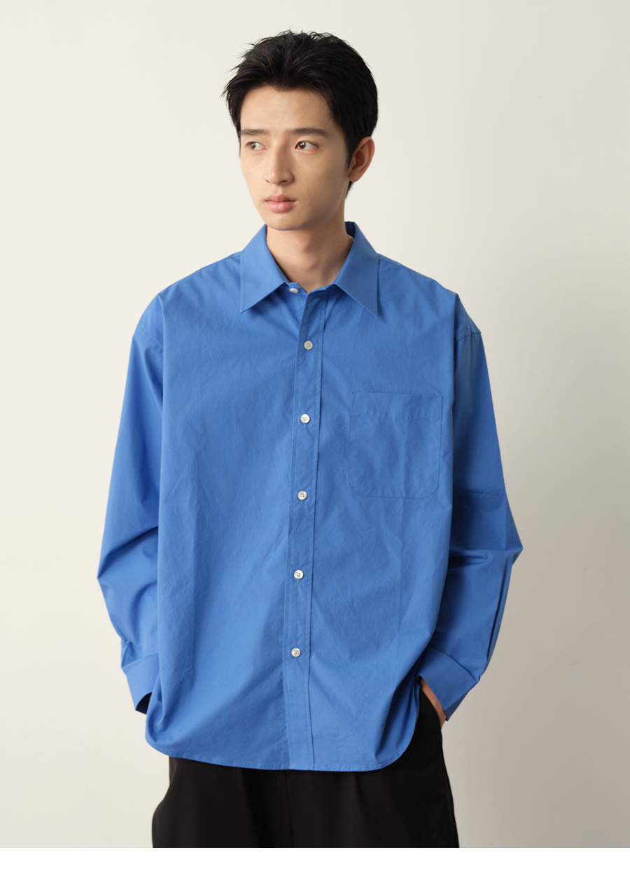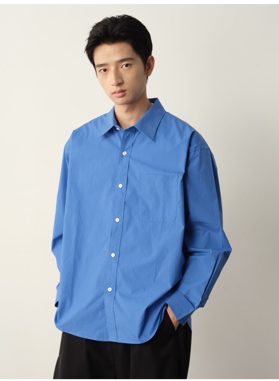 Vavu Pure Cotton Sax Blue Carbon Washed Long-Sleeve Shirt with Patch Pocket, Casual, Relaxed, Simple and Versatile Shirt